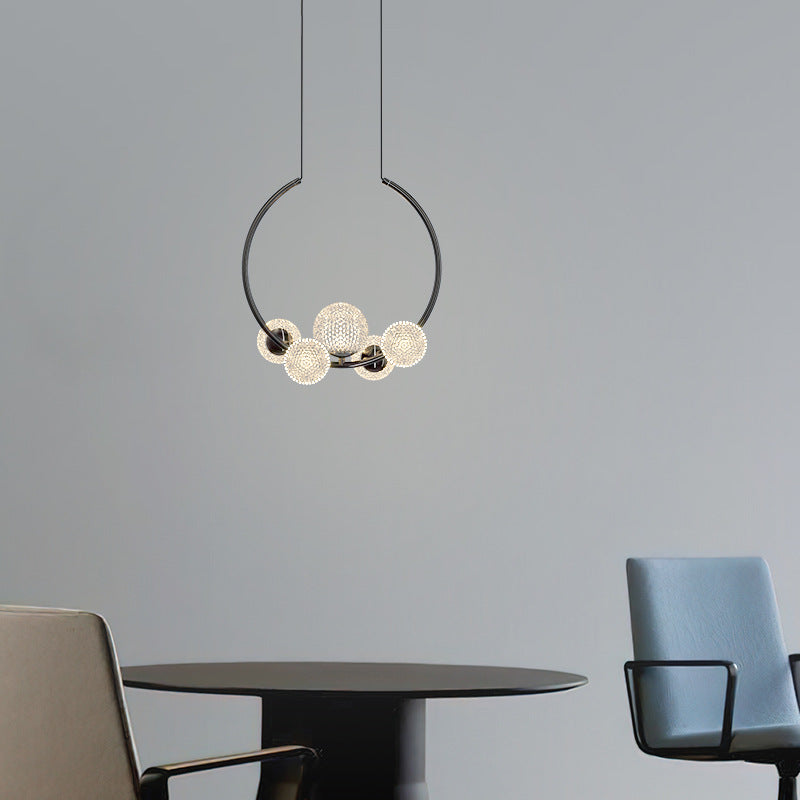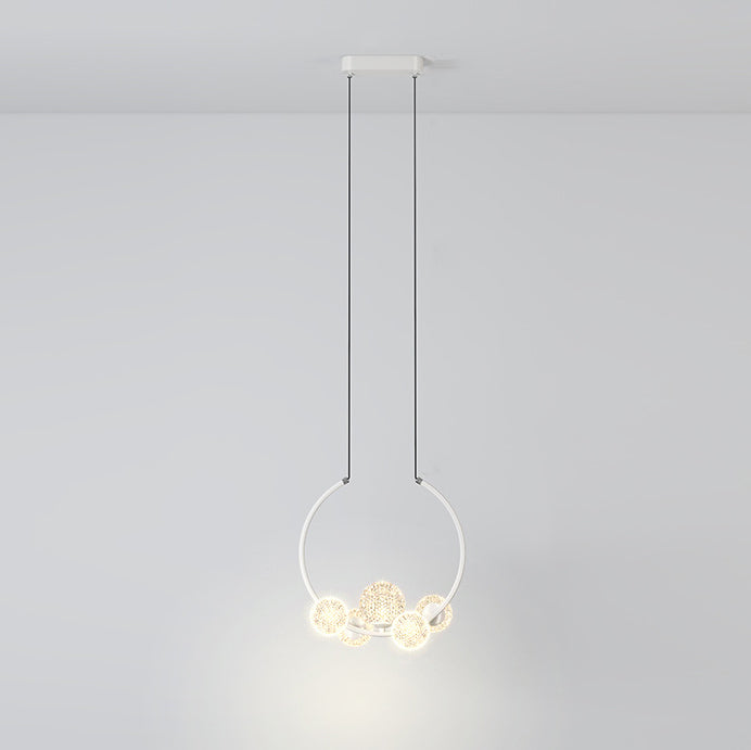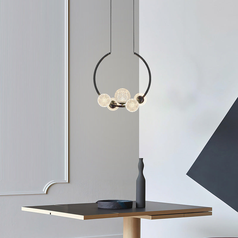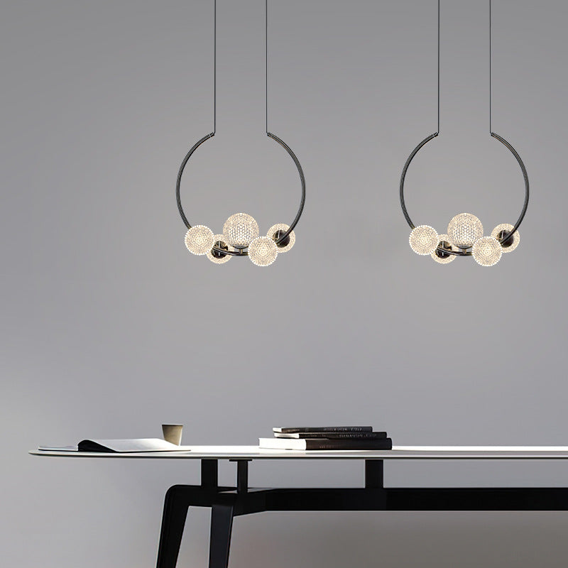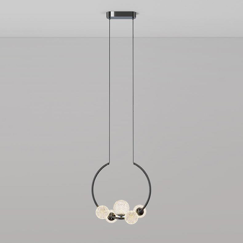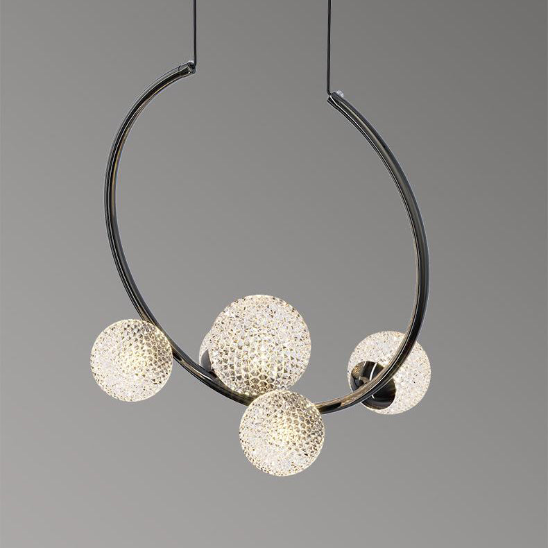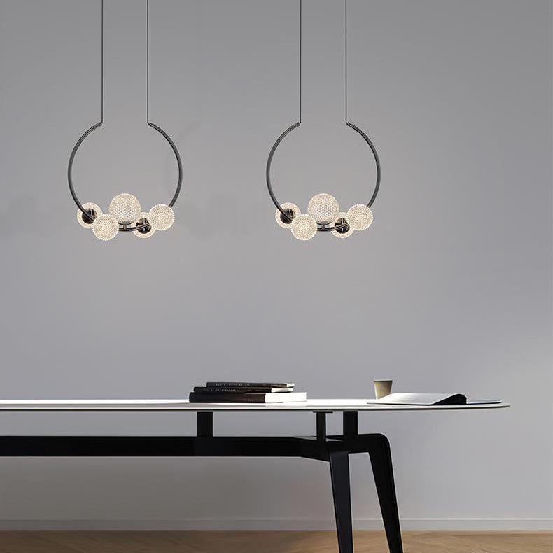 現代的なスカンジナビアの丸い球状のアクリルランプシェード、アルミニウムと鉄製の5灯ペンダントライト、ダイニングルーム用