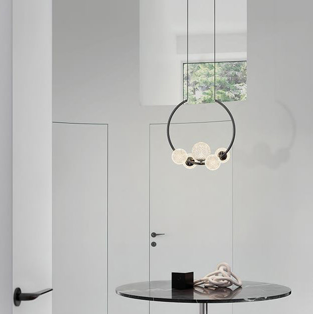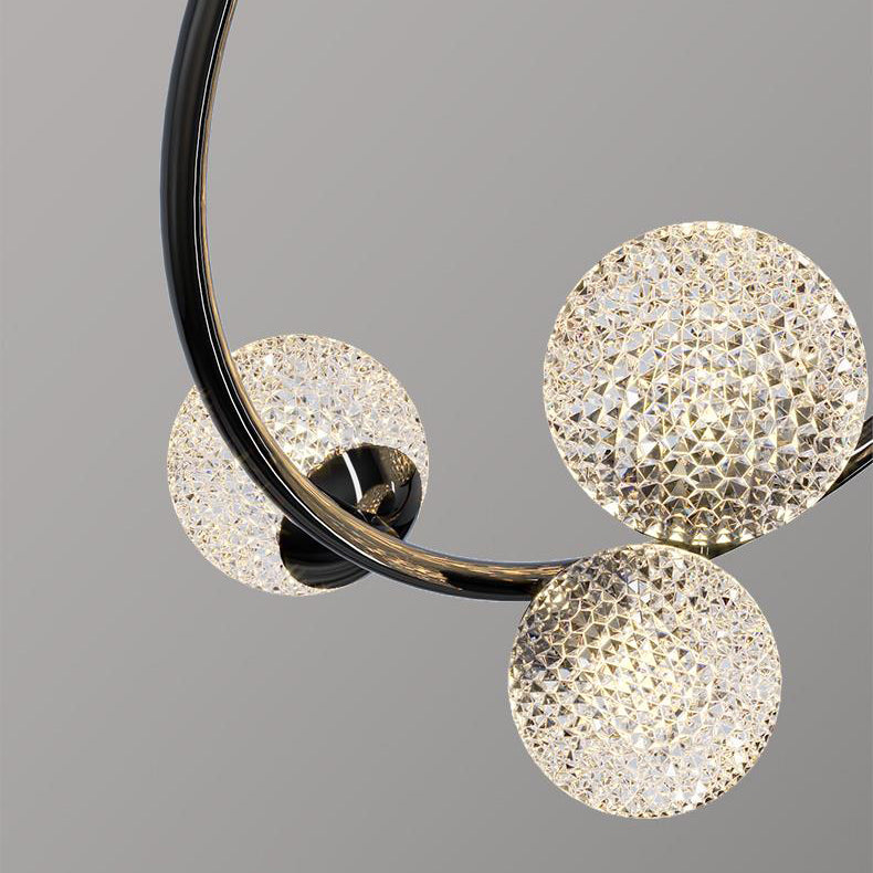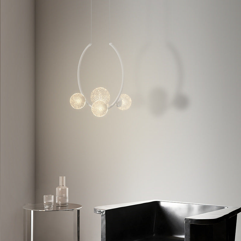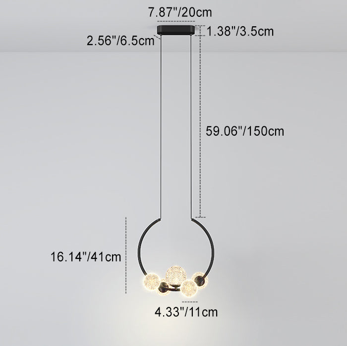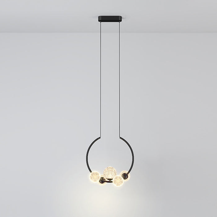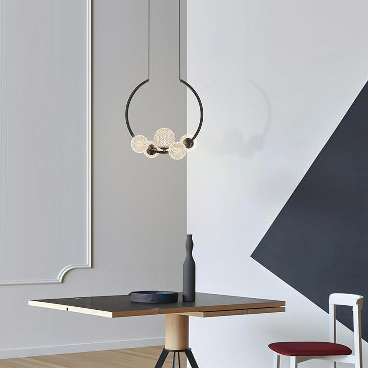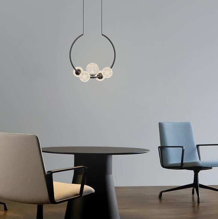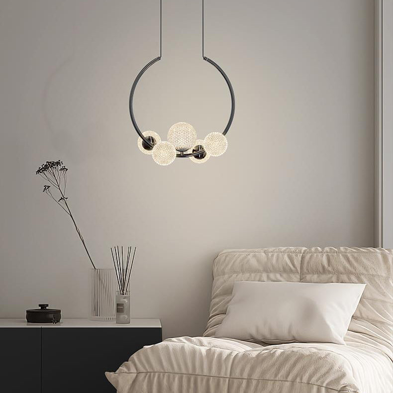 現代的なスカンジナビアの丸い球状のアクリルランプシェード、アルミニウムと鉄製の5灯ペンダントライト、ダイニングルーム用