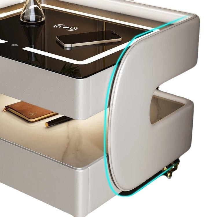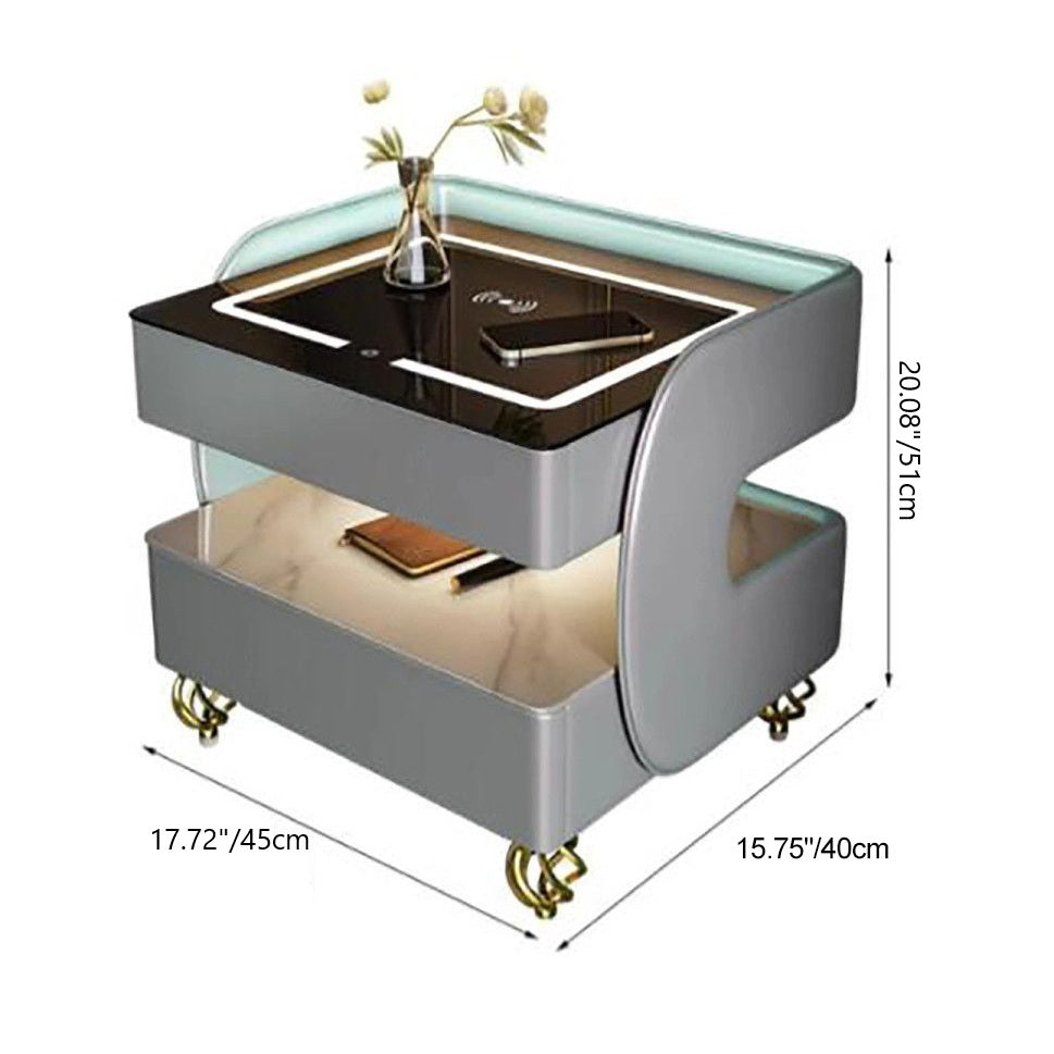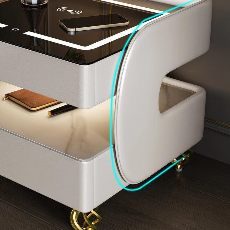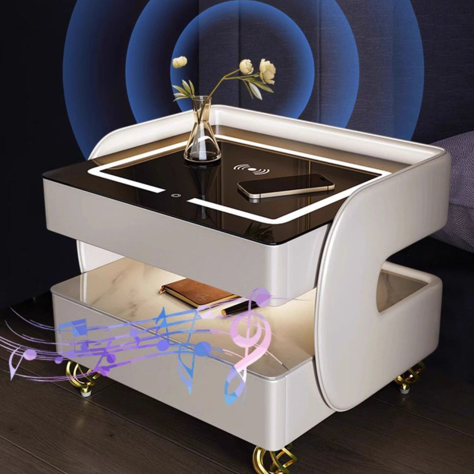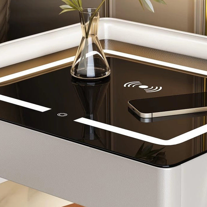 This contemporary Scandinavian nightstand combines sintered stone, tempered glass, metal, and wood in a sleek square design. Featuring 2-tier storage, wireless charging, and heat-resistant surfaces, it's an easy-to-clean, multifunctional solution for modern bedrooms—available in black or white.