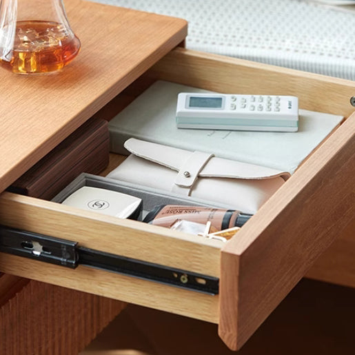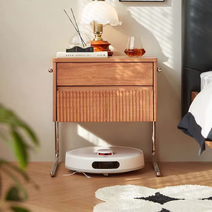 Crafted from solid wood and stainless steel, this Scandinavian-style nightstand features a striped rectangular design in natural wood tones. With two spacious drawers and an elevated base for easy cleaning, it blends minimalist aesthetics with everyday functionality—perfect for modern bedrooms.
