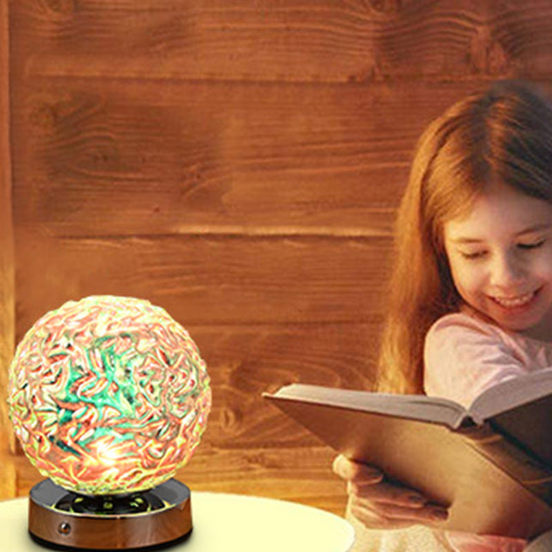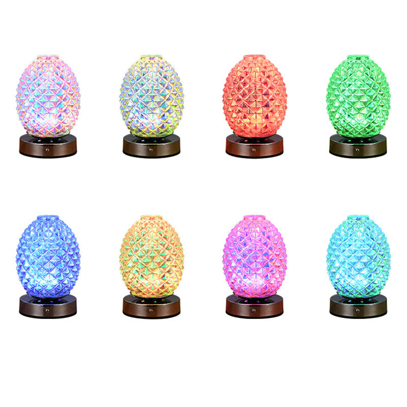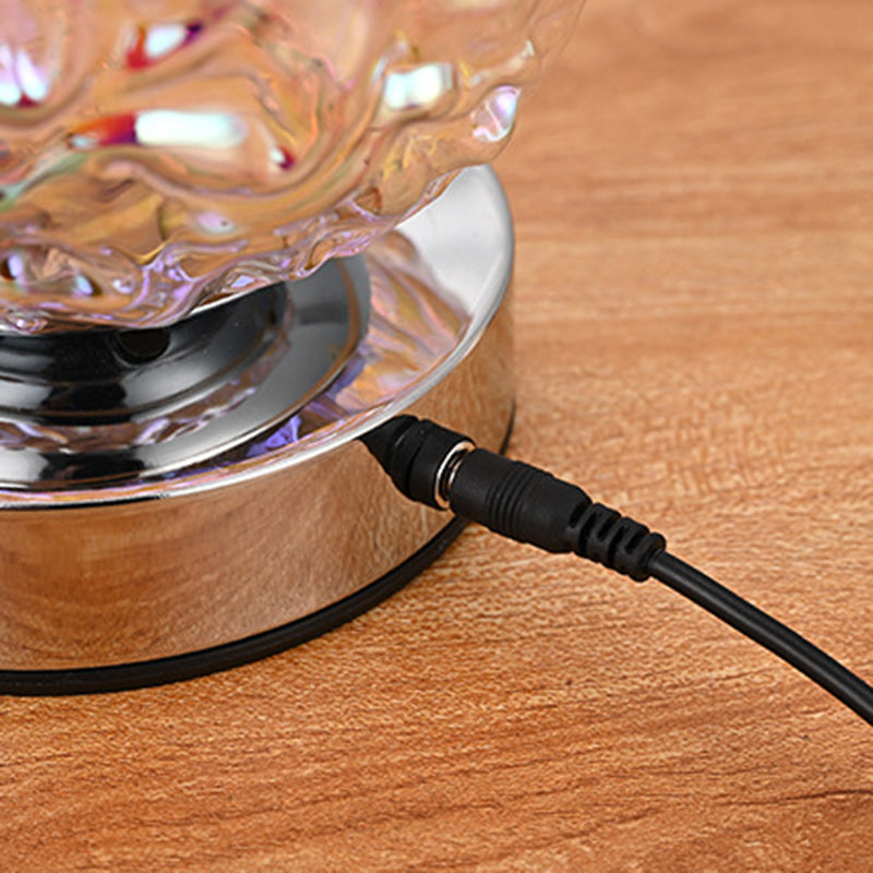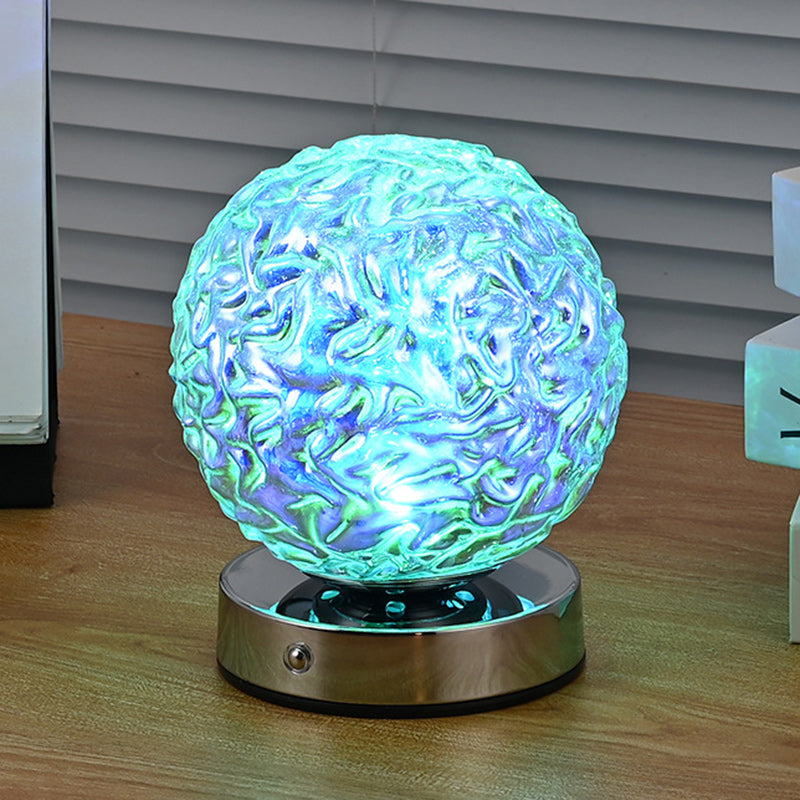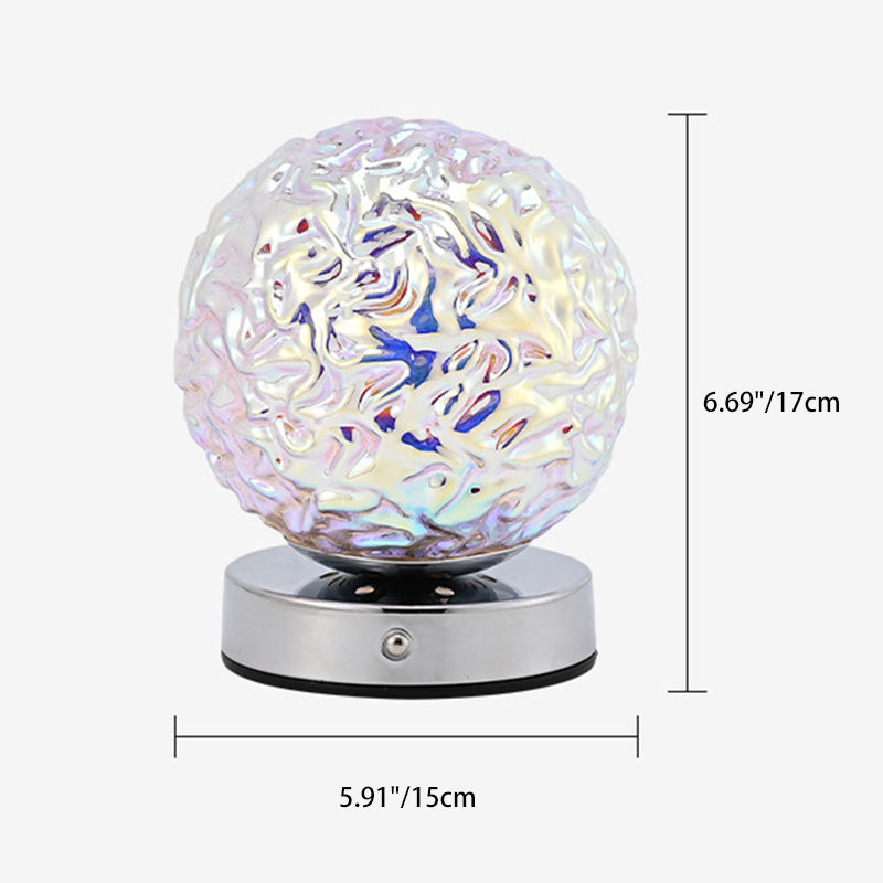 Illuminate your bedroom with this USB rechargeable LED table lamp, crafted from silver-finished glass and metal with a 3D spherical silhouette, pineapple-inspired texture, and ripple surface design. Its multicolor glow creates a relaxing ambiance ideal for nightstands or decorative use.
