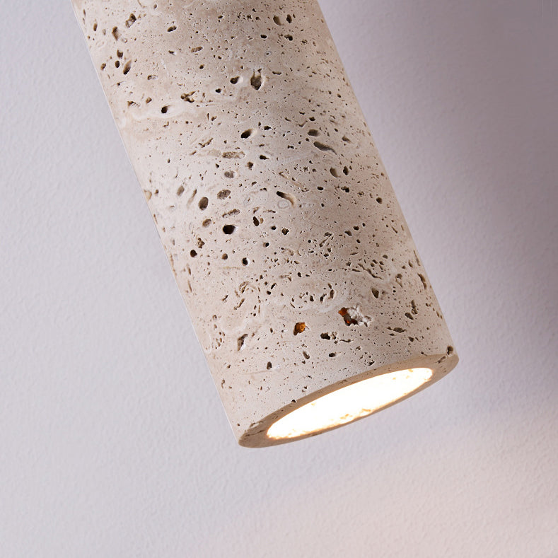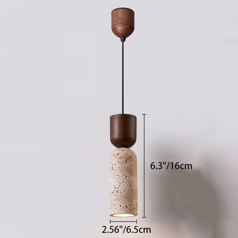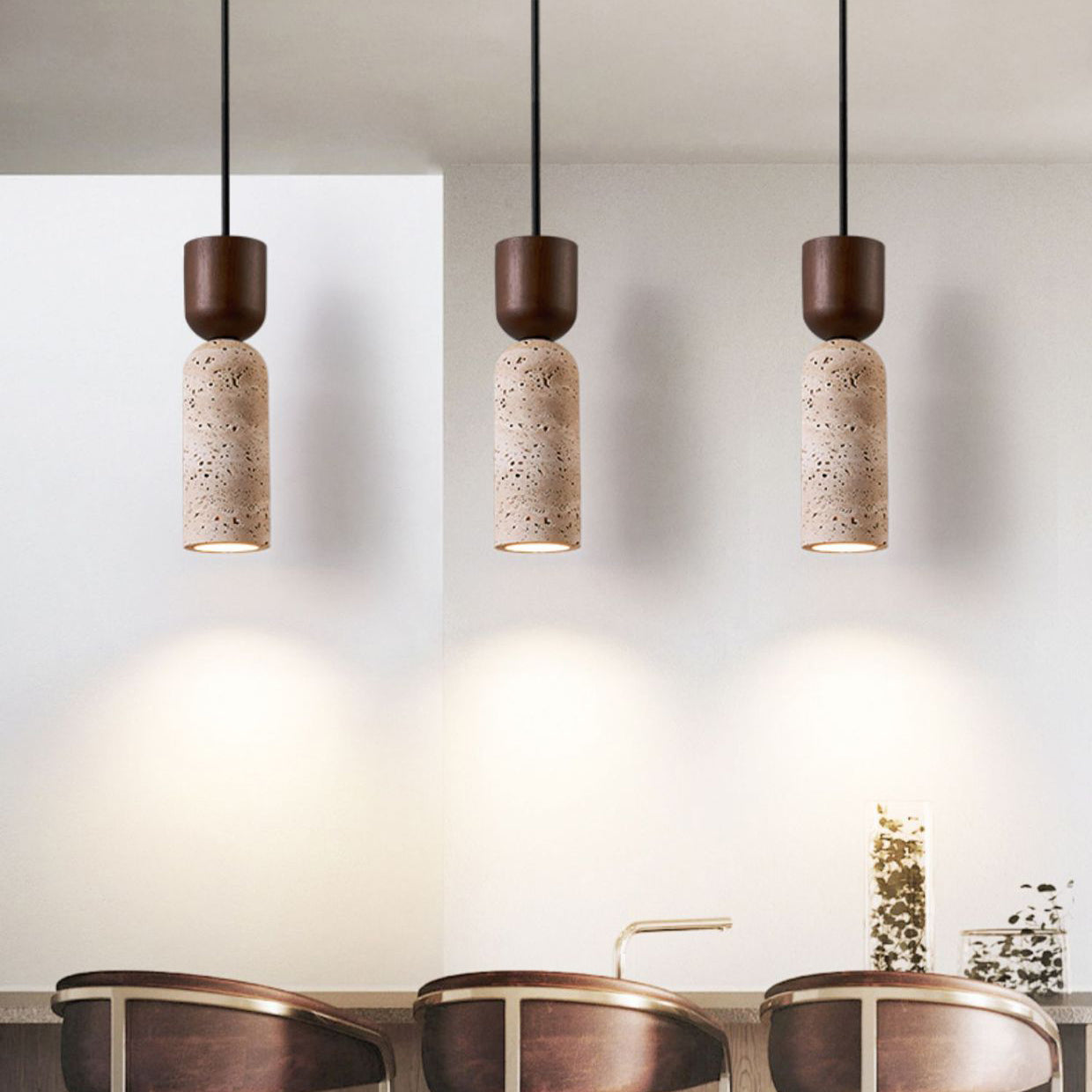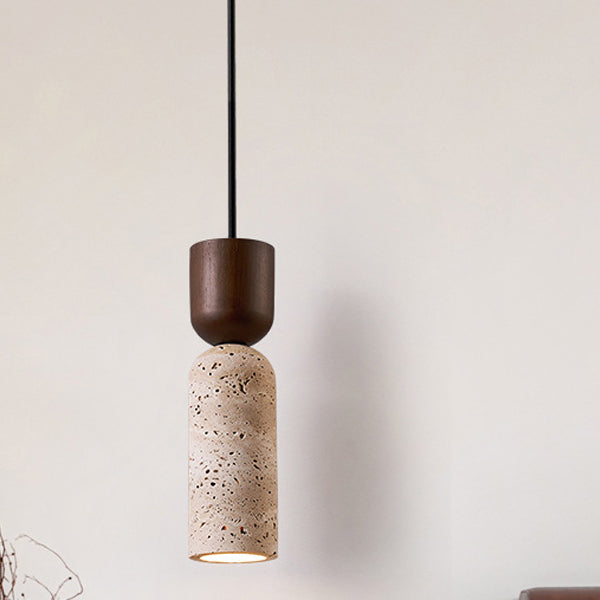 オフホワイトのトラバーチンと無垢材で作られた、モダンなミッドセンチュリースタイルのペンダントライト。ユニークな円筒形の漏斗型が特徴です。調節可能な吊り下げコードと、単一光源からの温かみのある光は、居心地の良い寝室やリビングルームに最適です。
