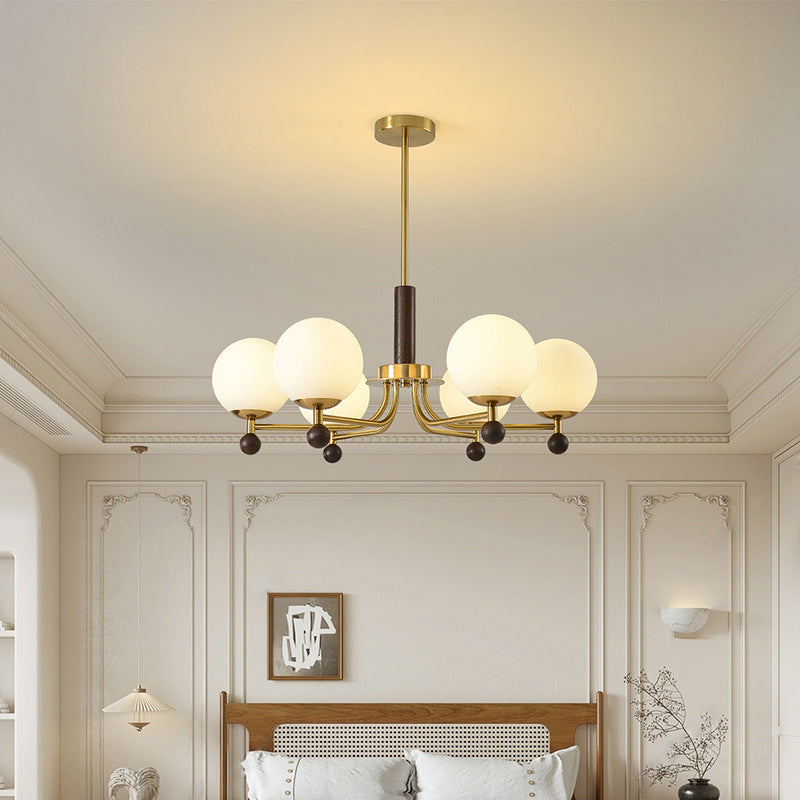 このモダンなミッドセンチュリーシャンデリアは、木、鉄、ガラスを組み合わせた丸いデザインで、ゴールドとウォルナット仕上げが施されています。6灯または8灯のオプションがあり、柔らかな白いガラスシェードが特徴で、均一に拡散する光を提供します。スタイリッシュな温かみとヴィンテージの魅力を求める寝室、リビングルーム、ダイニングルームに最適です。