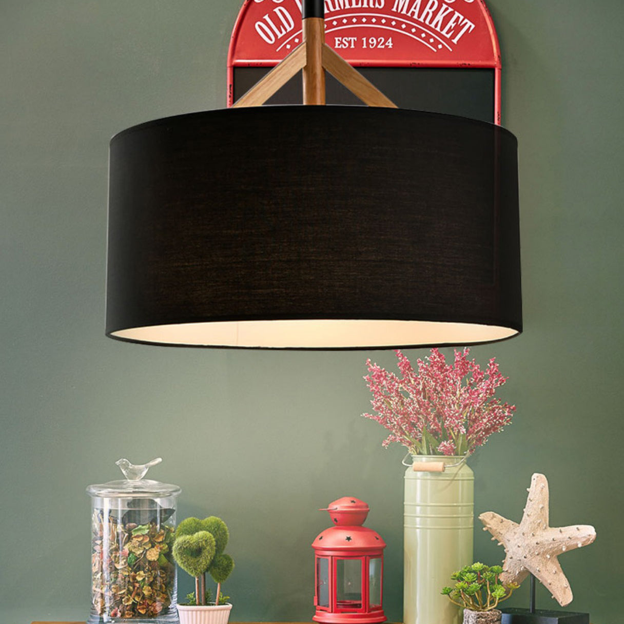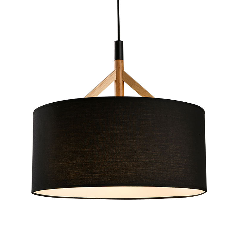 この1灯のモダンなペンダントライトは、ファブリック、木材、金属を組み合わせた洗練された円筒形デザインで、ブラックとホワイトの2色展開です。ミニマルな美しさと柔らかで心地よい光で、寝室やリビングルームに最適です。