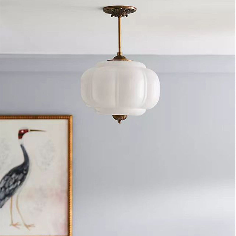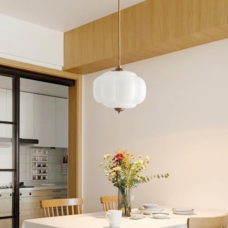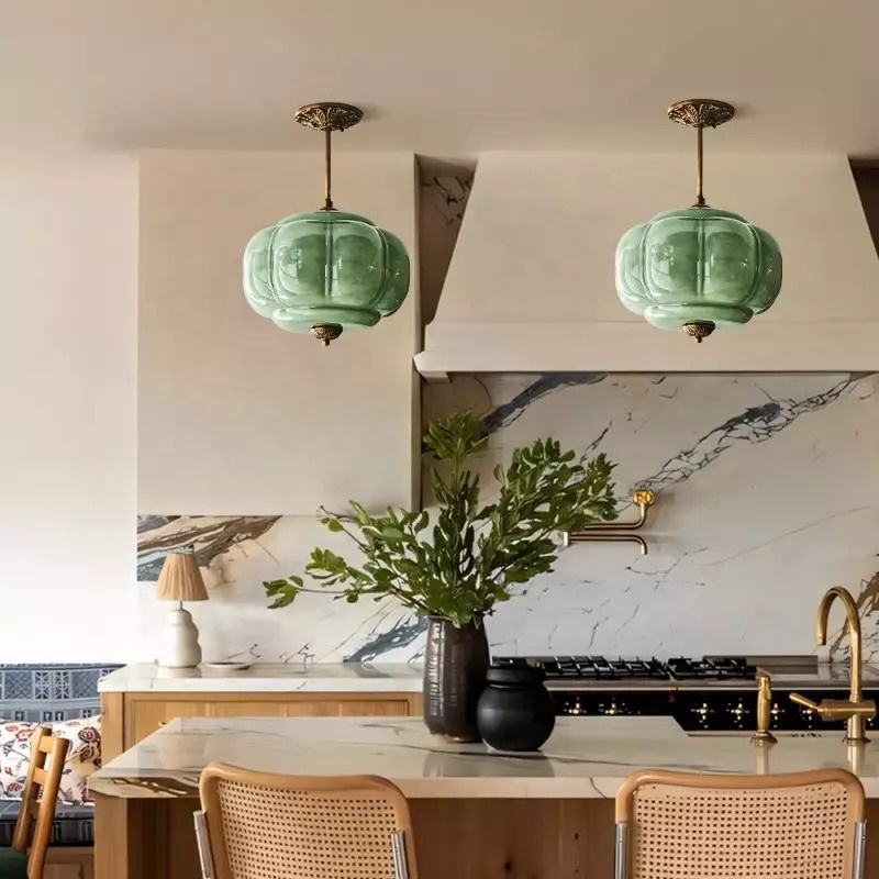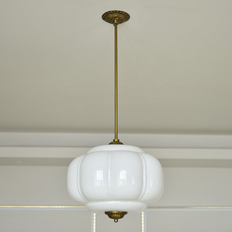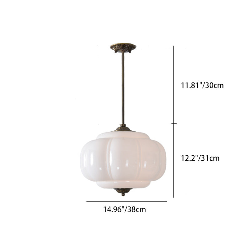ヴィンテージのカボチャ型デザインが特徴の、伝統的なフランス製ペンダントライト。銅とガラスを使用し、エレガントなホワイトとグリーンのトーンで仕上げられています。リビングルームに最適なこのペンダントライトは、温かみのある光と3灯式で、魅力と耐久性の理想的な融合を実現しています。