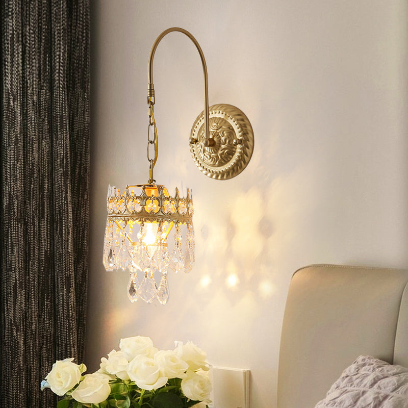 伝統的なフランスの王冠型円筒形鉄クリスタル1灯壁掛けスコーンランプ(寝室用)