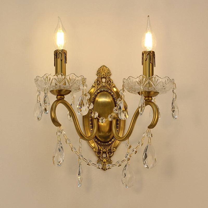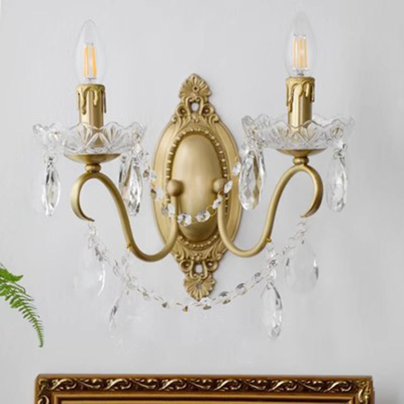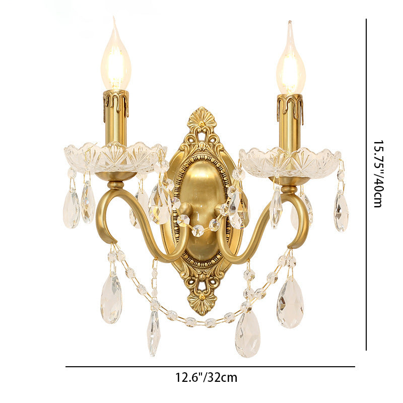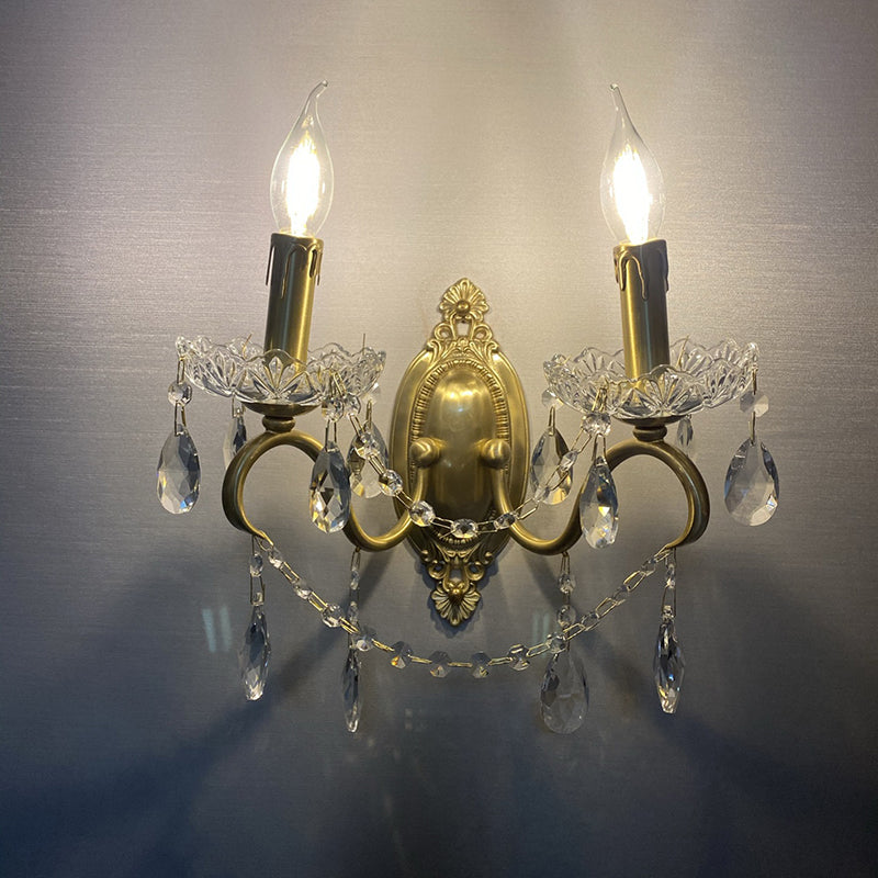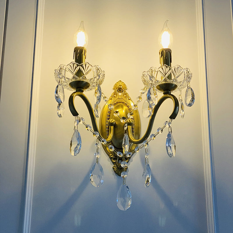 伝統的なフランスの曲線ポール燭台、彫刻された真鍮クリスタル2灯壁取り付け用燭台、リビングルーム用