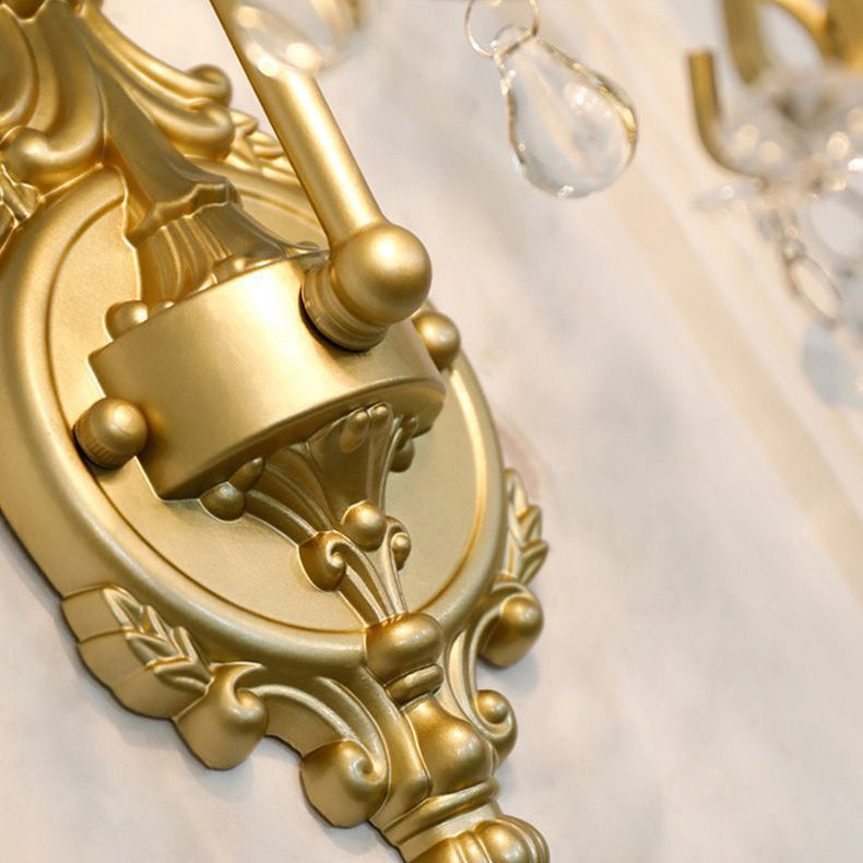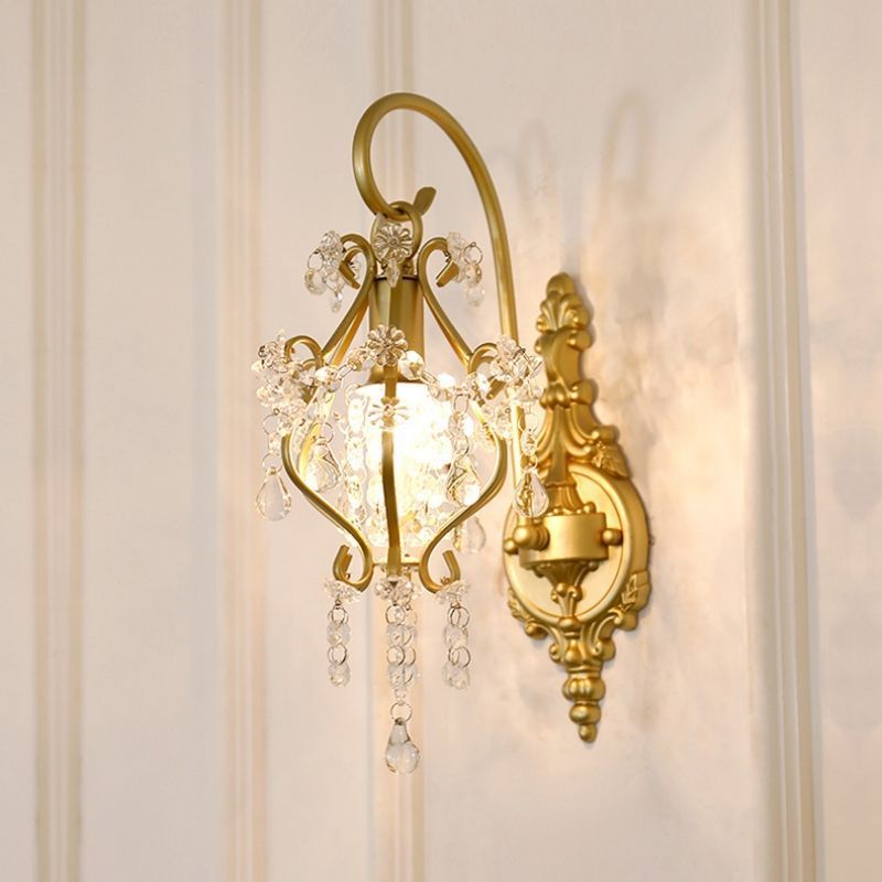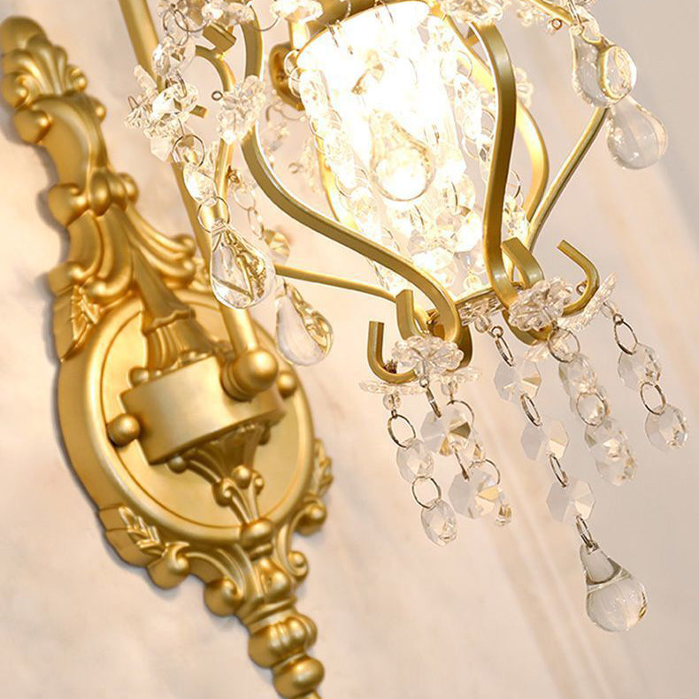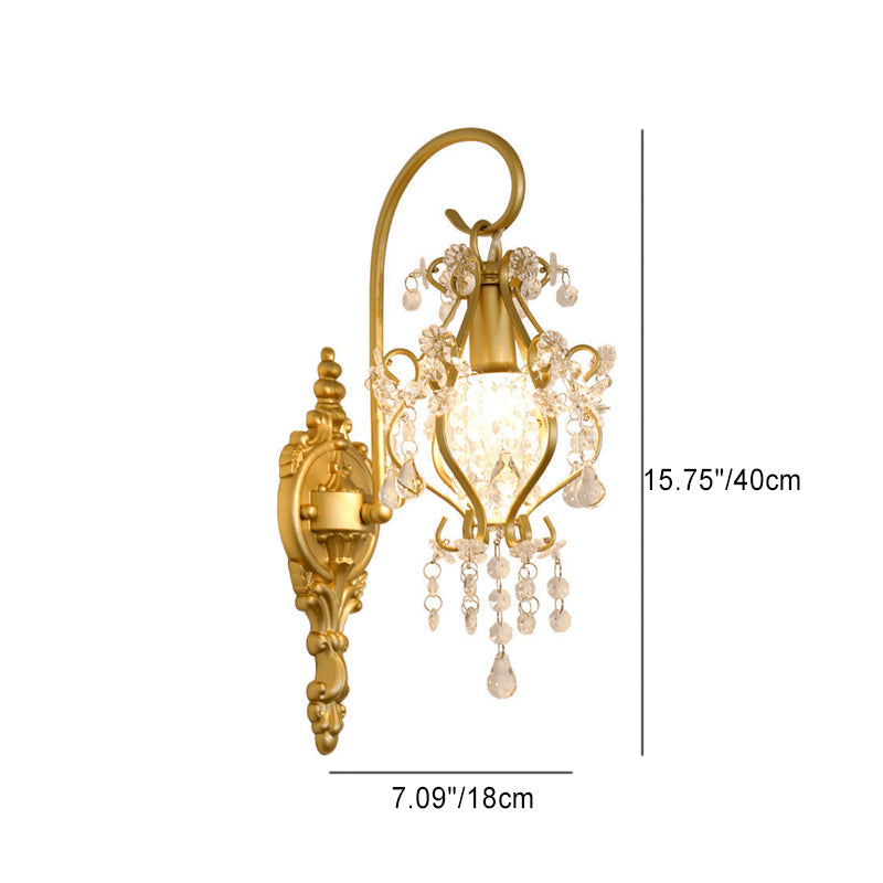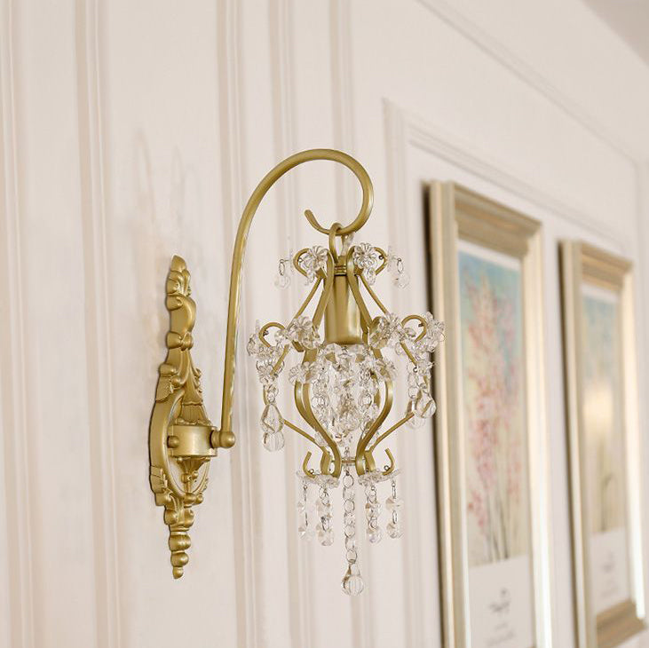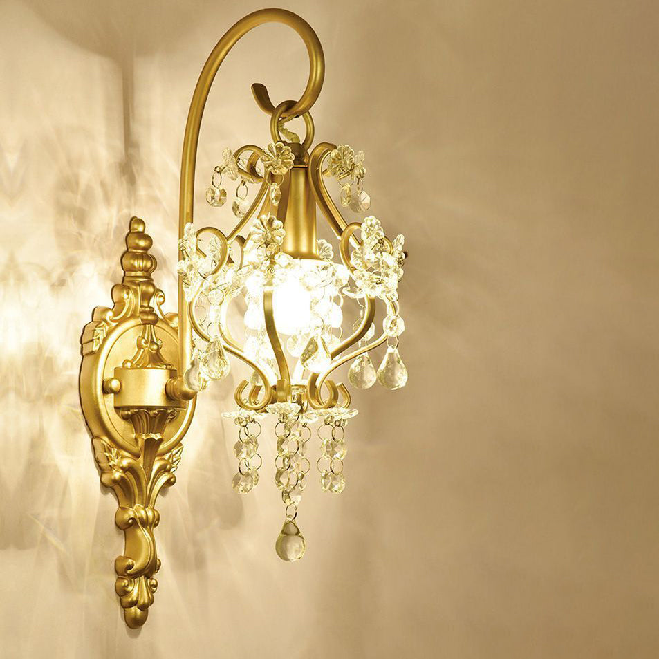 伝統的なフランスの曲線ロッド、アイアンフレーム、クリスタルシェード、リビングルーム用1灯壁取り付け用燭台ランプ
