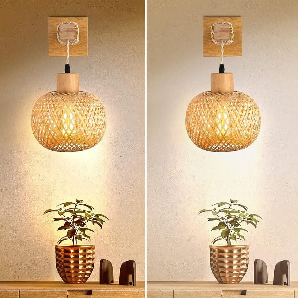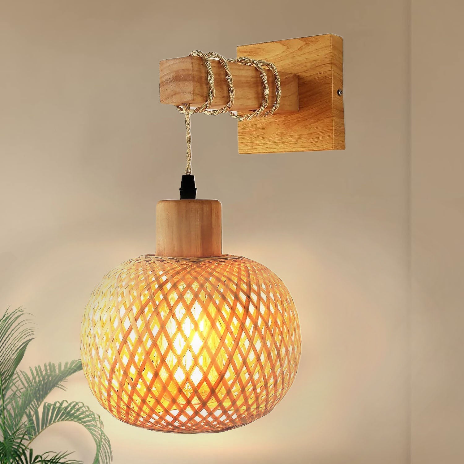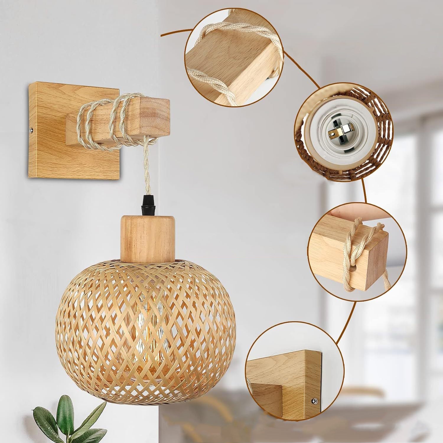 伝統的な日本の円筒形球状網目状四角ベース木製竹製1灯壁取り付け用燭台ランプ寝室用