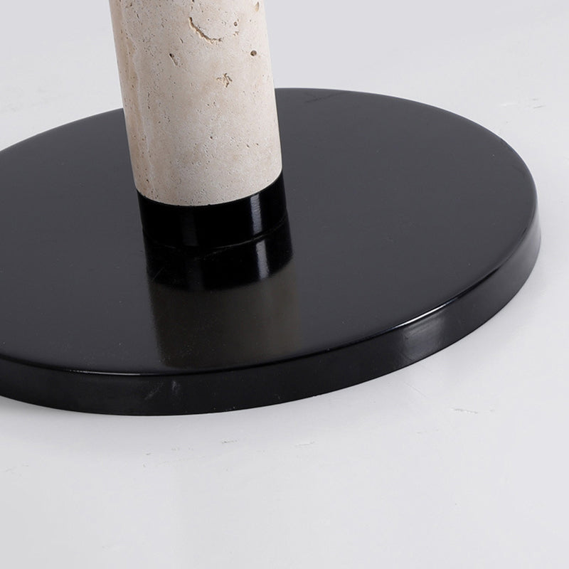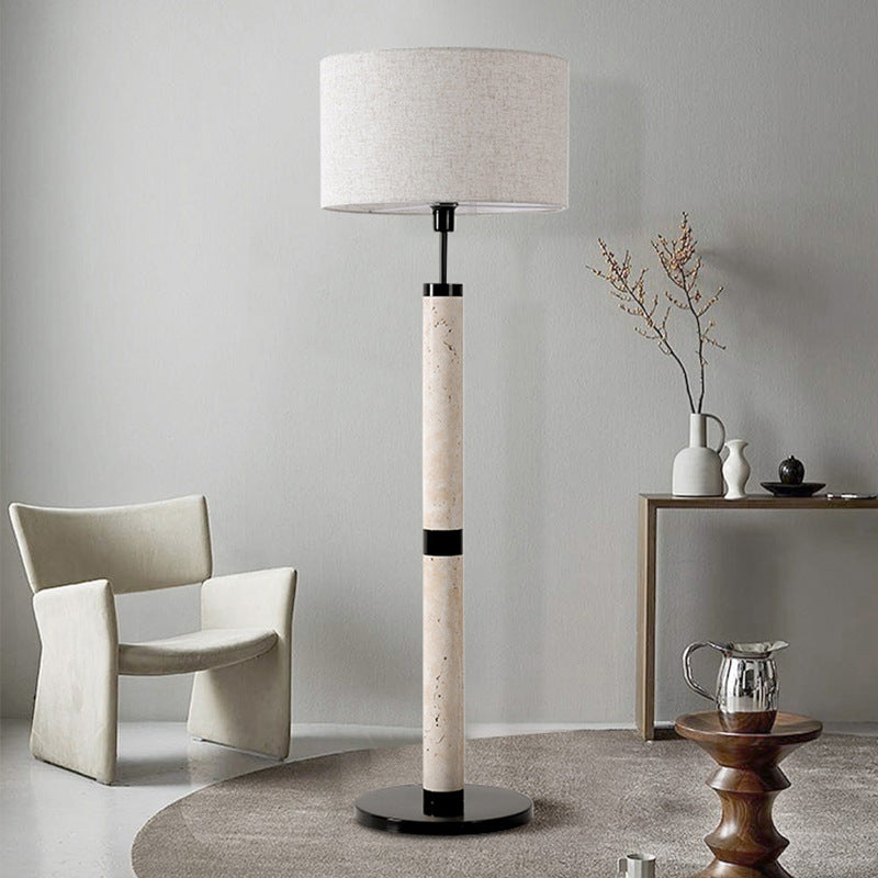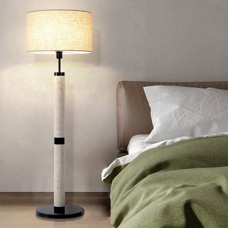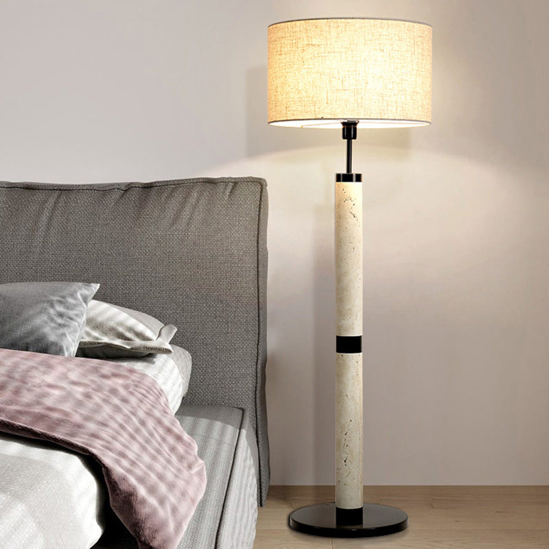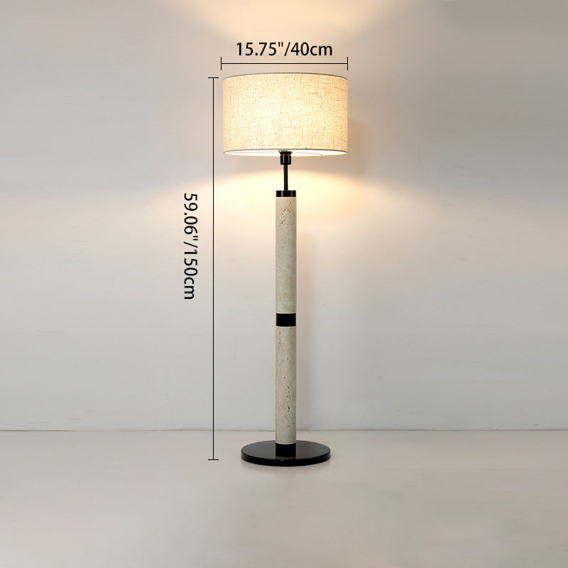Traditional Japanese Round Cylindrical Yellow Travertine Fabric 1-Light Standing Floor Lamp For Living Room