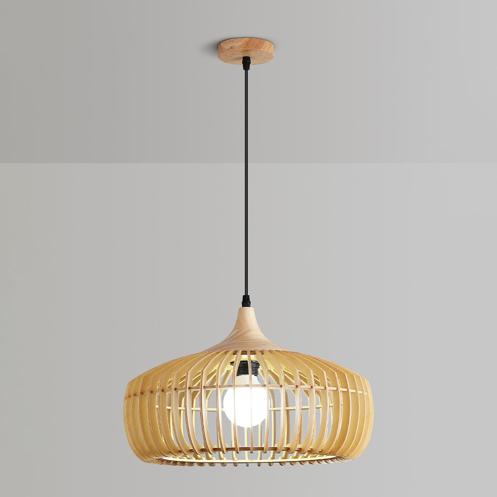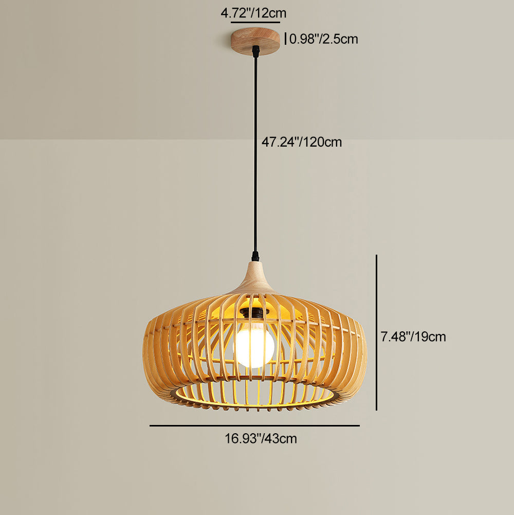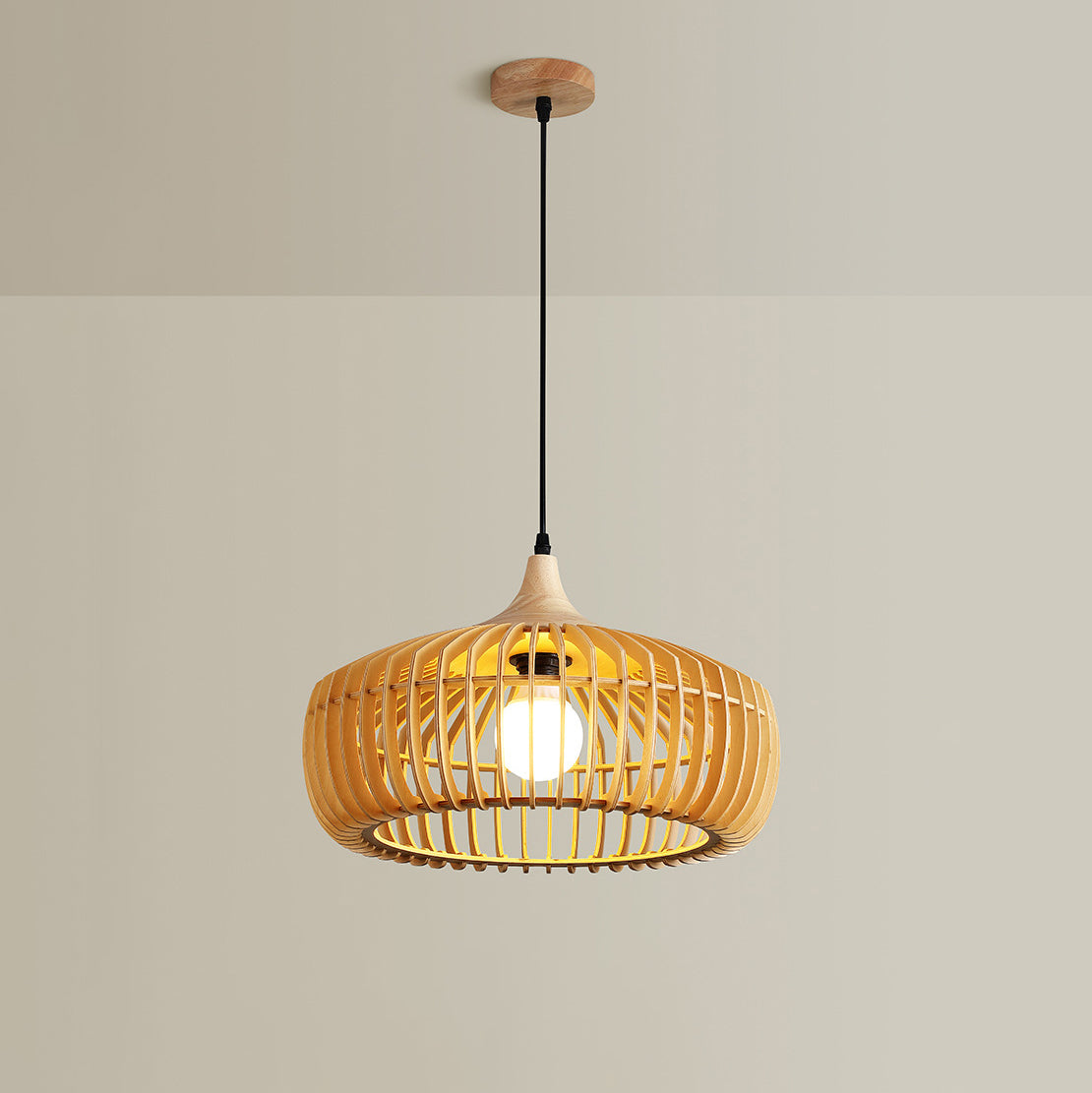 伝統的な日本の無垢材のくり抜き丸型ケージ 1灯ペンダントライト リビングルーム用