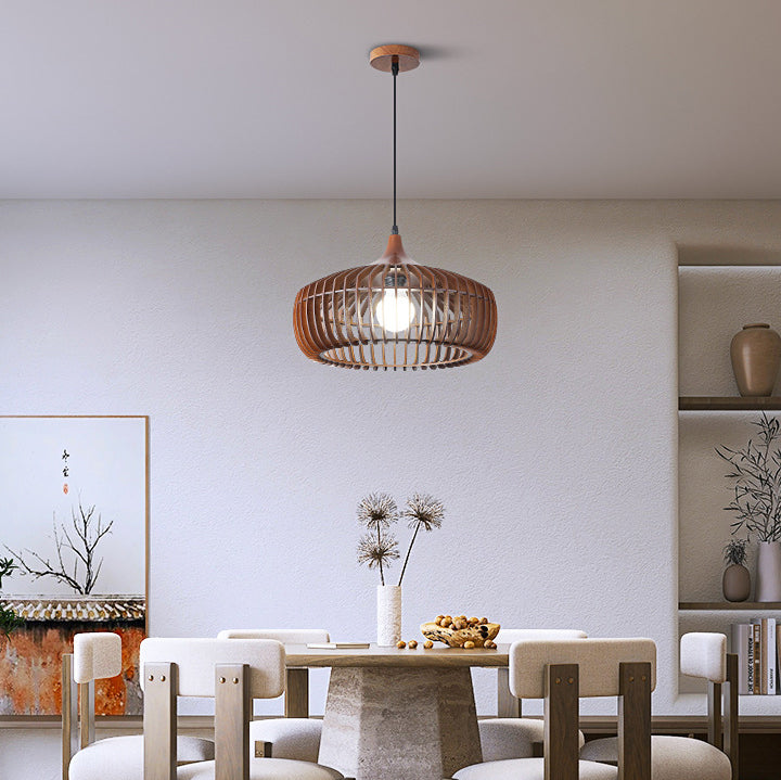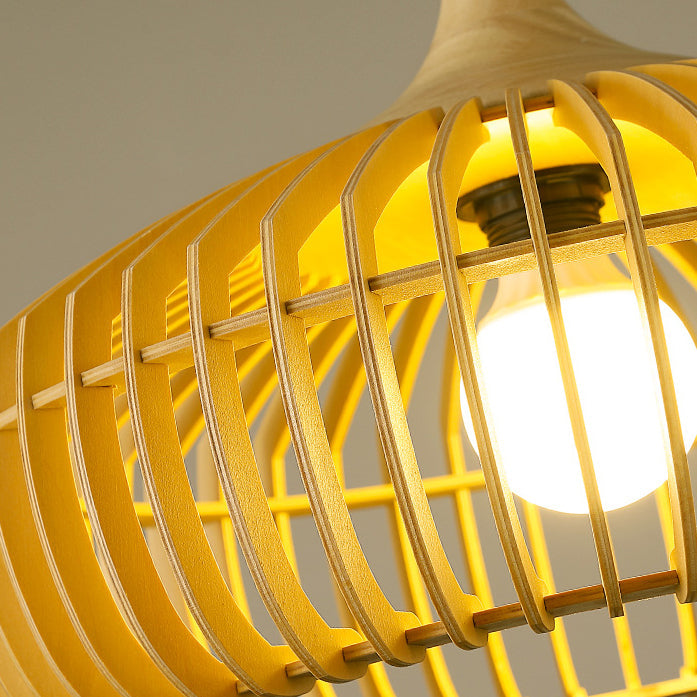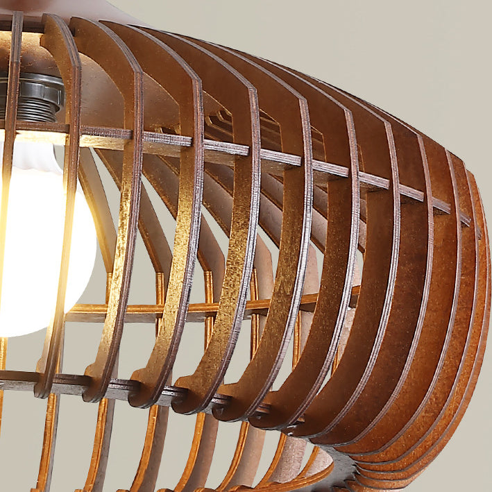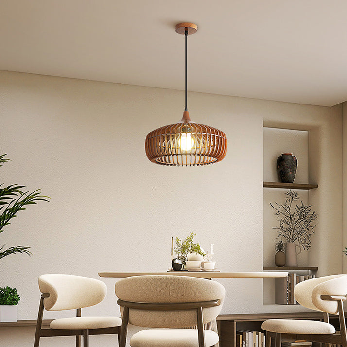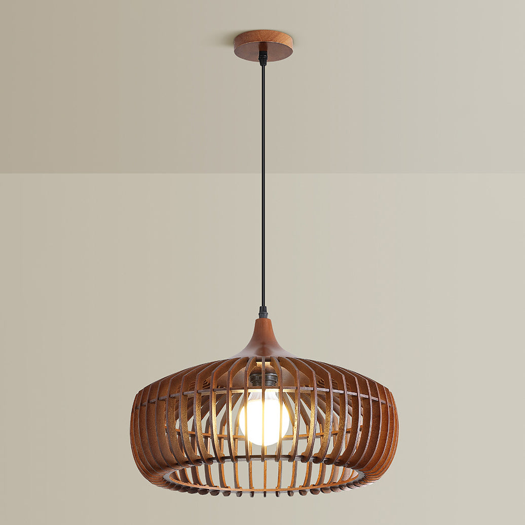伝統的な日本の無垢材のくり抜き丸型ケージ 1灯ペンダントライト リビングルーム用
