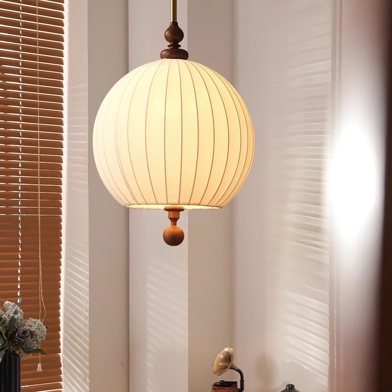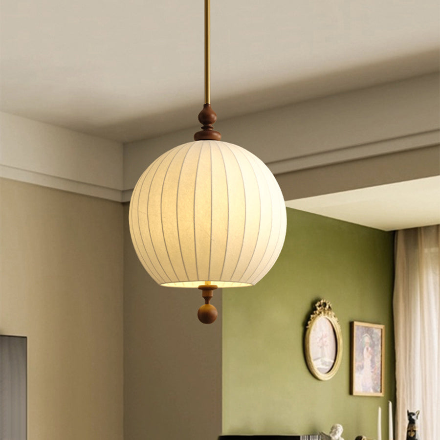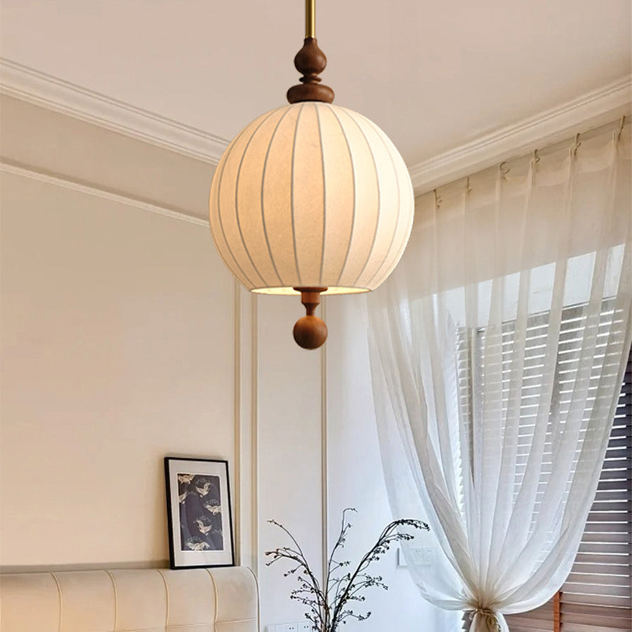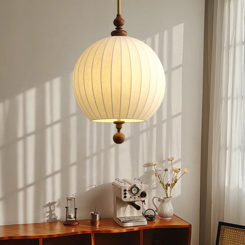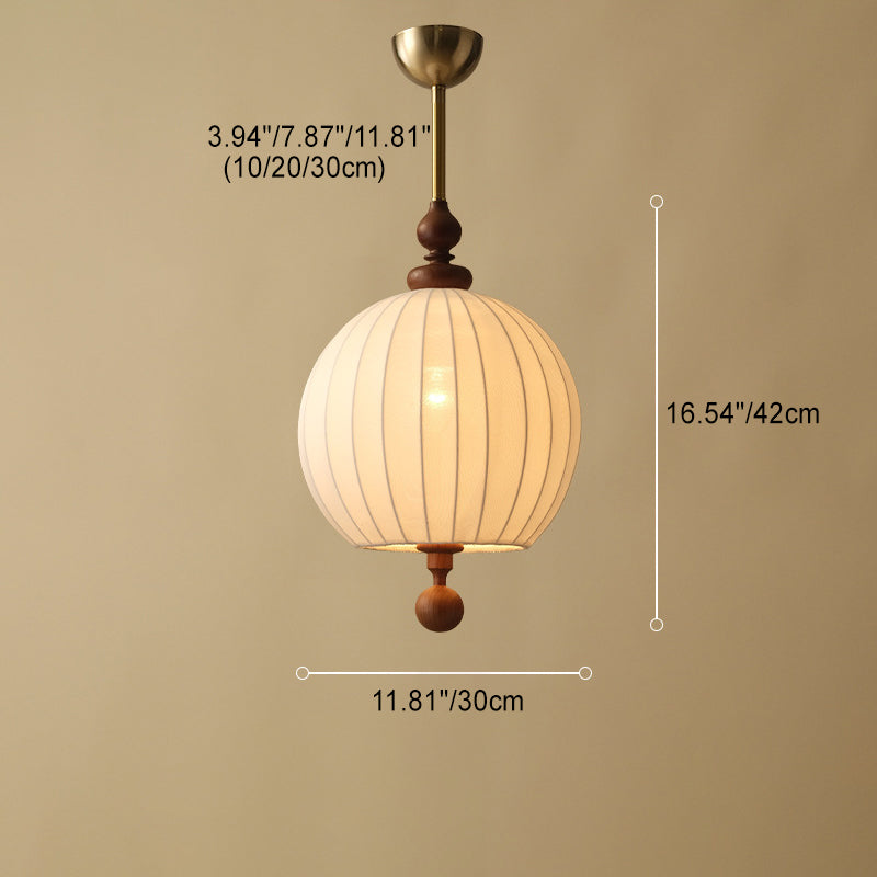 日本の伝統的な球状ファブリックシェード、アッシュウッド、リビングルーム用1灯ペンダントライト