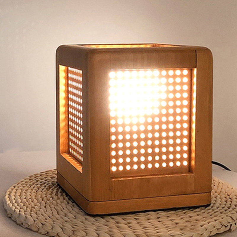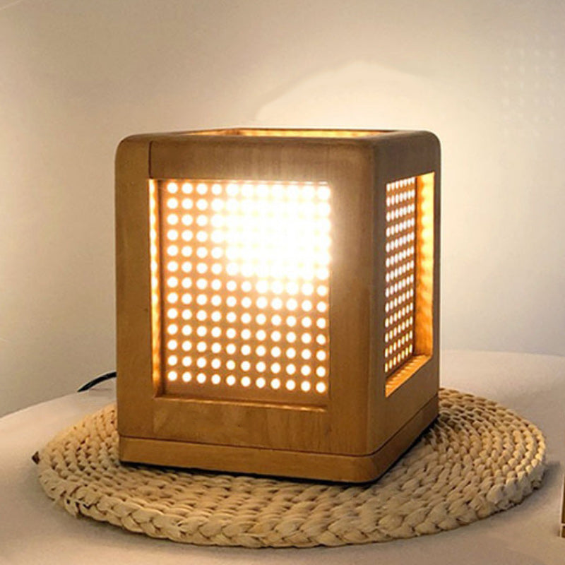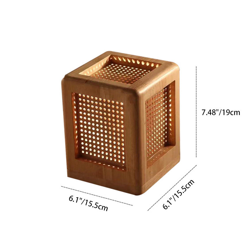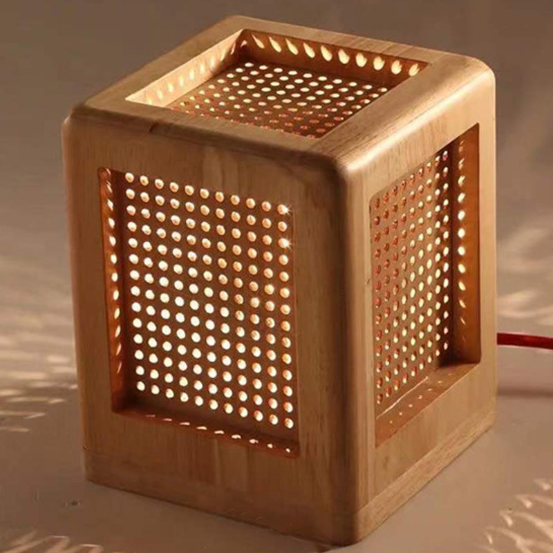 Traditional Japanese Square Cube Hole Rubber Wood 1 - Light Table Lamp For Bedroom