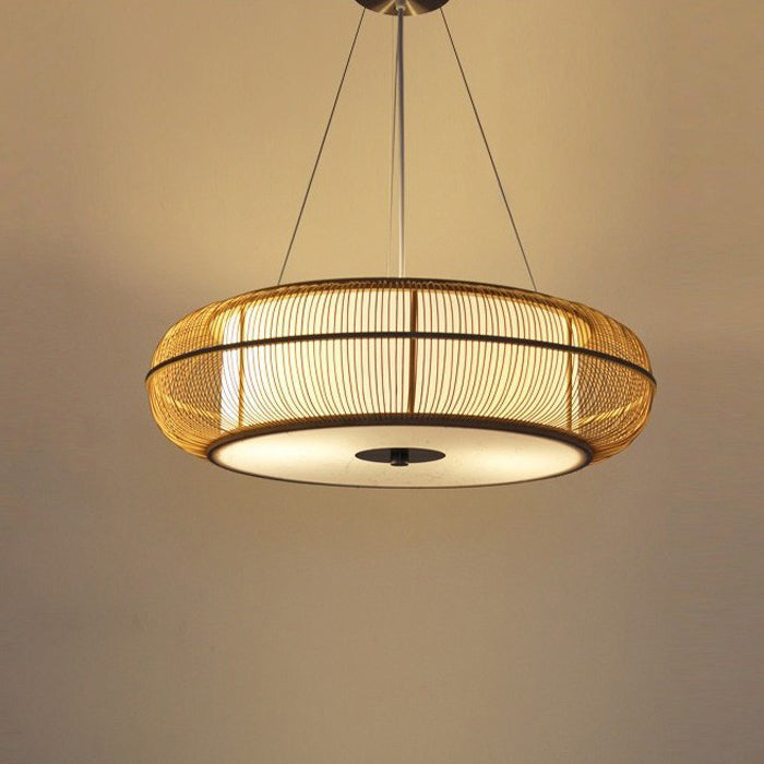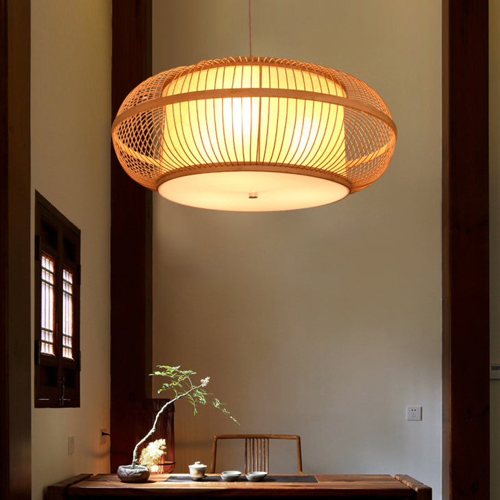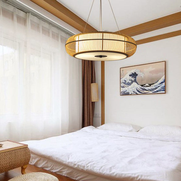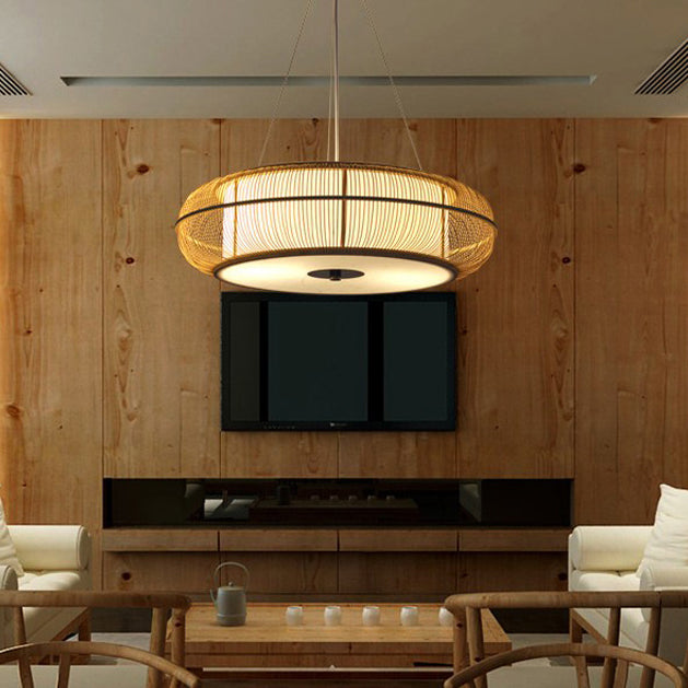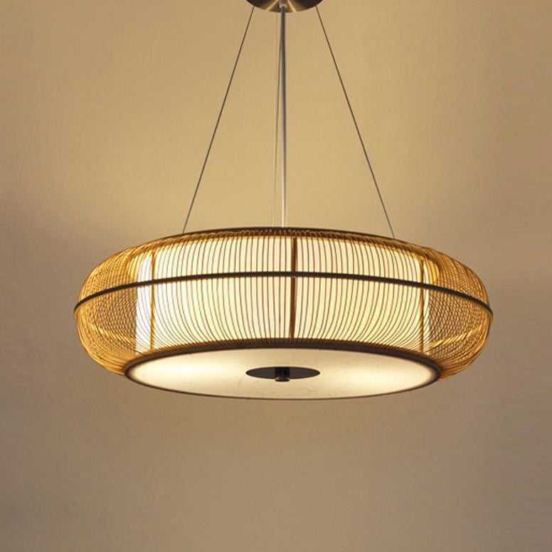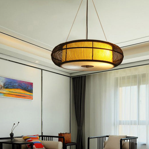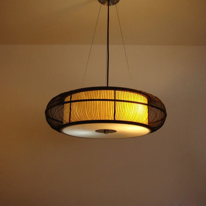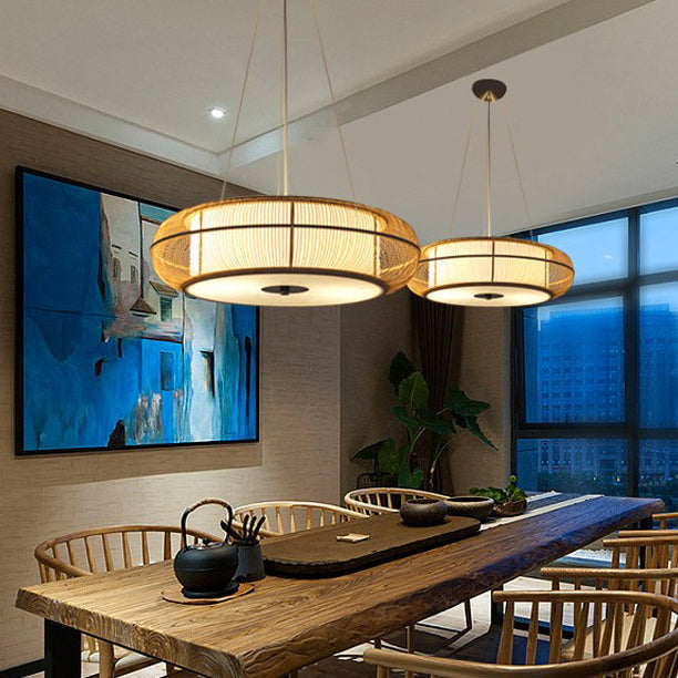 日本の伝統的な編み方による手作りの竹製ラウンドシリンダー3/4ライトシャンデリア(ダイニングルーム用)