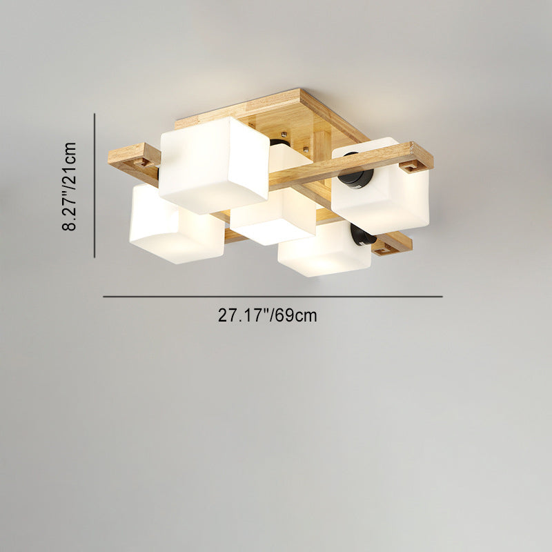 伝統的な日本の木製ガラス製立方体スクエア4/5/8/9灯セミフラッシュマウント天井照明リビングルーム用