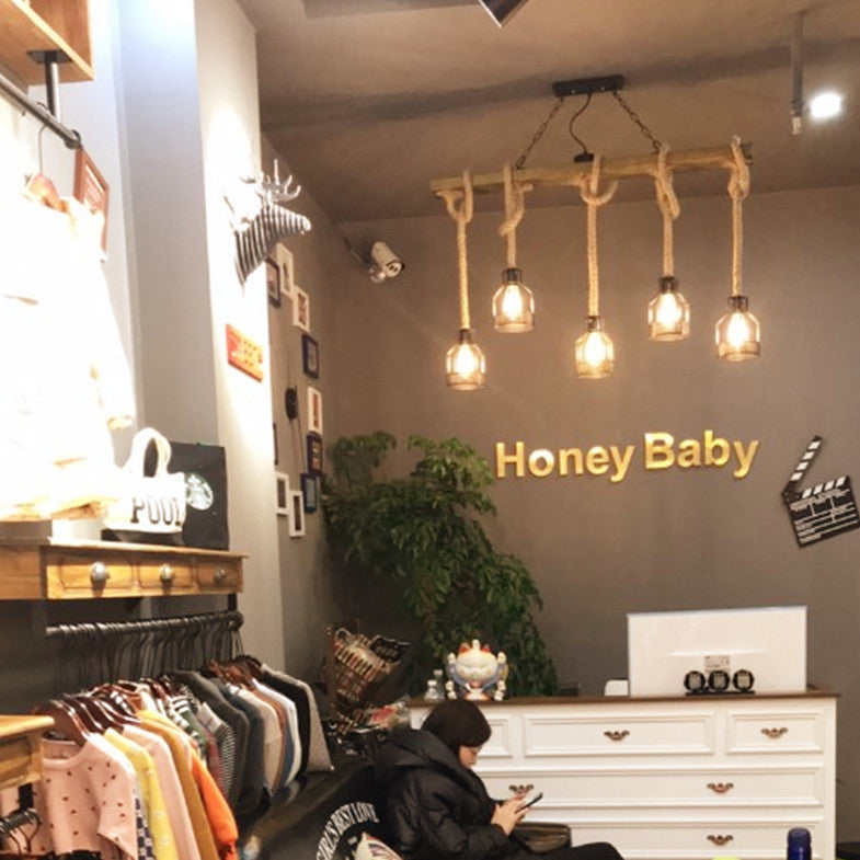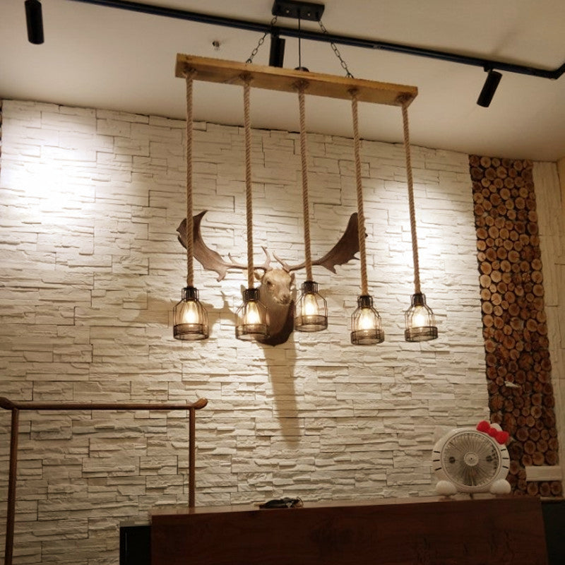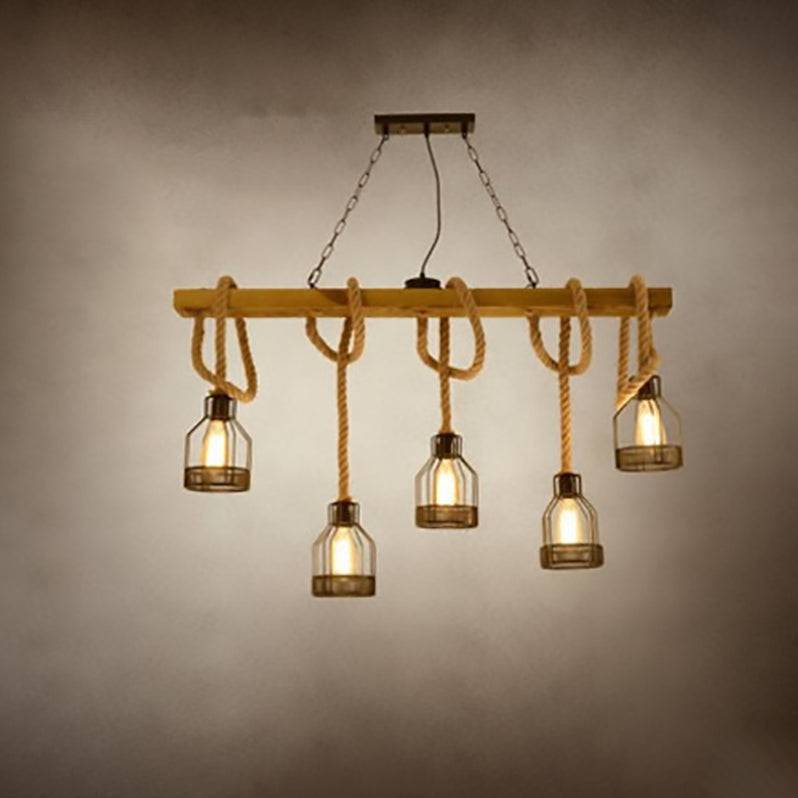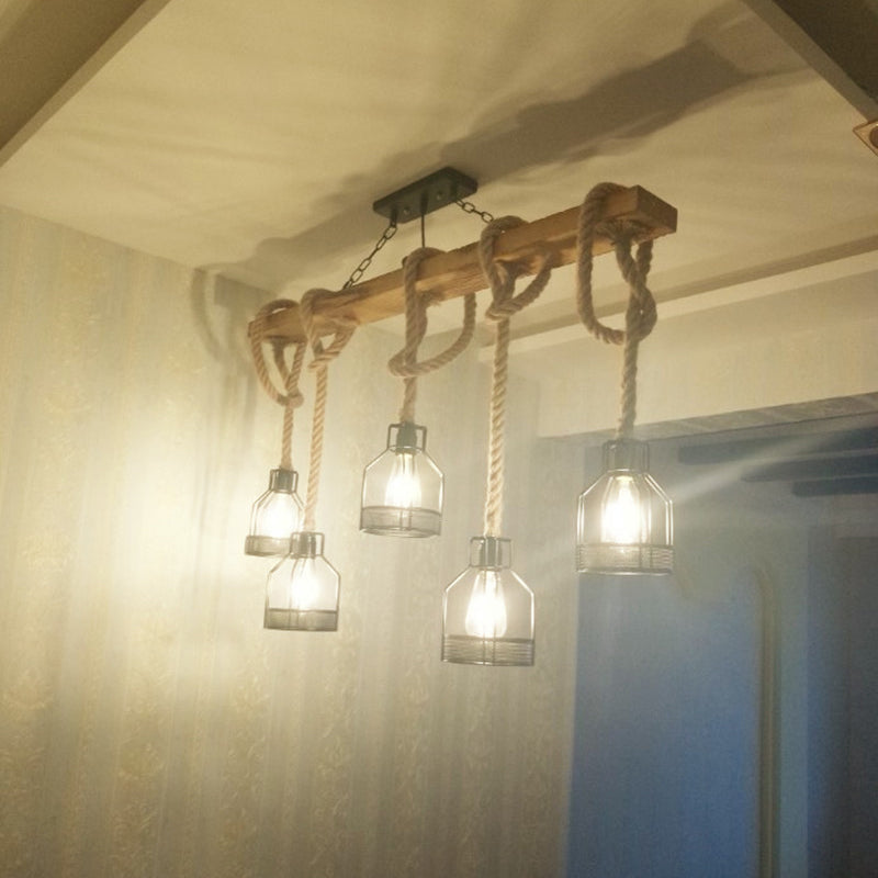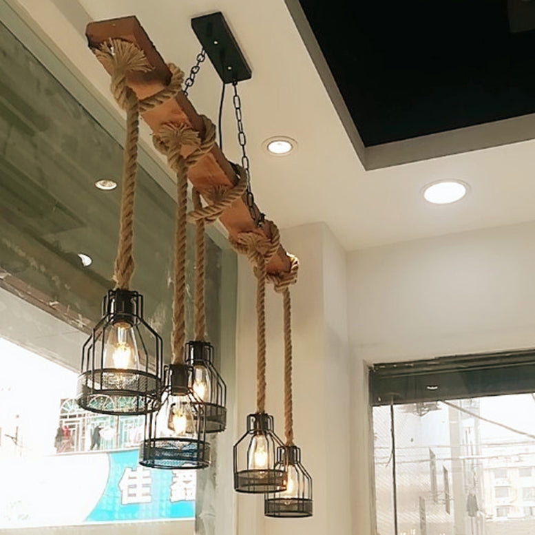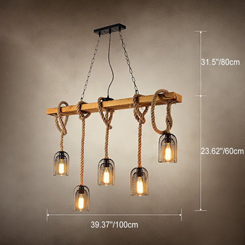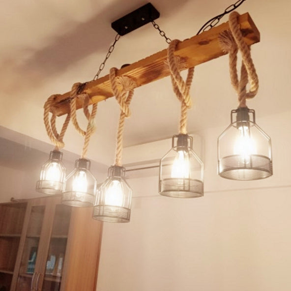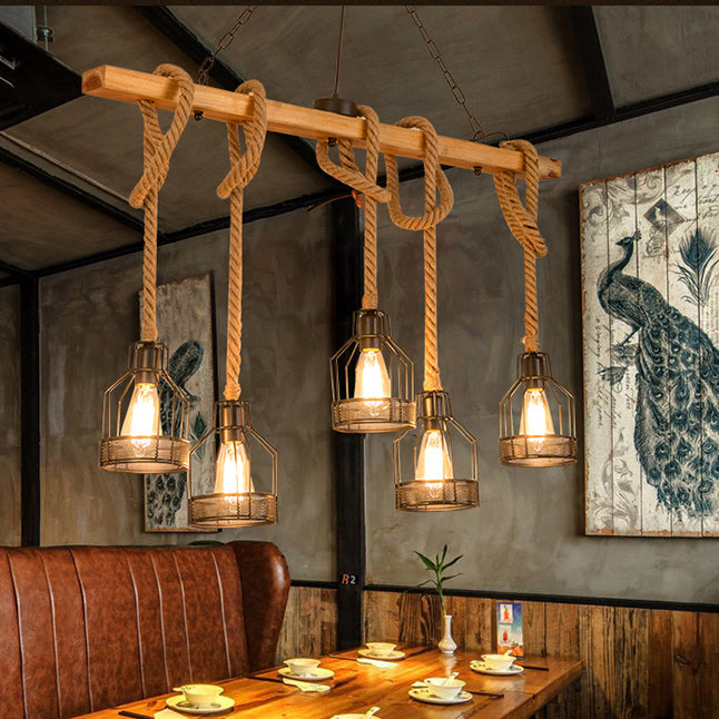 伝統的な素朴な木製梁と鉄製のケージシェードを備えた5灯アイランドライトシャンデリア(ダイニングルーム用)
