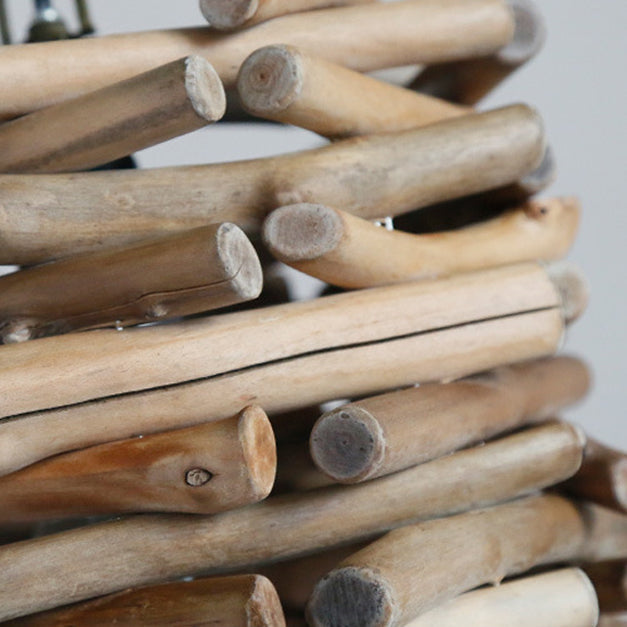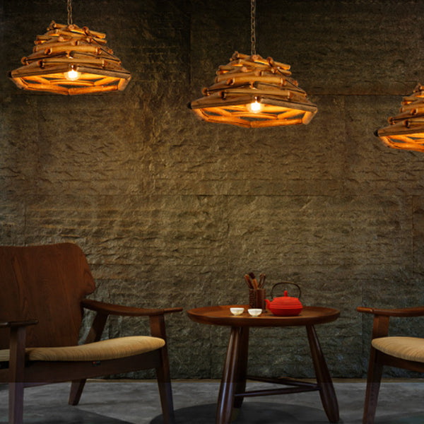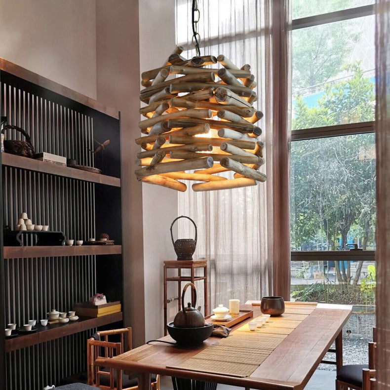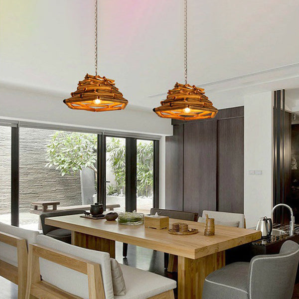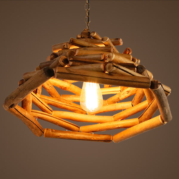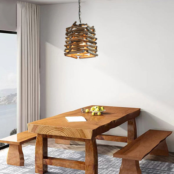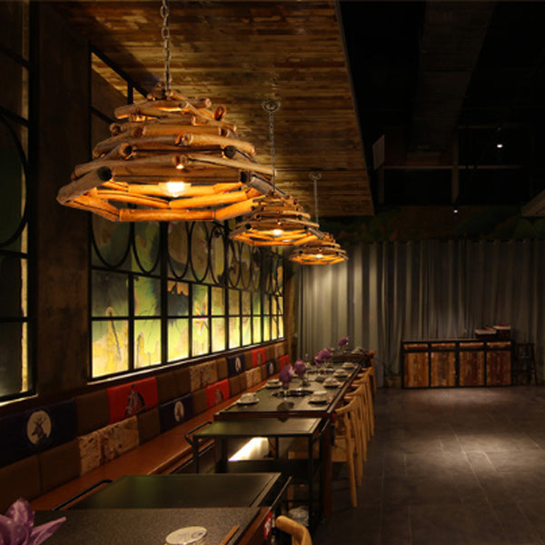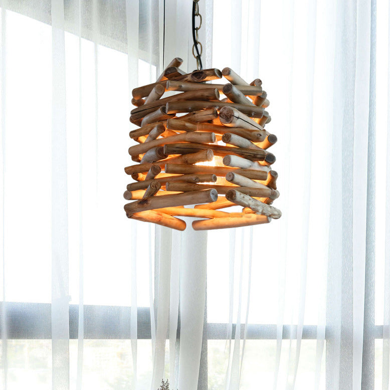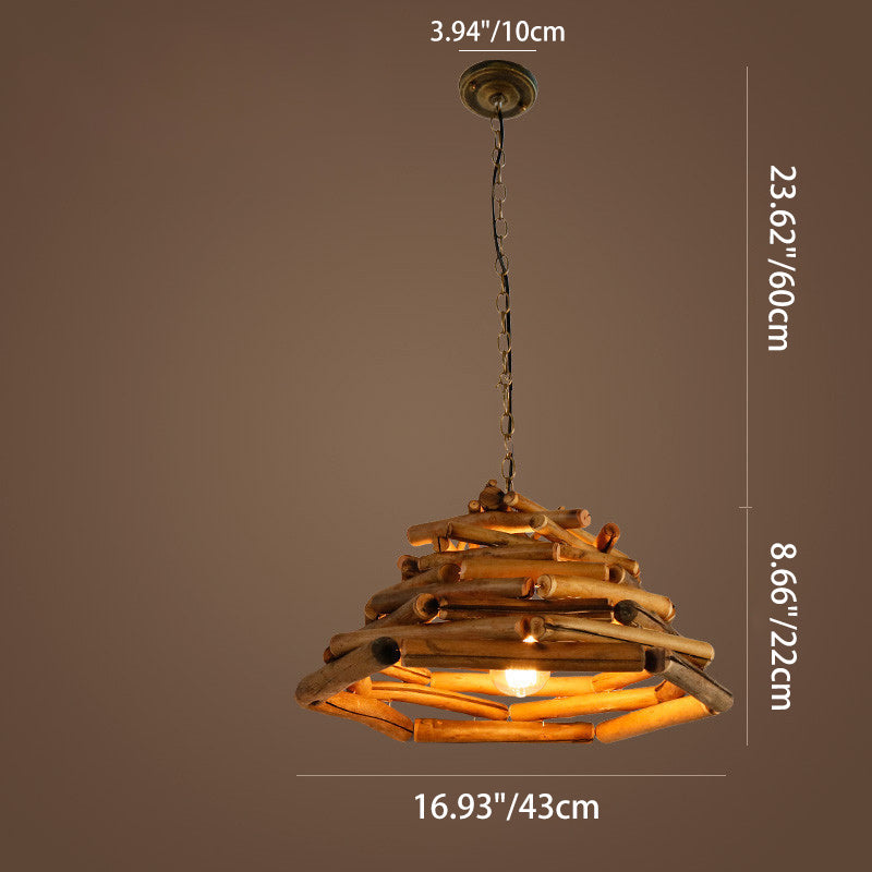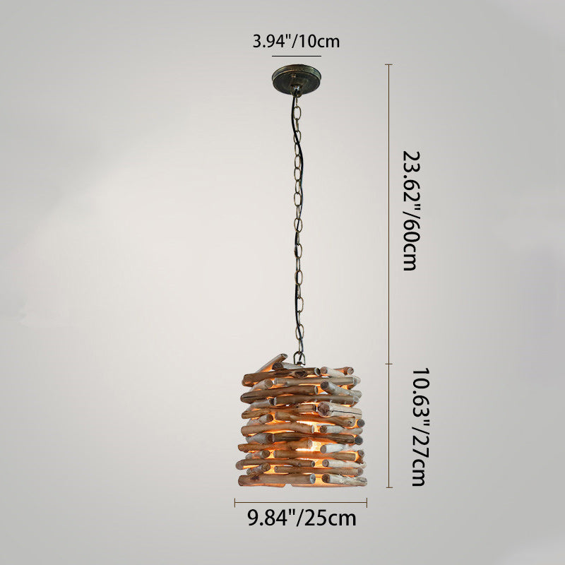 伝統的な素朴な木製スティックコーンシリンダー木製1灯ペンダントライト(ダイニングルーム用)