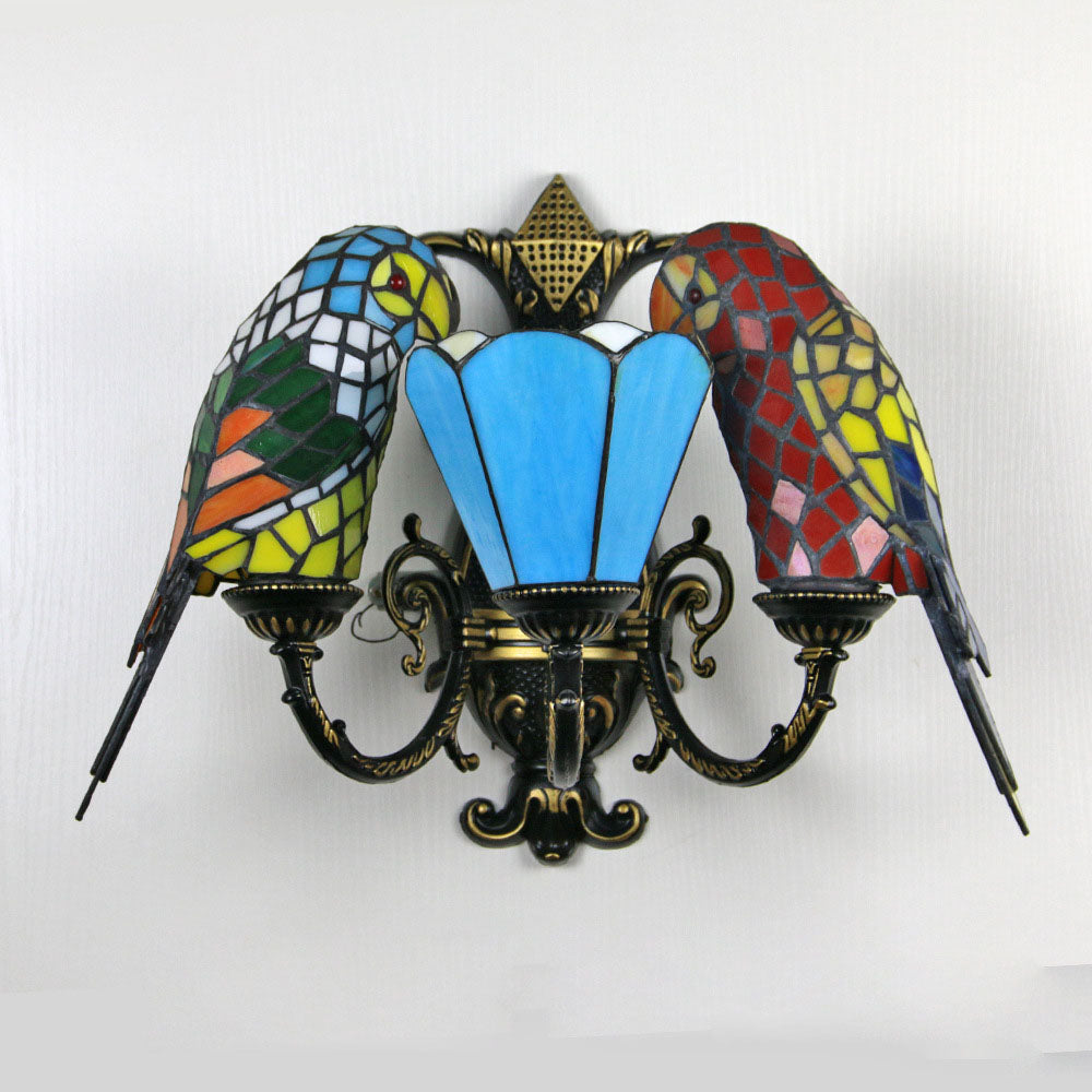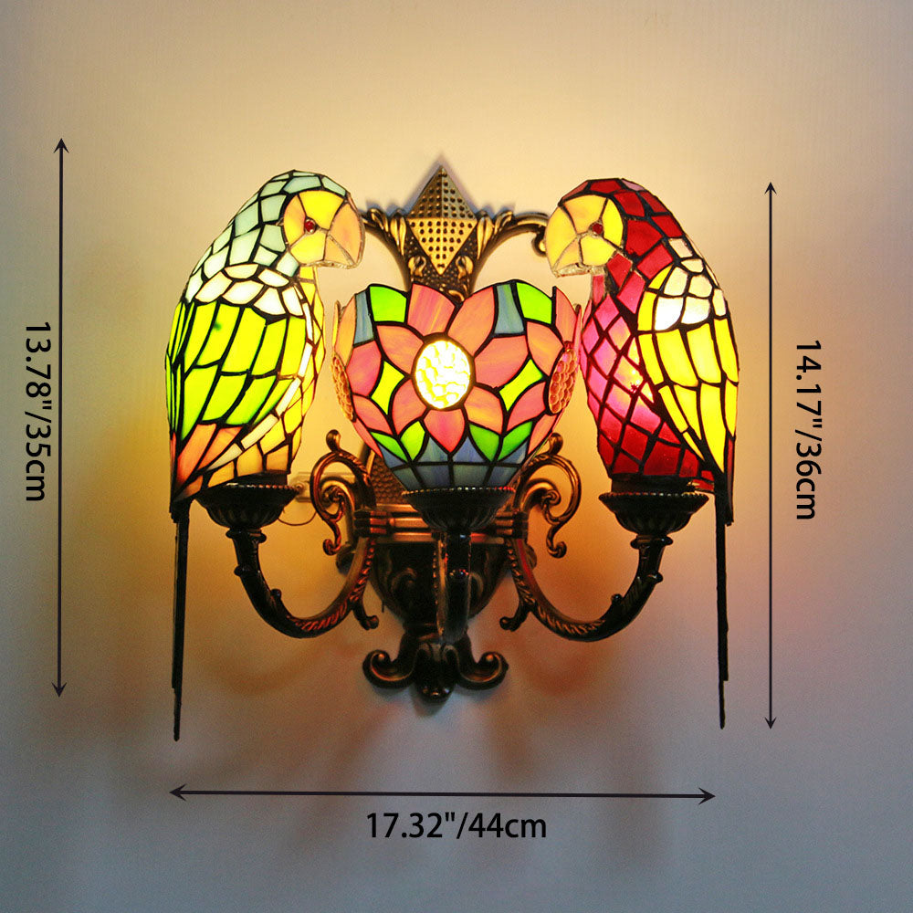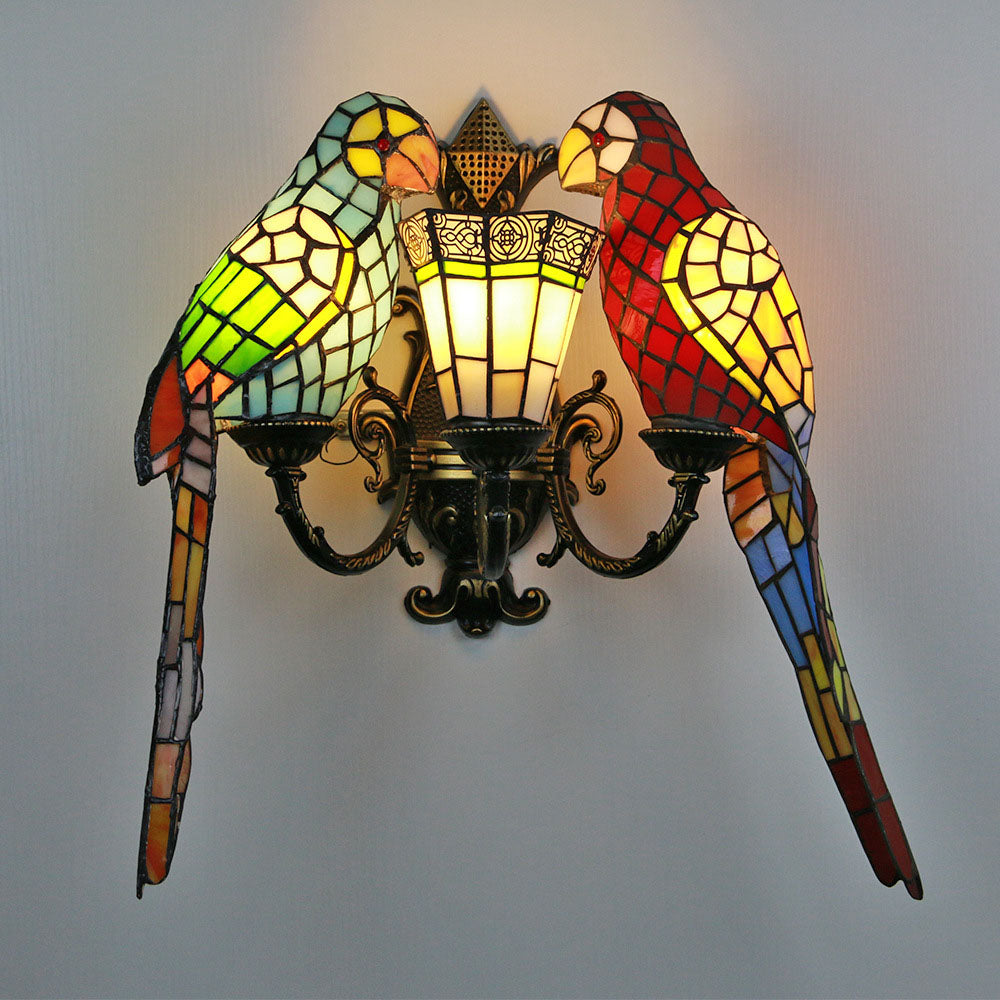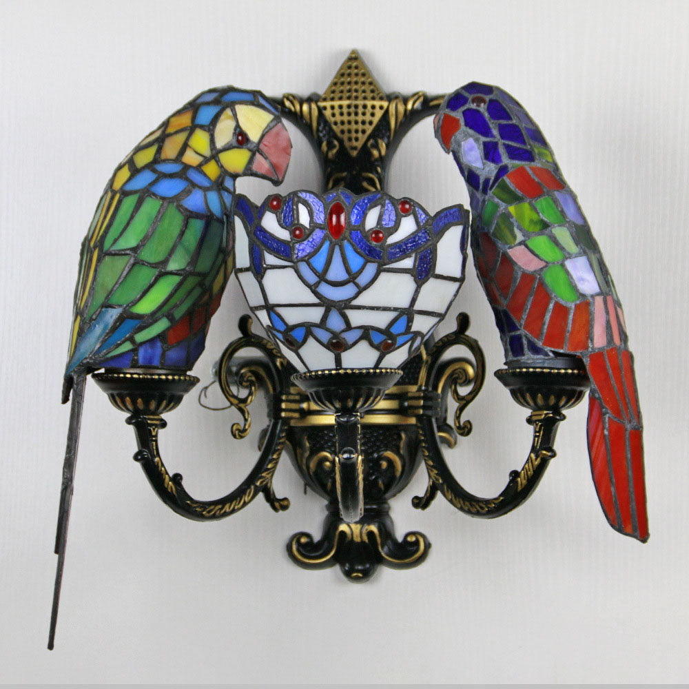 伝統的なティファニーのパロットラウンドテーブル、半円形の鉄製ガラス、リビングルーム用3灯壁取り付け用燭台ランプ