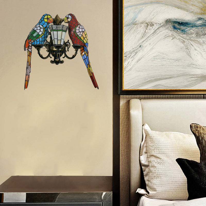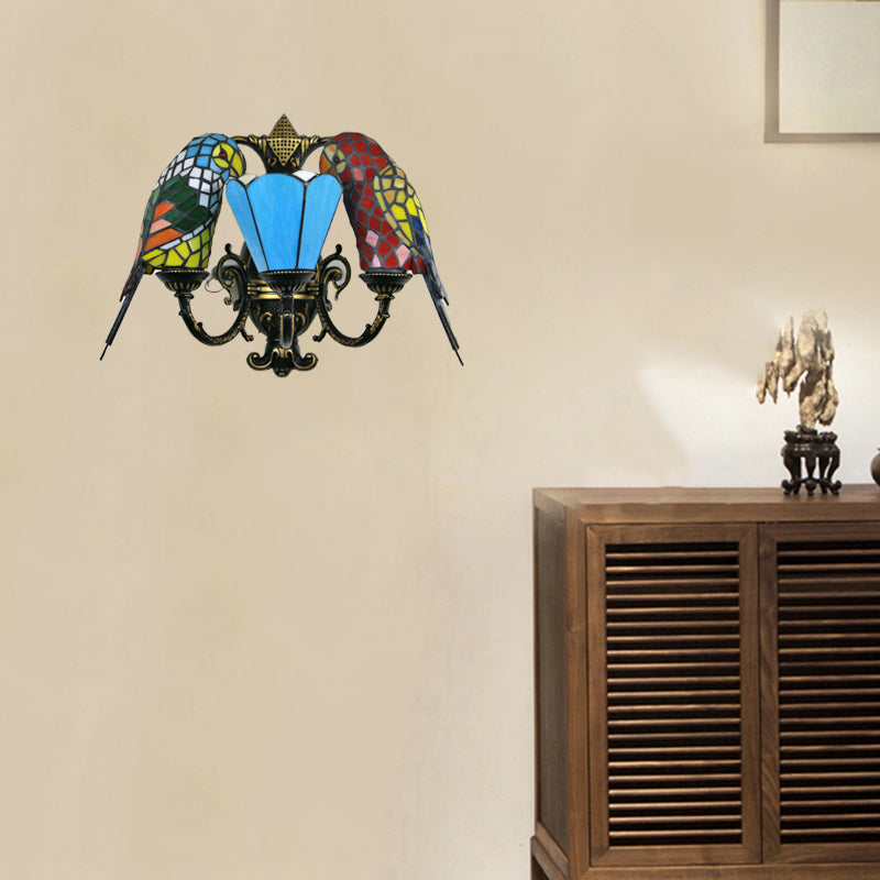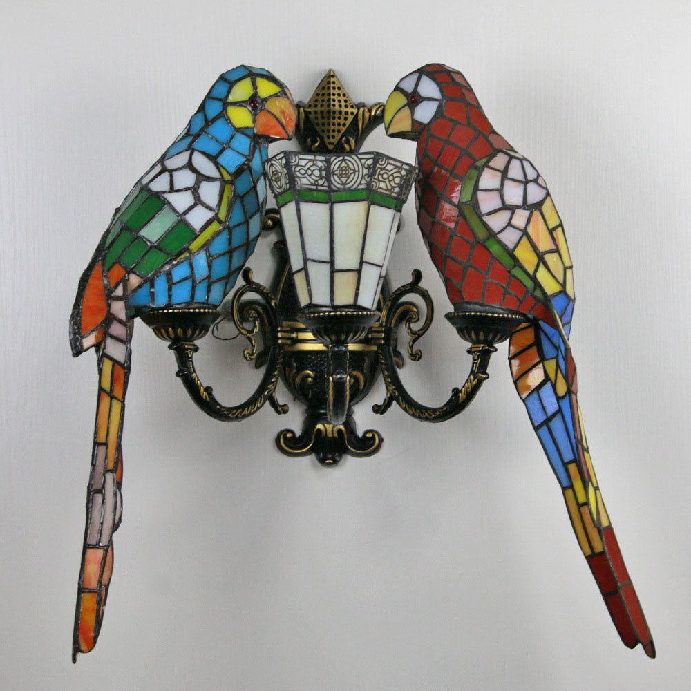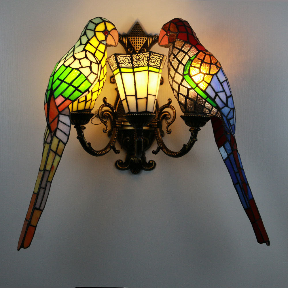 伝統的なティファニーのパロットラウンドテーブル、半円形の鉄製ガラス、リビングルーム用3灯壁取り付け用燭台ランプ