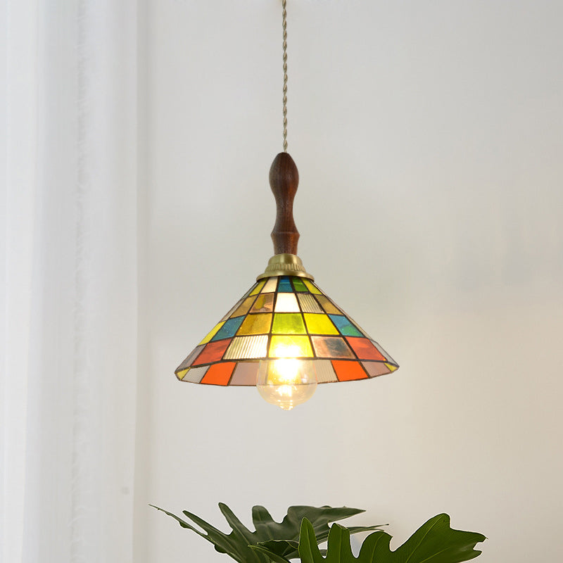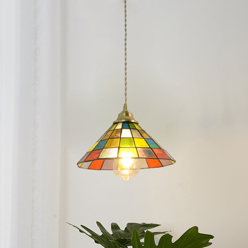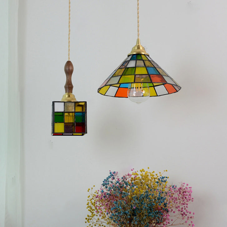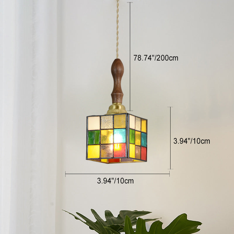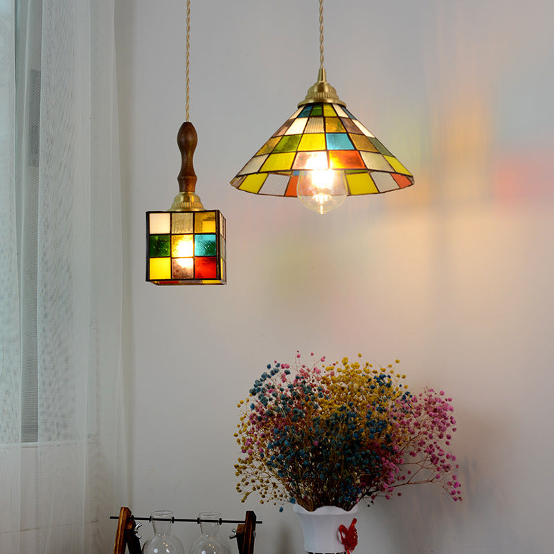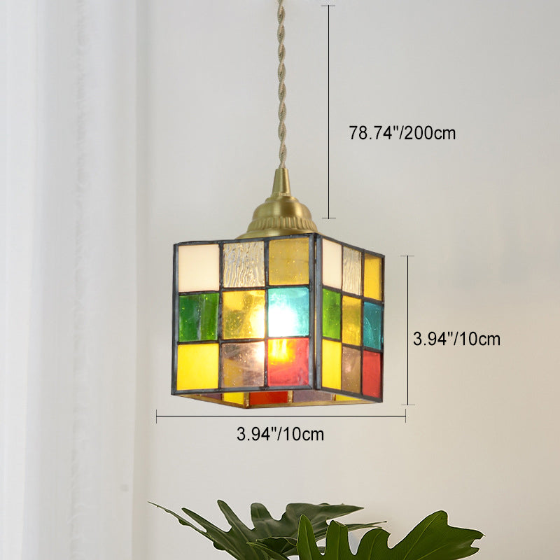 伝統的なティファニーパズルキューブ、テーパード、カラフルなステンドグラス、真鍮製、リビングルーム用1灯ペンダントライト