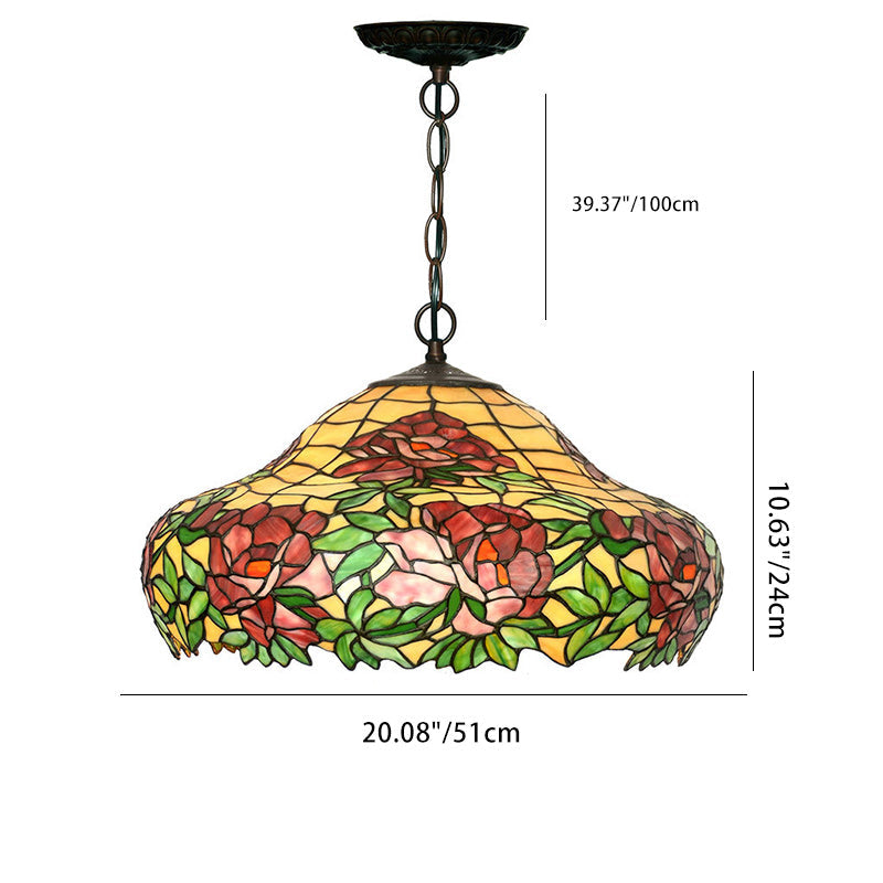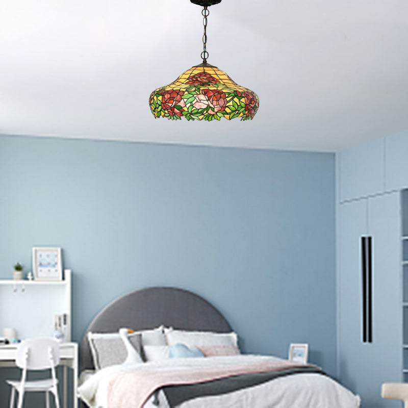 伝統的なティファニーローズラウンドコーンアイアンステンドグラス3灯ペンダントライト寝室用