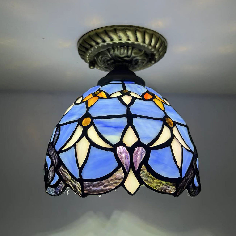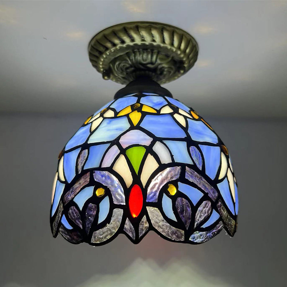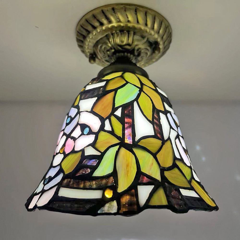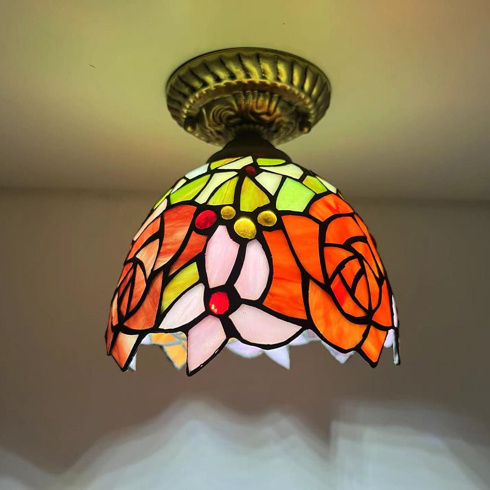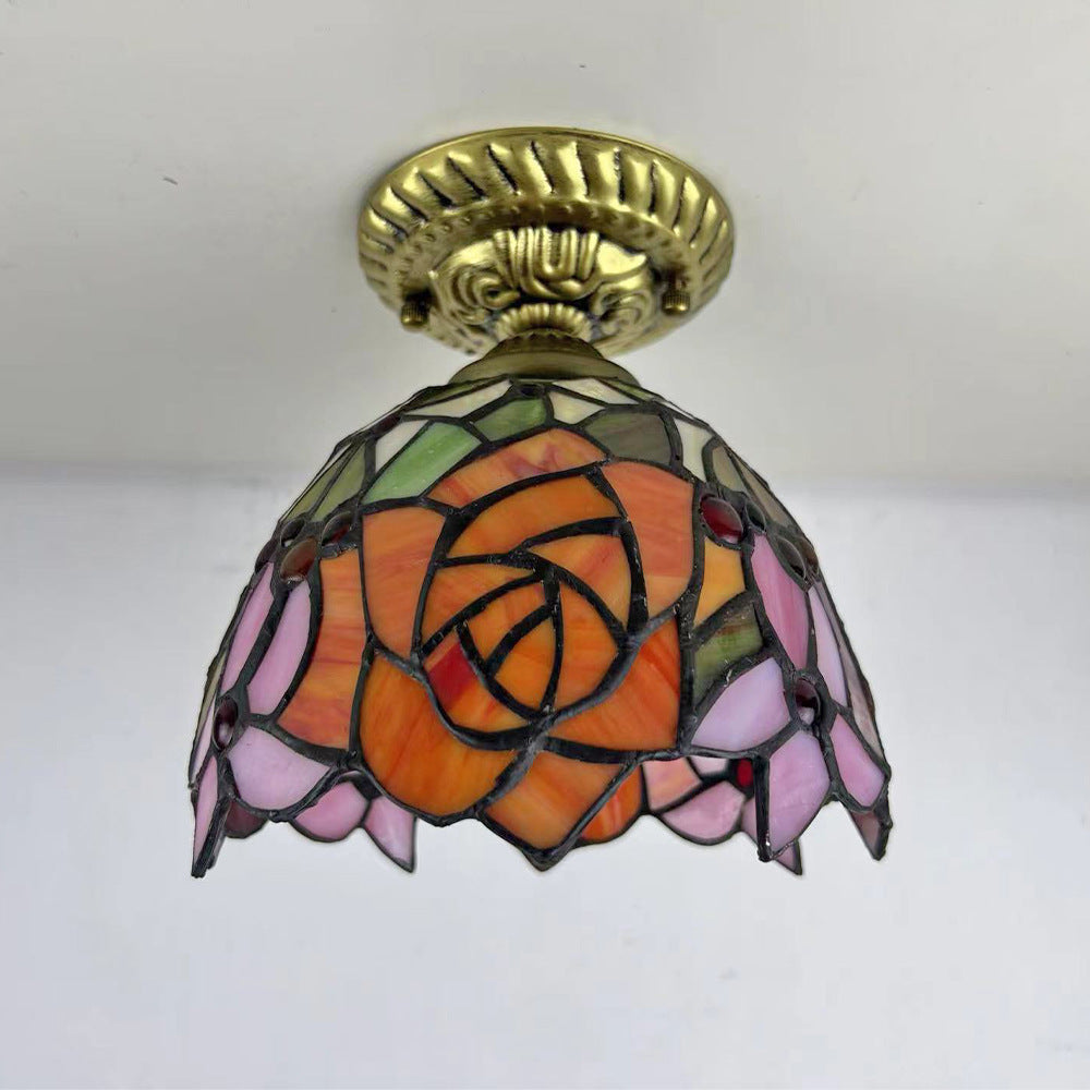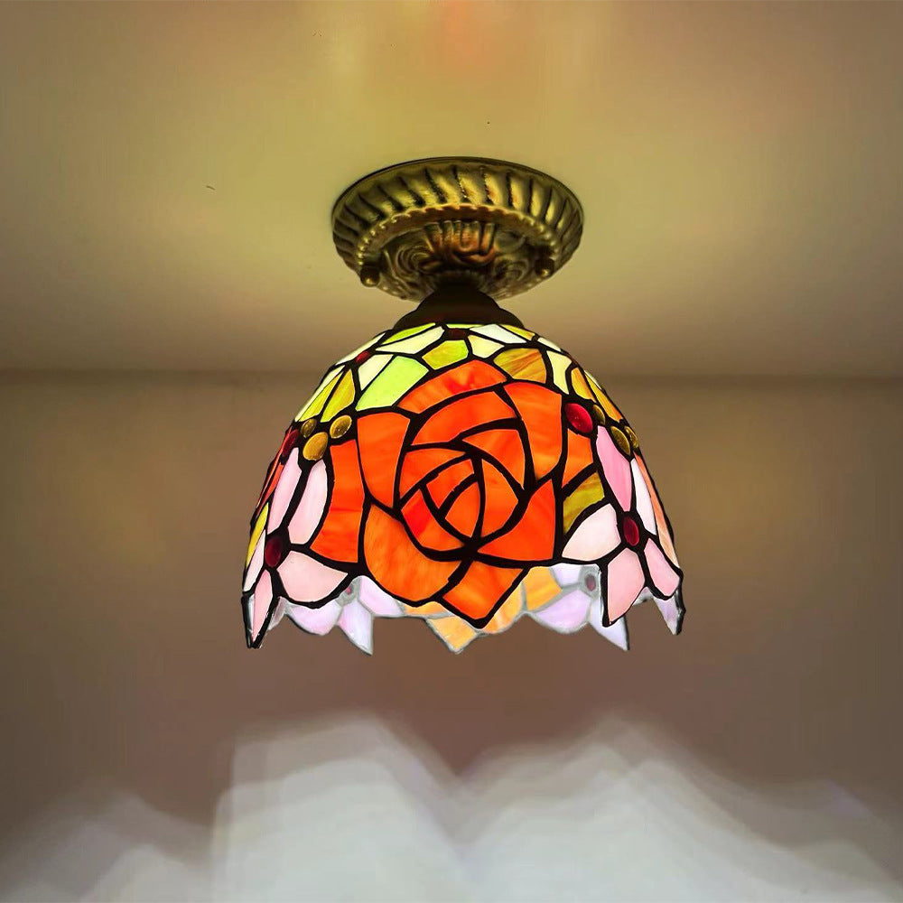 伝統的なティファニーステンドグラスローズフラワーラウンドシェード樹脂1ライトセミフラッシュマウントシーリングライト寝室用