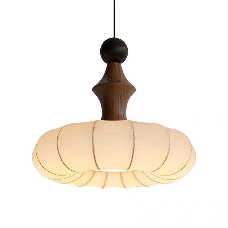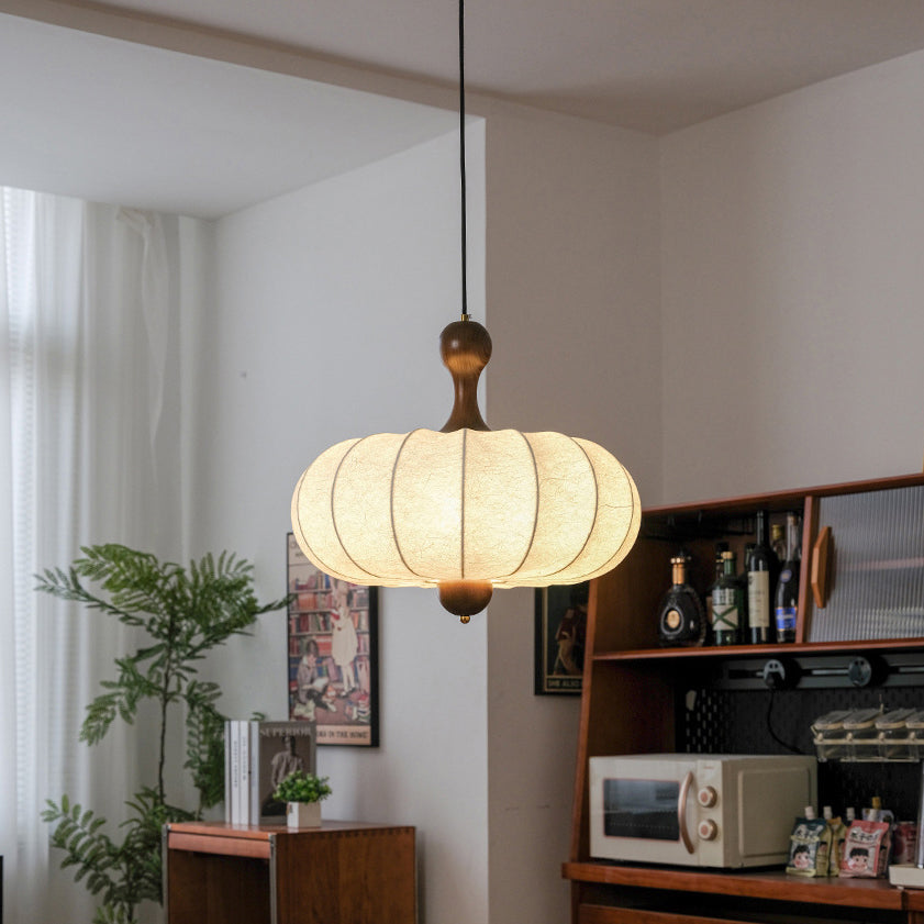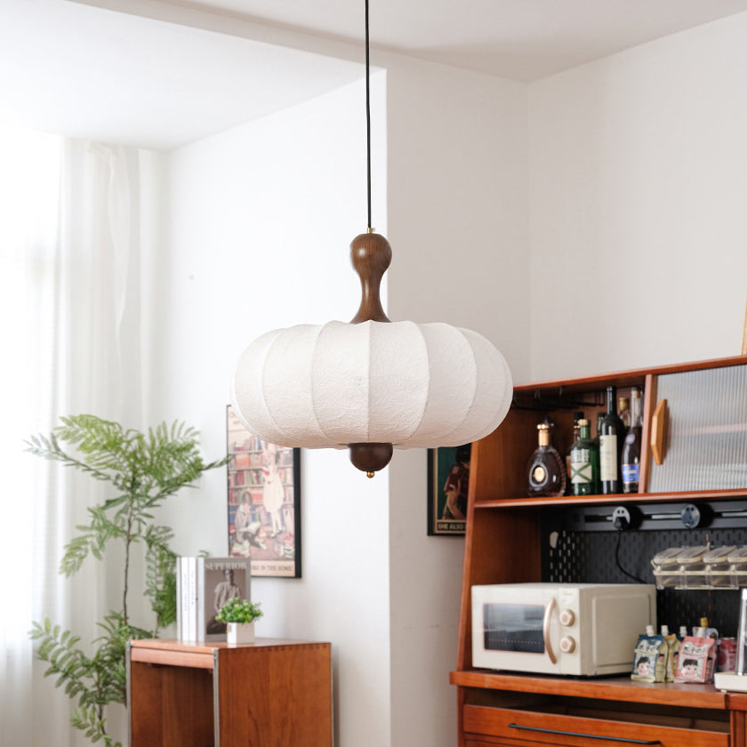 時代を超えた魅力を放つ、伝統的なヴィンテージペンダントライト。フェイクシルク、無垢材、金属を使用し、柔らかなベージュと木目調の仕上げが施されています。手編みのストライプ模様のフラットな丸型シェードは、柔らかな光を放ち、眩しくなく、寝室やリビングルームに居心地の良い雰囲気を添えます。