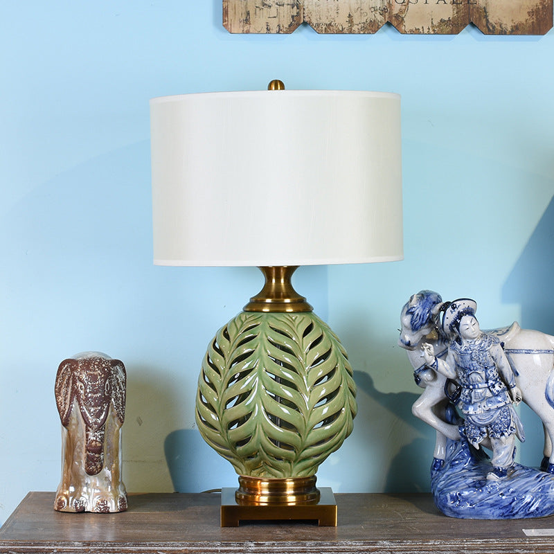 Traditional Vintage Hollowed Out Leaves Vase Shaped Ceramic Copper Fabric 1-Light Table Lamp For Bedroom