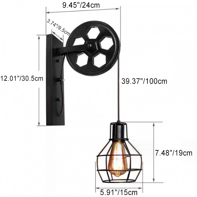 伝統的なヴィンテージアイアンケージプーリー昇降式1灯壁取り付け用燭台ランプ(ダイニングルーム用)