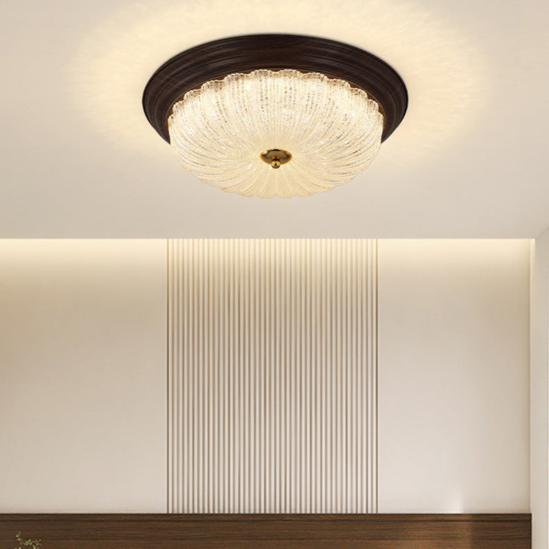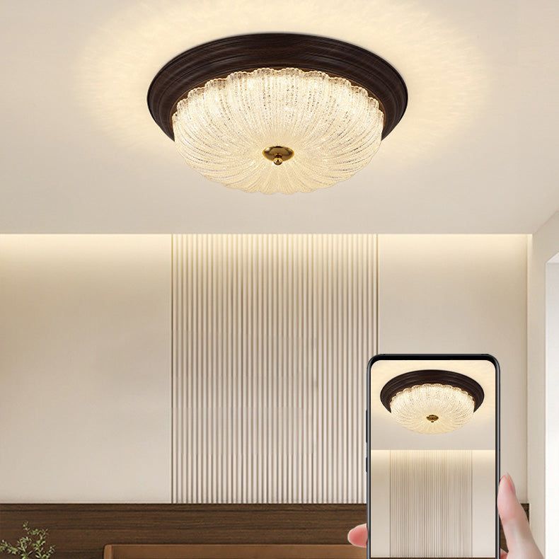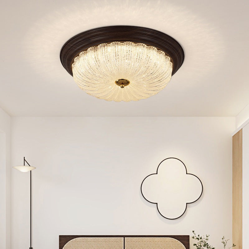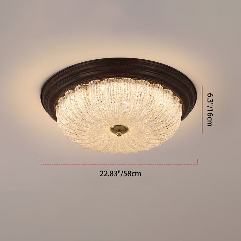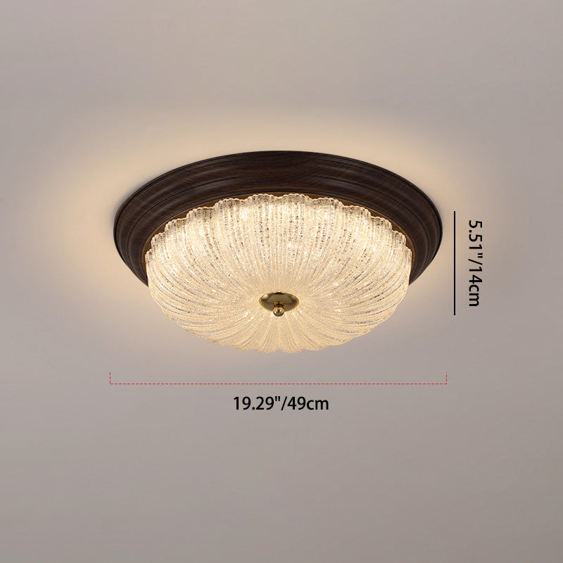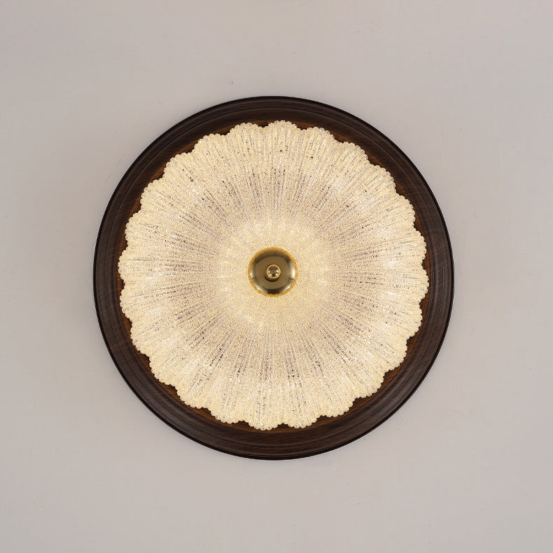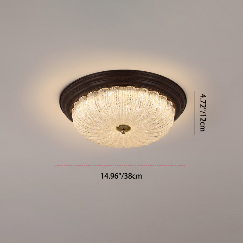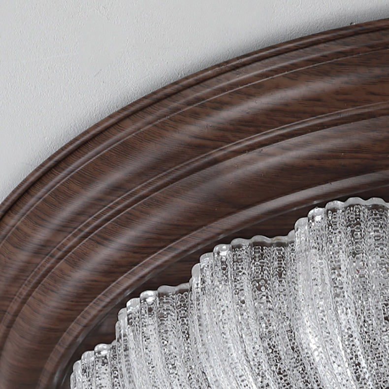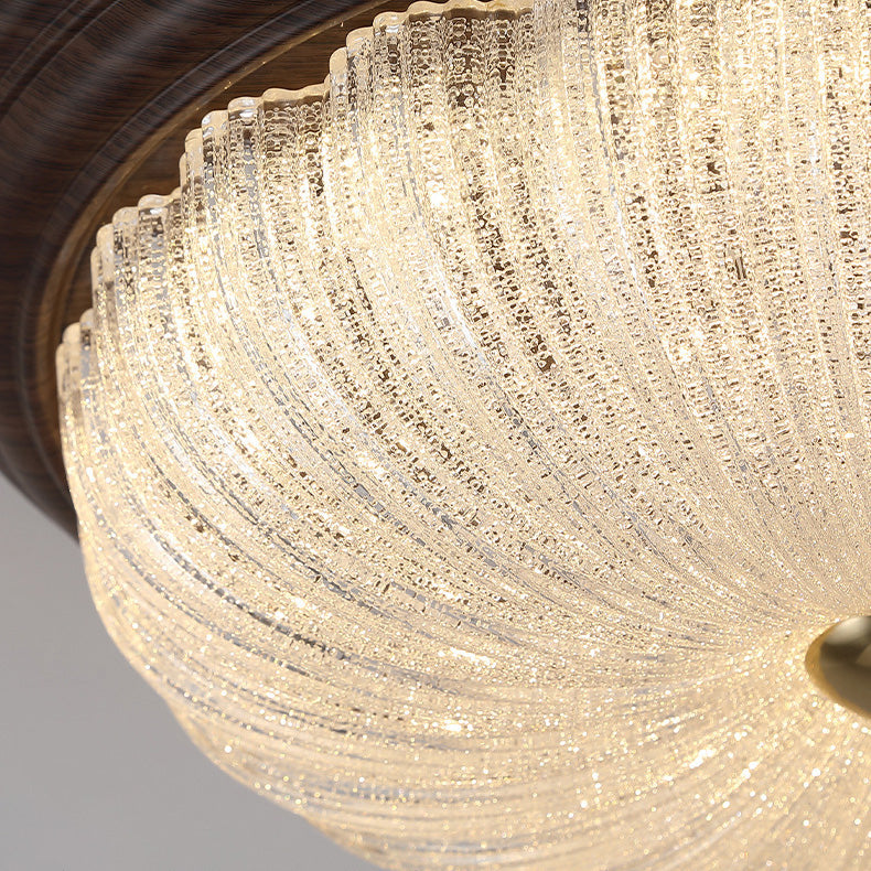 伝統的なヴィンテージラウンドファウンテンクリスタルガラスアイアンウォーターターンドウッドグレインLEDフラッシュマウントシーリングライトリビングルーム用