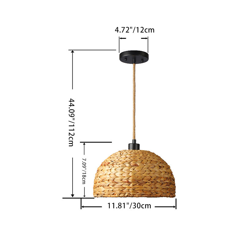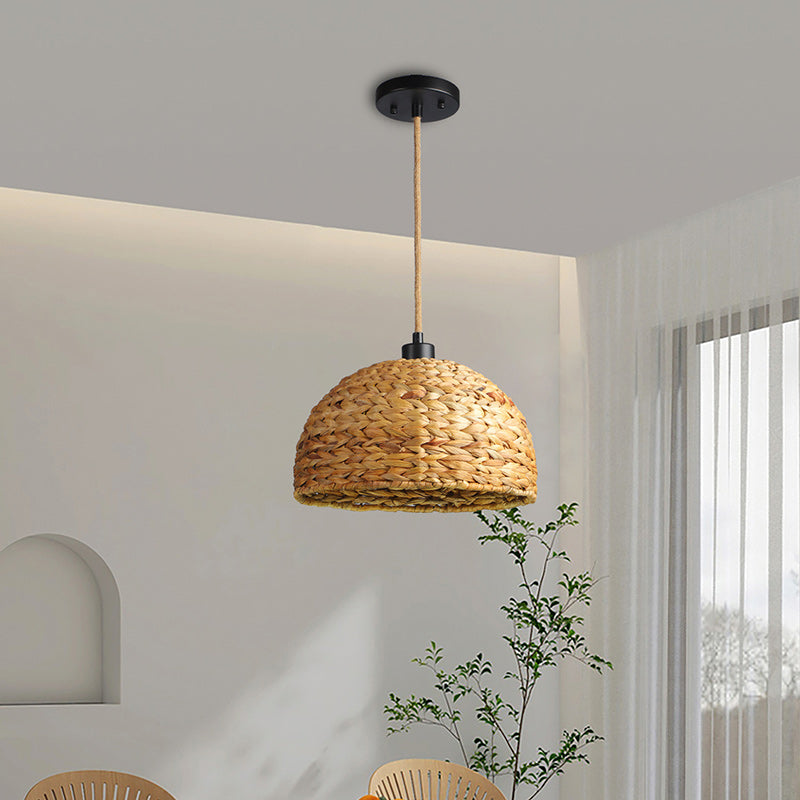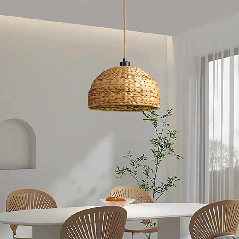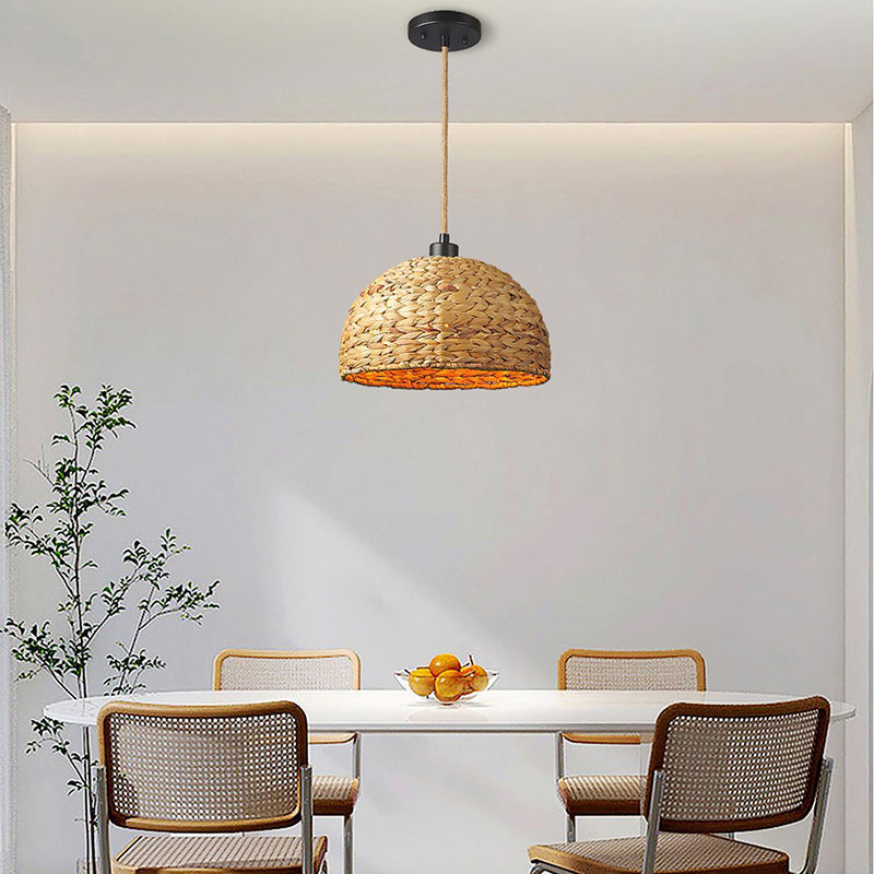 Contemporary Boho Weaving Rattan Metal Dome Hemispheroid 1-Light Pendant Light For Dining Room