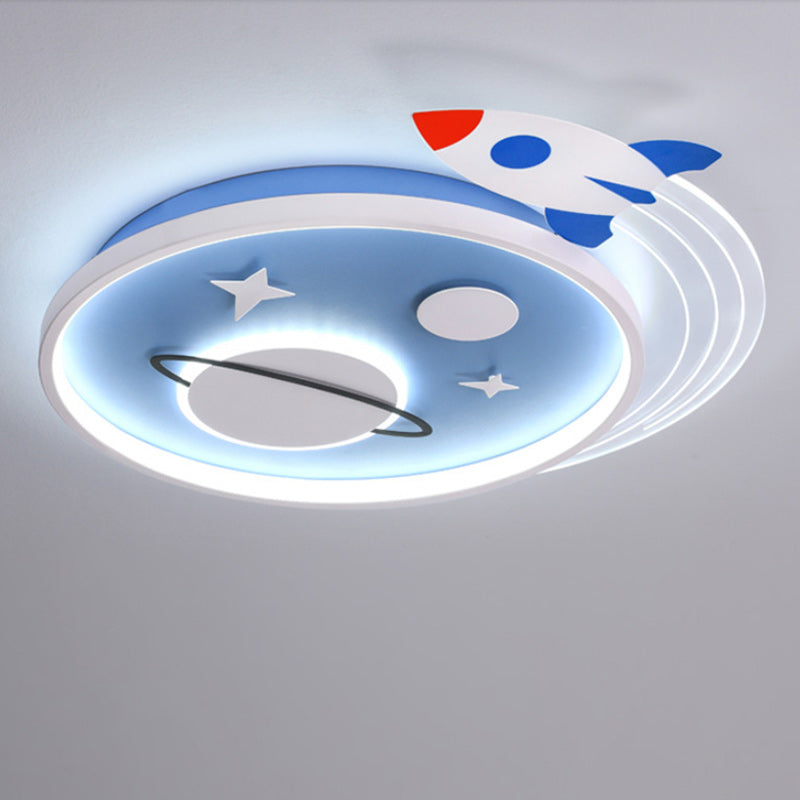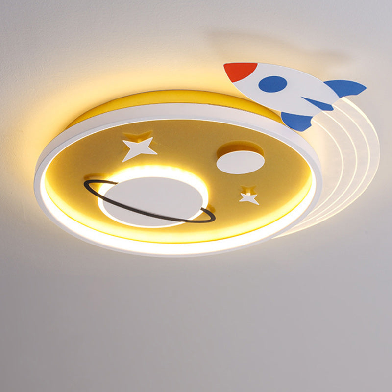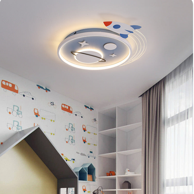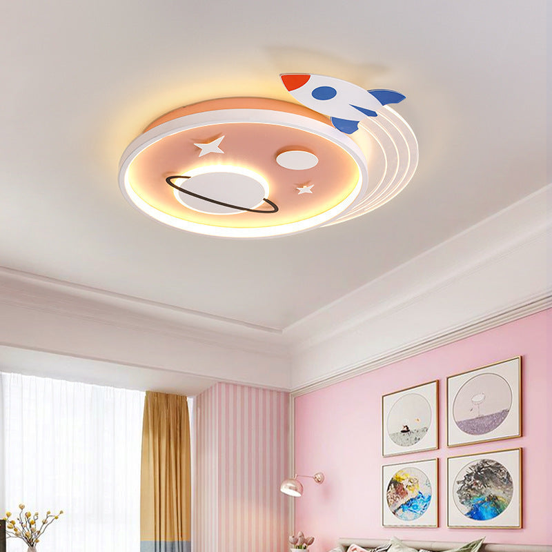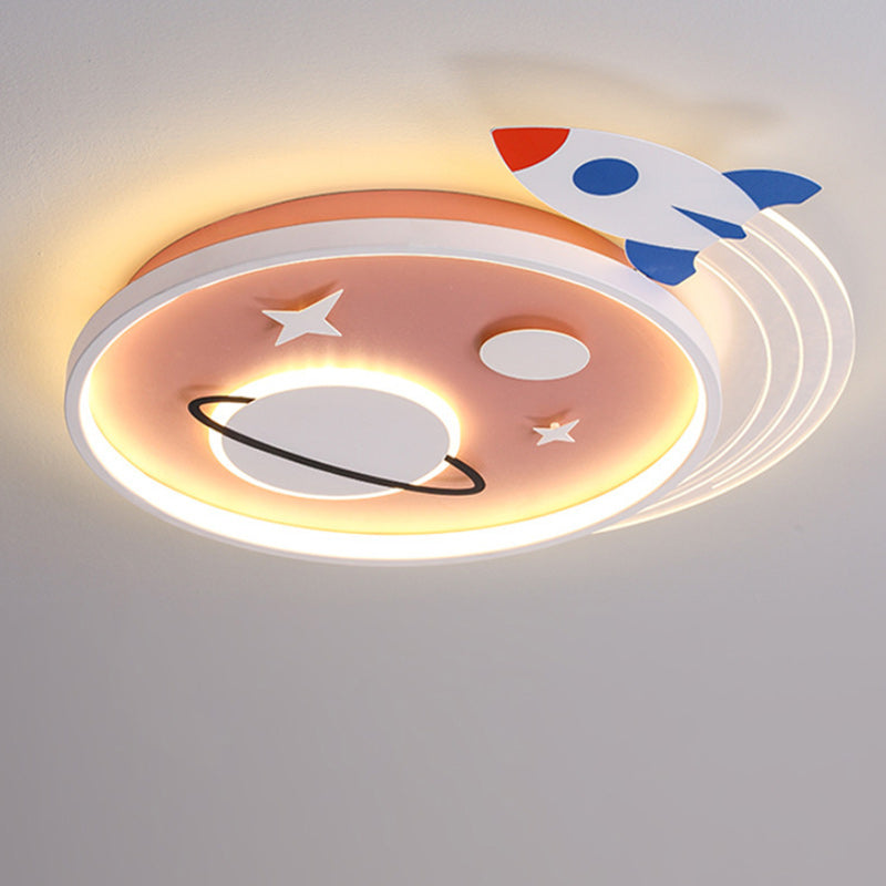 Contemporary Creative Cartoon Kids Rocket Planet Stars Round Iron Acrylic LED Flush Mount Ceiling Light For Bedroom