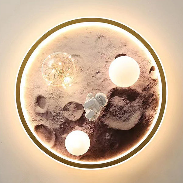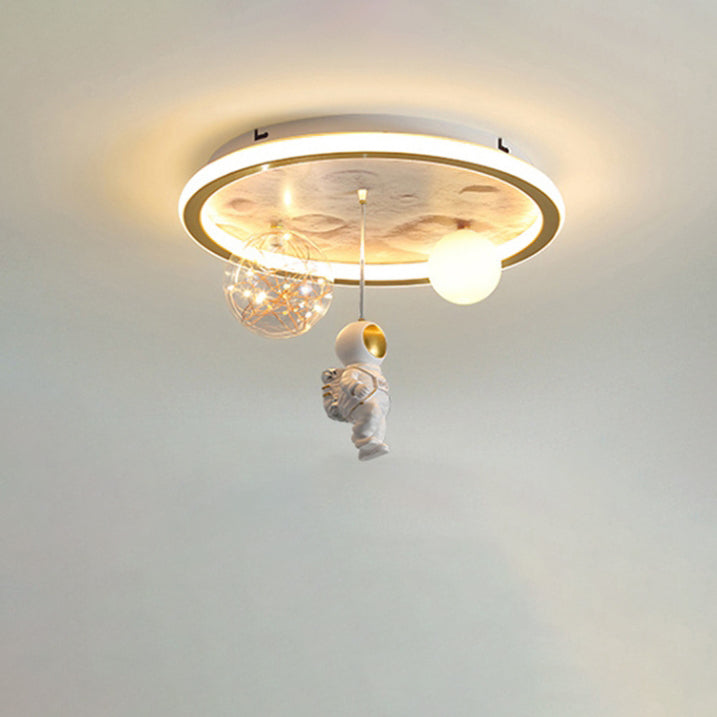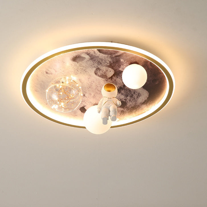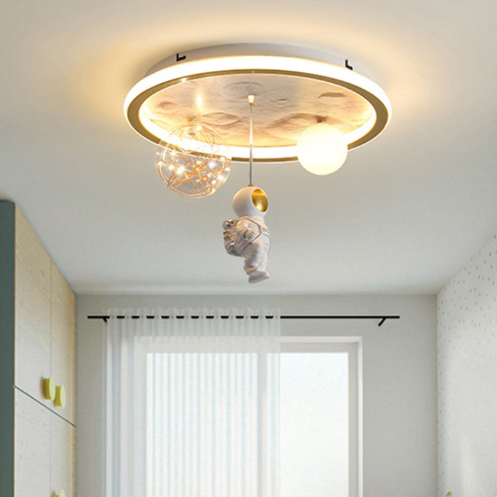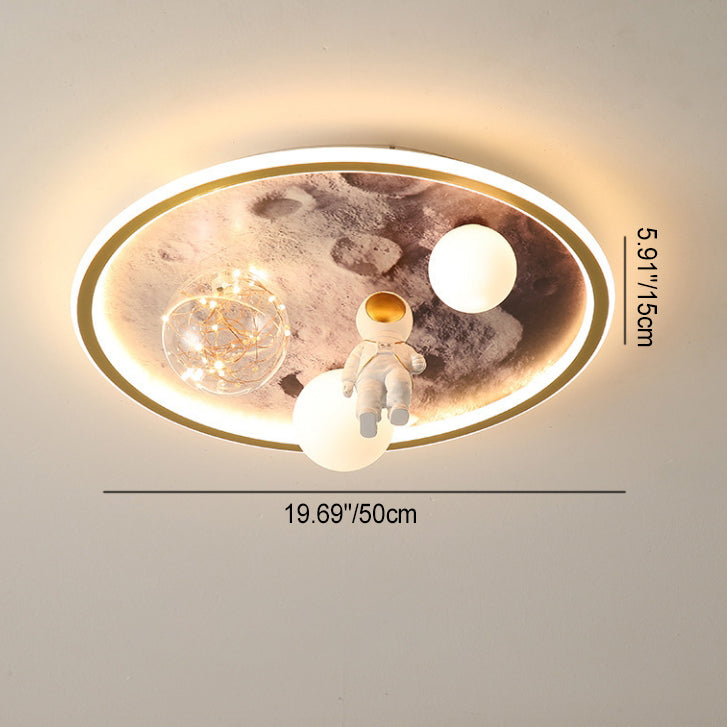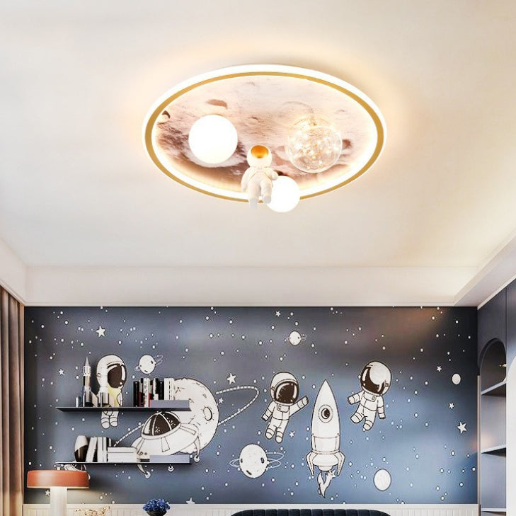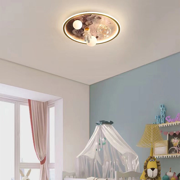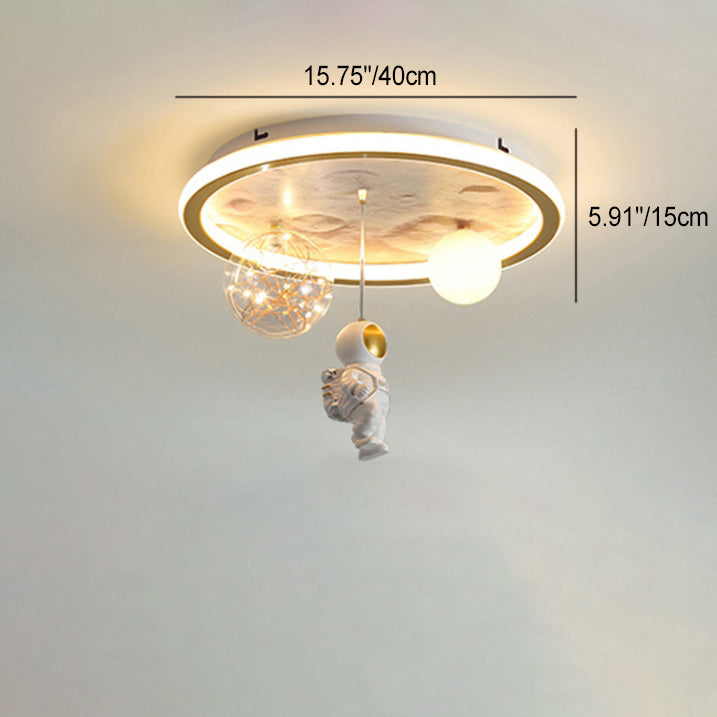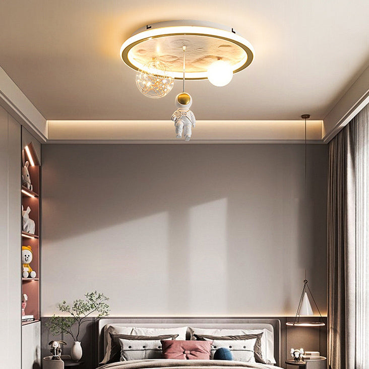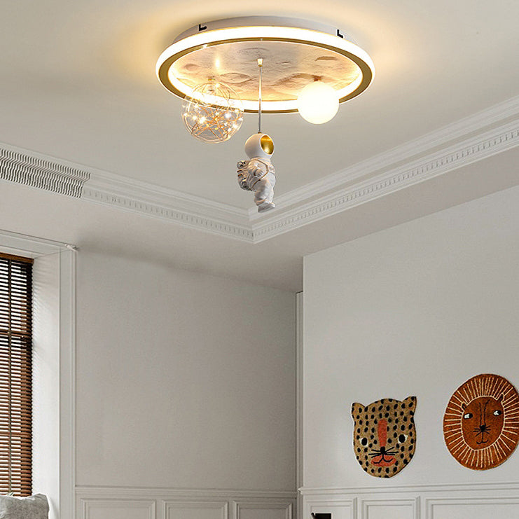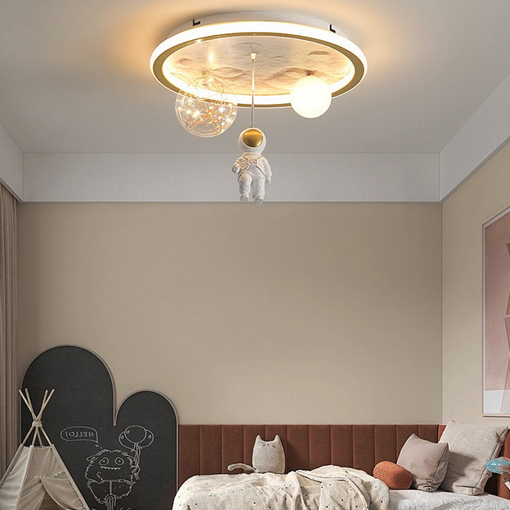 Contemporary Creative Cartoon Moon Astronaut Round Iron Resin Glass LED Kids Flush Mount Ceiling Light For Bedroom