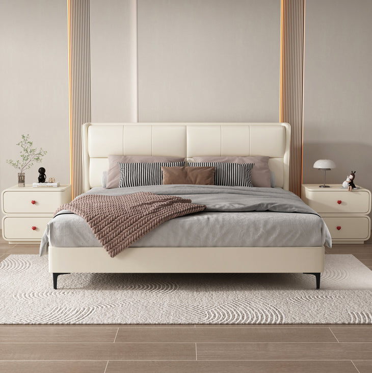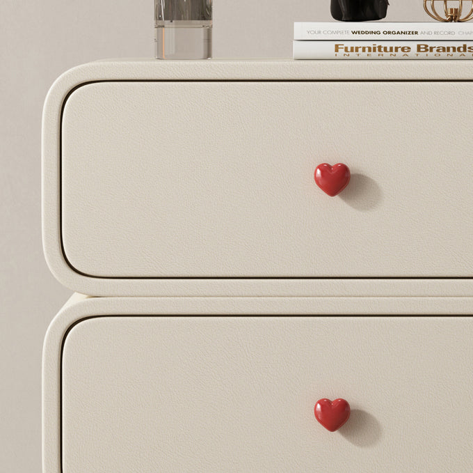 Featuring a sleek curved rectangular silhouette, this contemporary 2-drawer nightstand blends faux leather, solid wood, and durable metal for a soft yet modern aesthetic. Available in cream white, khaki, gray-blue, light gray, pink, green, and black, it's perfect for stylish bedrooms with safe rounded corners that prevent bumps.
