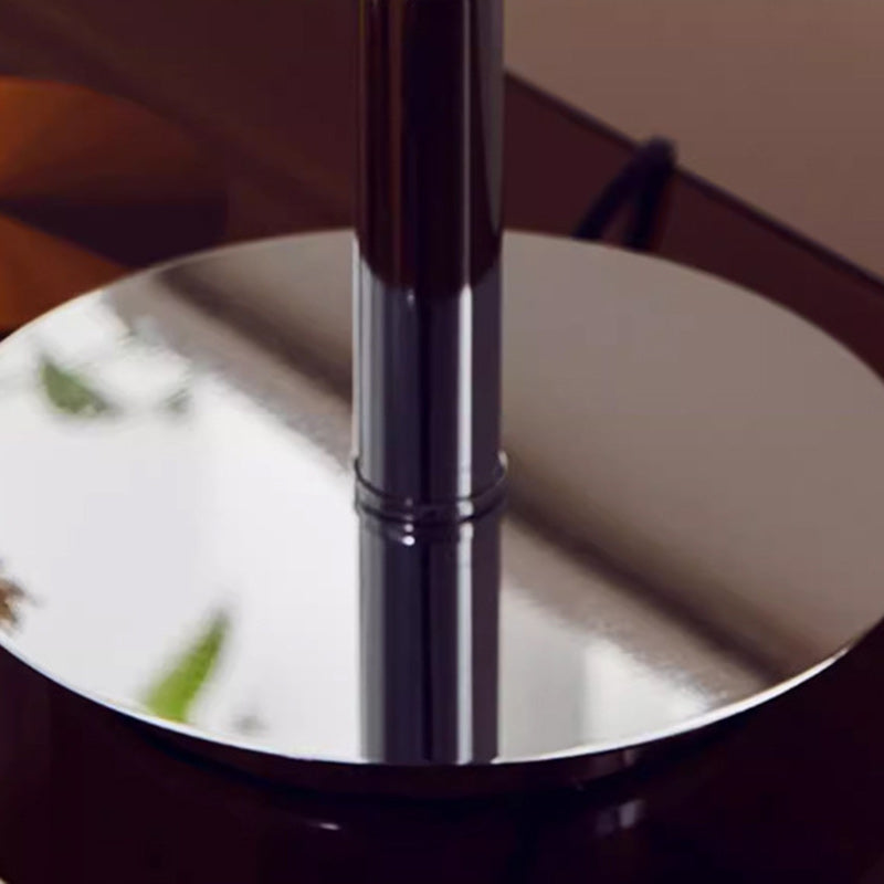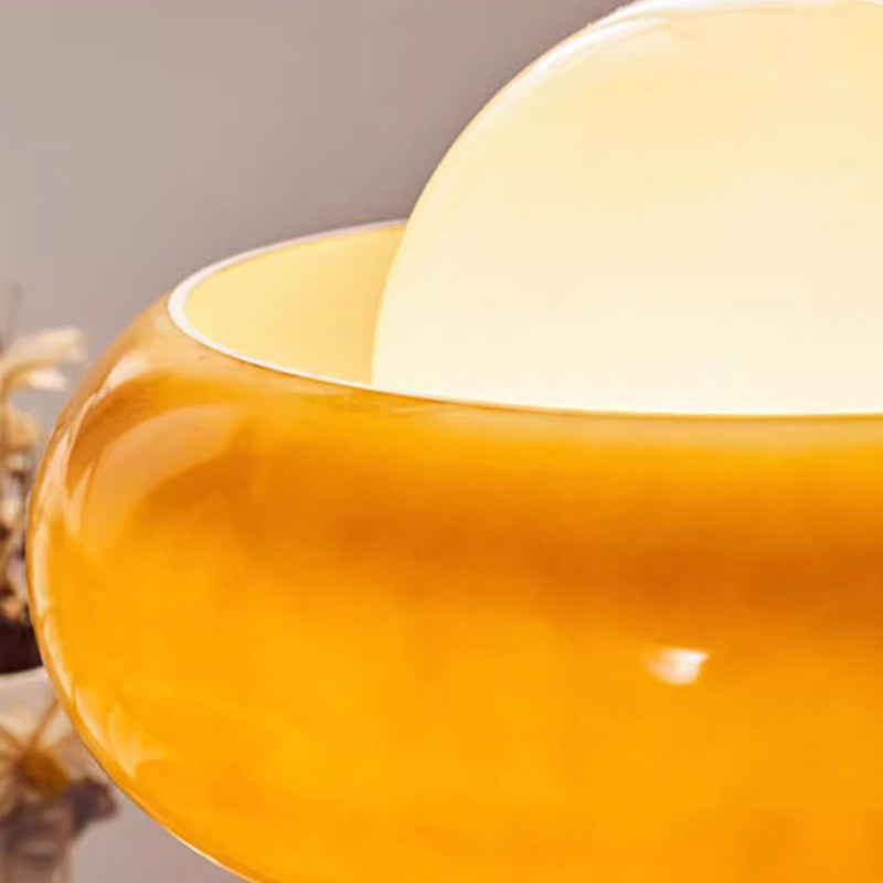 This contemporary creative table lamp features a unique egg-tart-inspired round glass shade paired with a sleek metal base in warm caramel tones. Equipped with an integrated LED, it casts soft, even illumination—perfect for adding an artistic accent and ambient glow to bedrooms or living rooms.