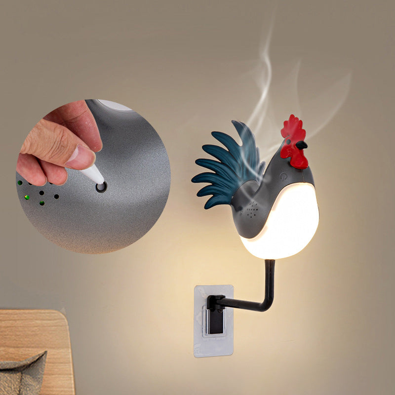 This USB rechargeable rooster-shaped LED wall night light features aroma diffusion, remote dimming, and three light modes in stylish colors like gray, yellow, and wood grain. With a 180° adjustable design, it brings both charm and functionality to modern bedrooms or hallways.