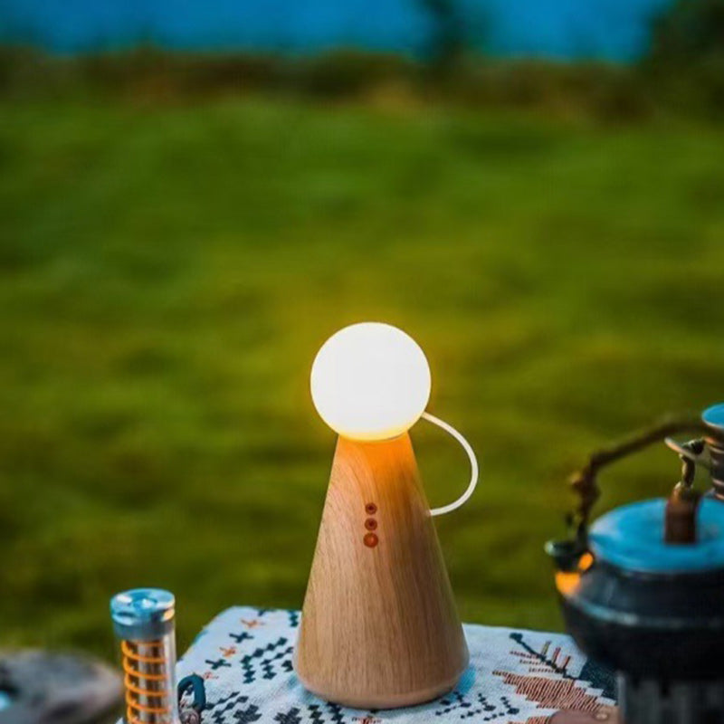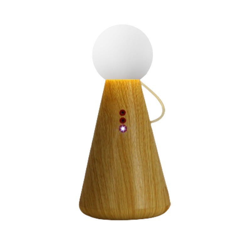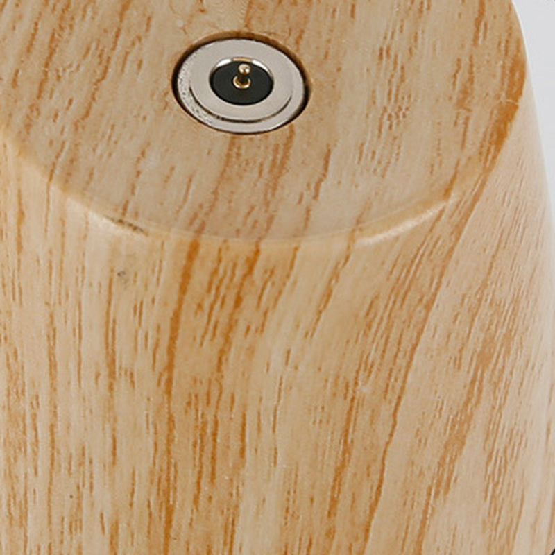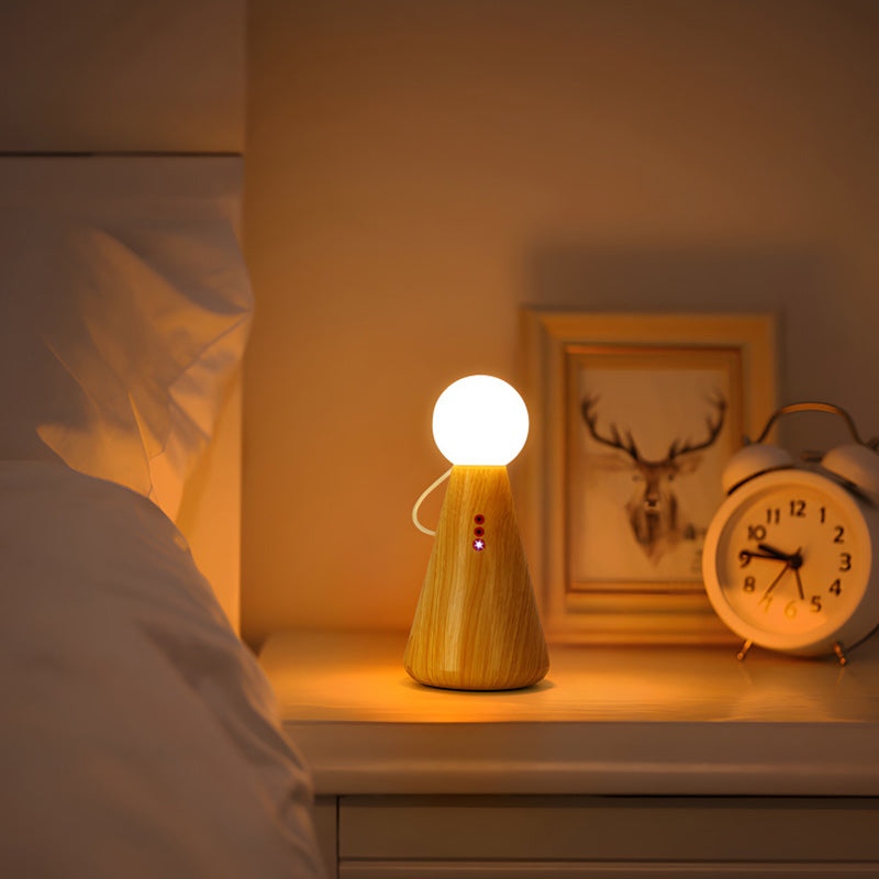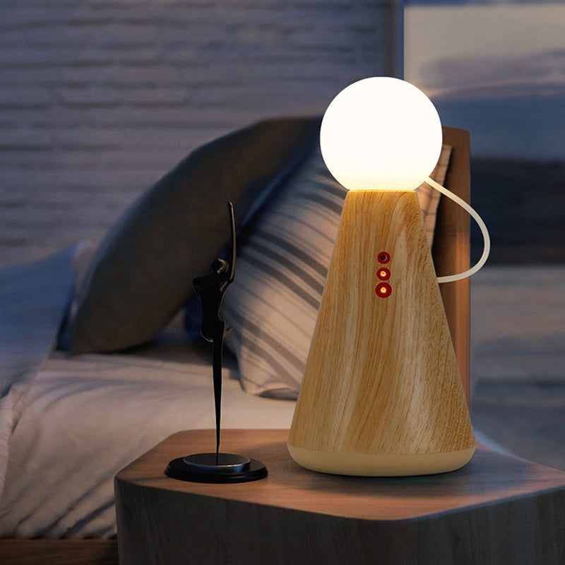 This contemporary creative table lamp features a charming figurine and round design, with a magnetic interactive switch for easy operation. Simply place the bulb on the base to turn it on. Made from plastic and silicone, it offers LED lighting with a rechargeable function and a battery level display. The lamp comes in a natural wood color and is perfect for bedside use, adding a unique touch to your bedroom or living space.