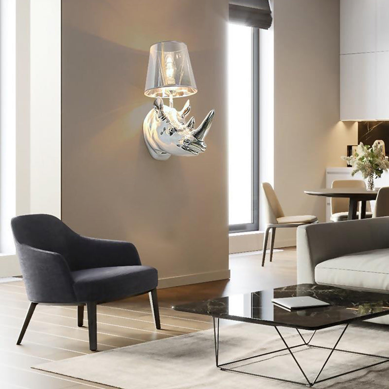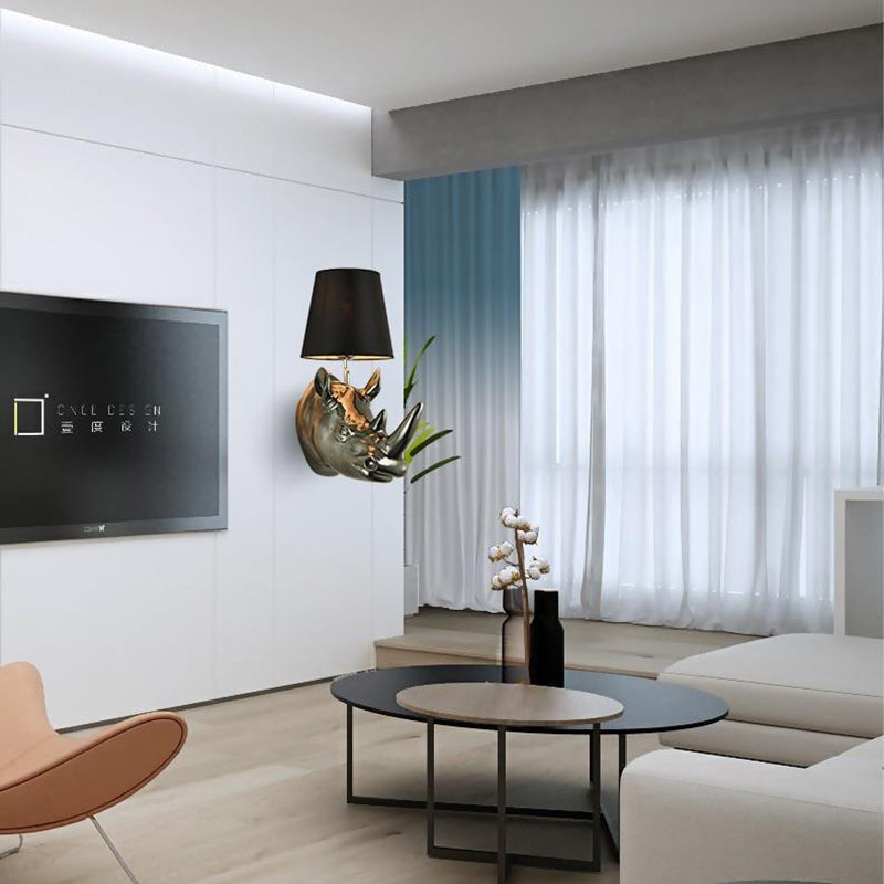 Enhance your bedroom with this Contemporary Creative Rhino wall sconce lamp, crafted from resin and fabric with two finish options—durable spray-painted (black or white) or elegant electroplated (silver, gold, or pearl black). Its single-light design provides warm, ambient illumination, ideal for bedside reading or creating a modern focal point.
