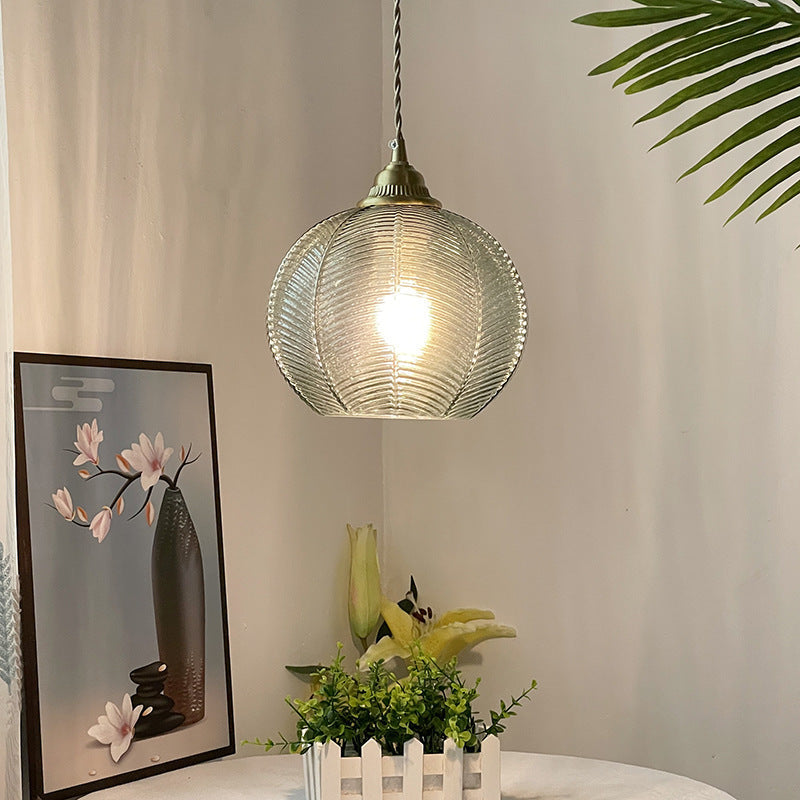 Contemporary Creative Round All Brass Striped Glass 1-Light Pendant Light For Living Room