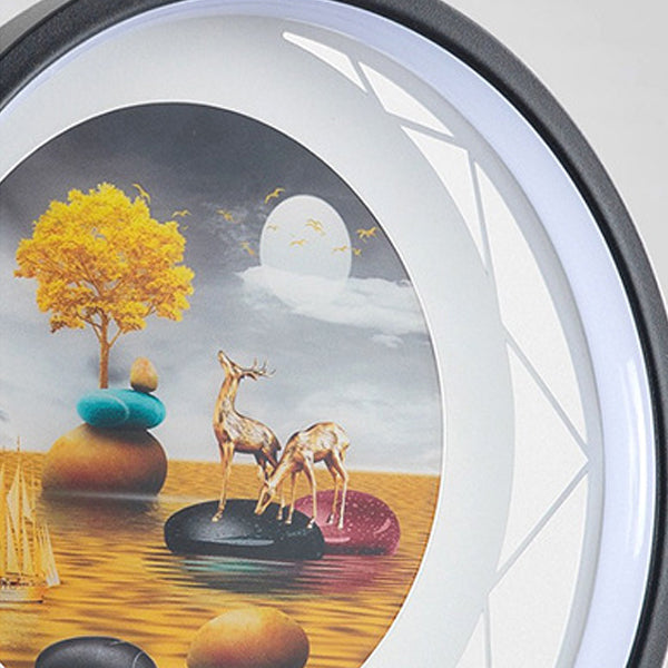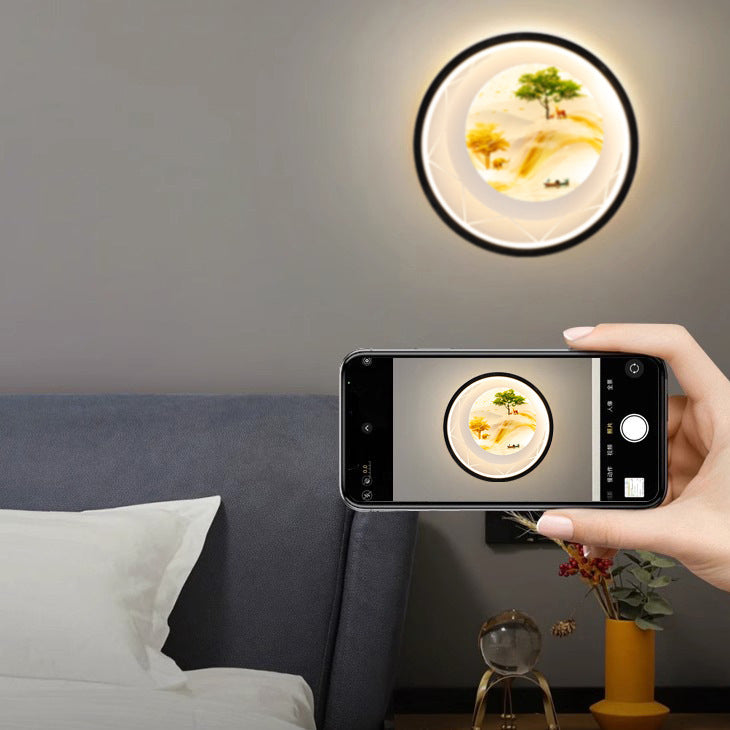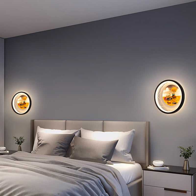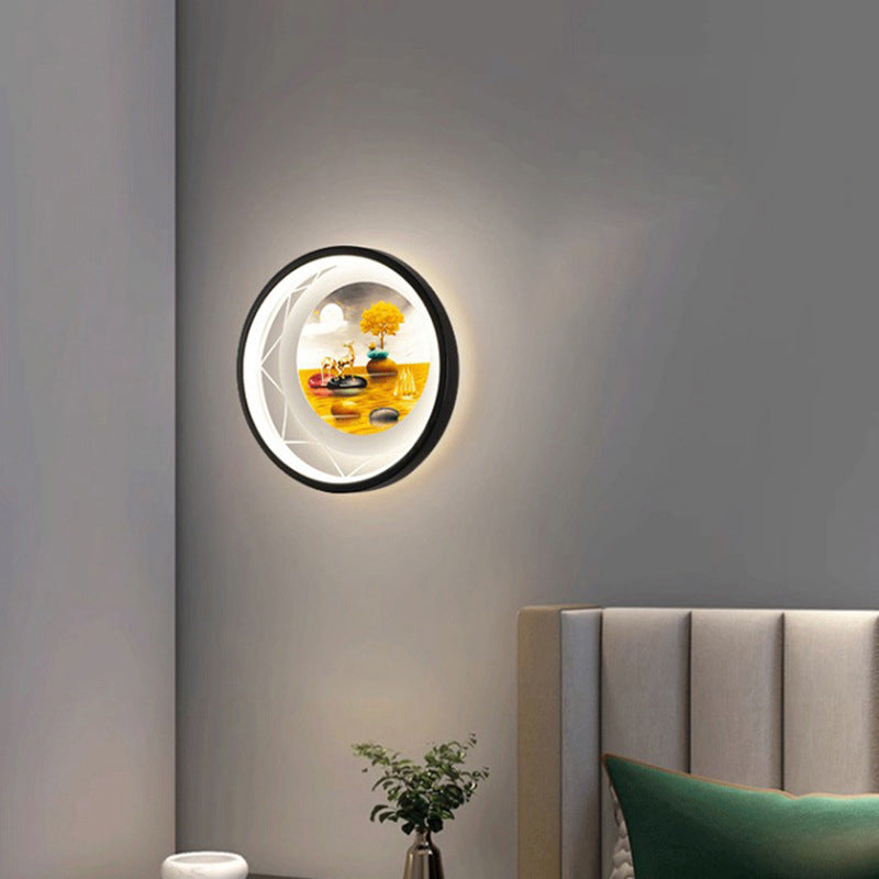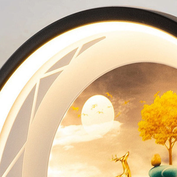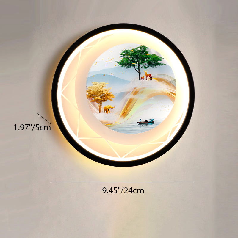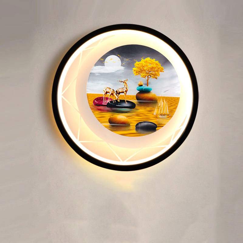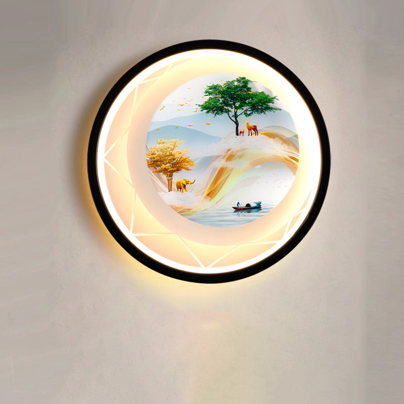 Contemporary Creative Round Peacock Deer Tree Landscape Painting Iron Acrylic LED Wall Sconce Lamp For Bedroom