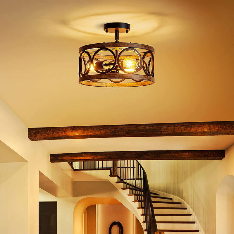 Contemporary Industrial Round Hollowed Out Wood Grain Iron 3-Light Semi-Flush Mount Ceiling Light For Living Room