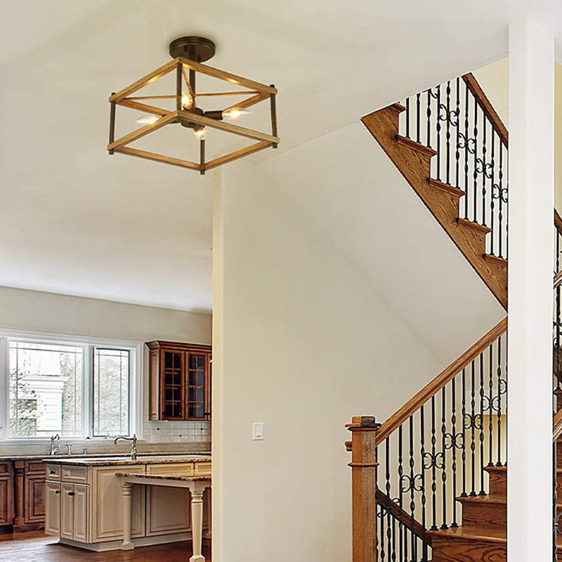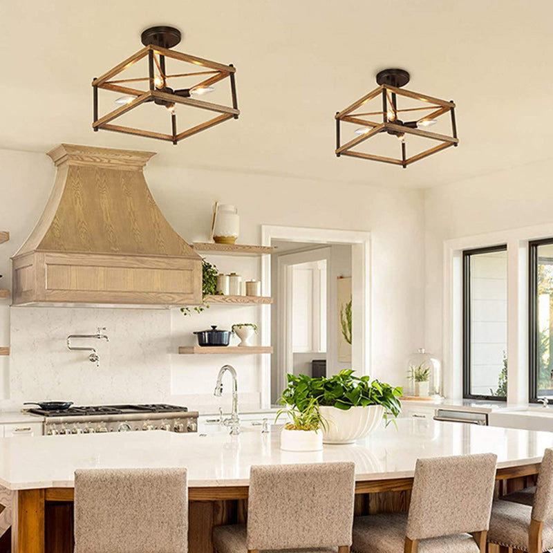 Contemporary Industrial Round Square Geometric Iron Wood Frame 2/4 Light Semi-Flush Mount Ceiling Light For Living Room