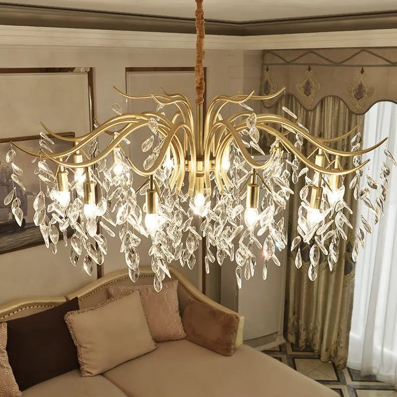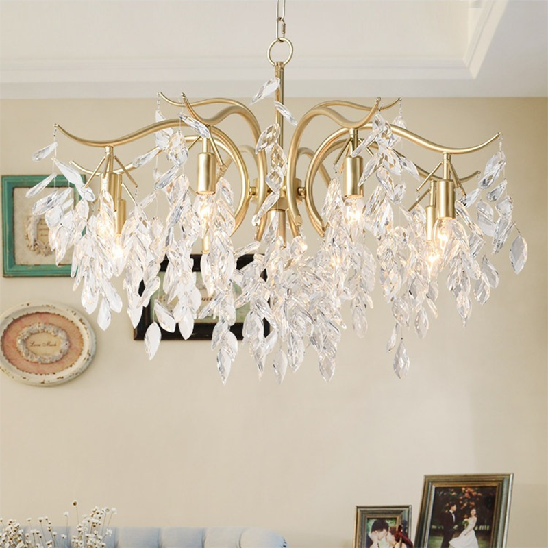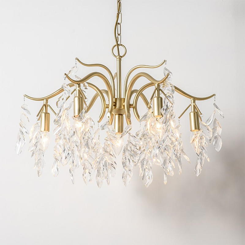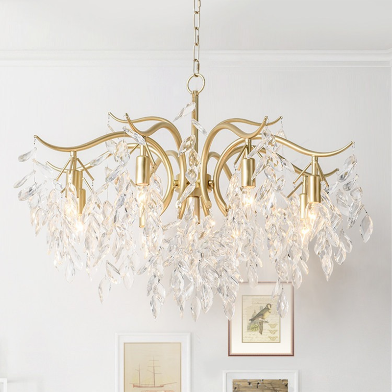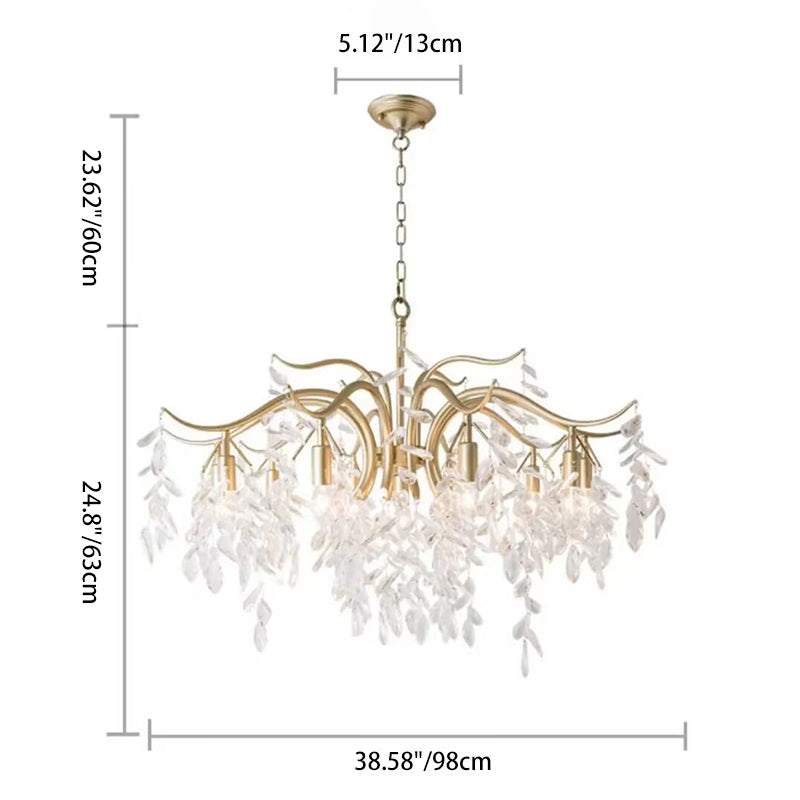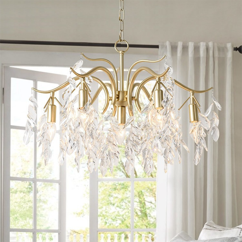 Add a sculptural statement to your space with this gold-tone contemporary luxury chandelier, featuring a graceful branch and leaf design crafted from iron and sparkling crystal. Available in 7, 9, or 11-light options, it delivers high visual impact—ideal for modern living rooms, bedrooms, or upscale interiors.