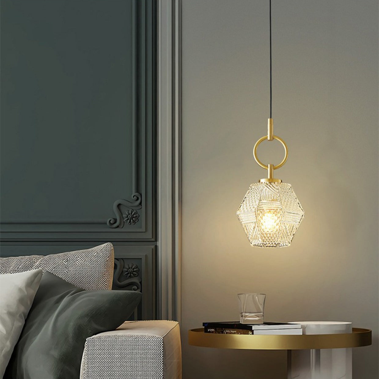 Contemporary Nordic Dome Polygonal Cube Transparent Glass Lampshade Copper 1 - Light Pendant Light For Bedside
