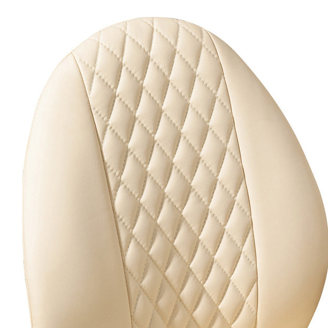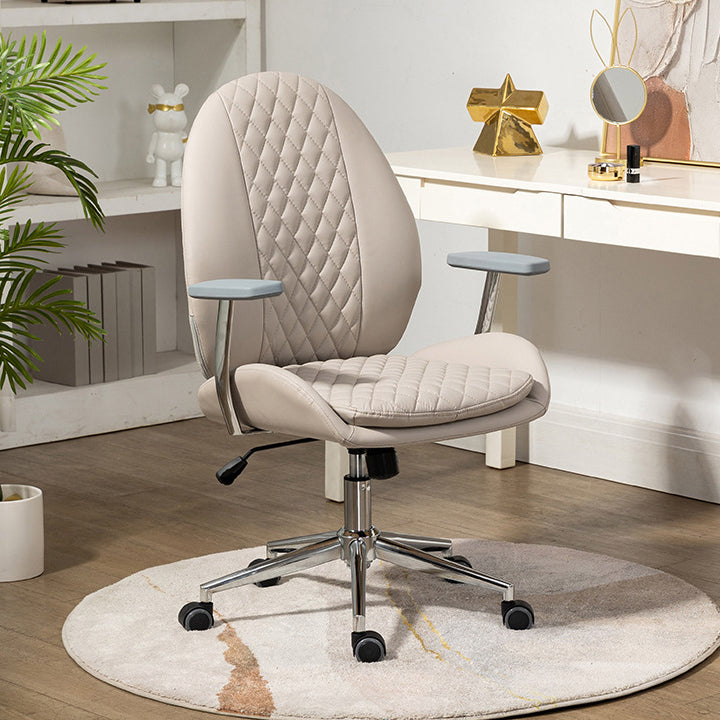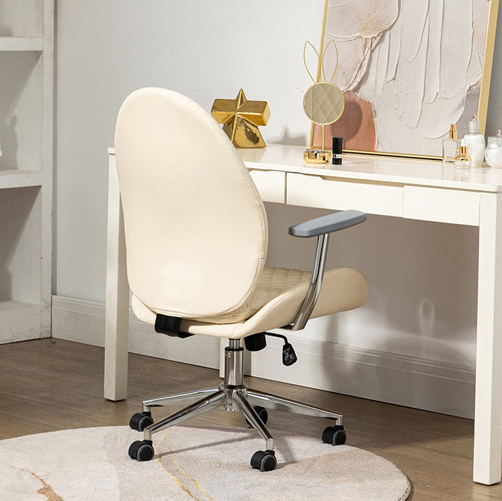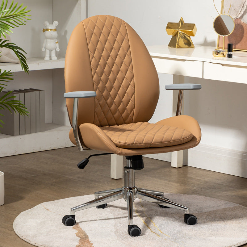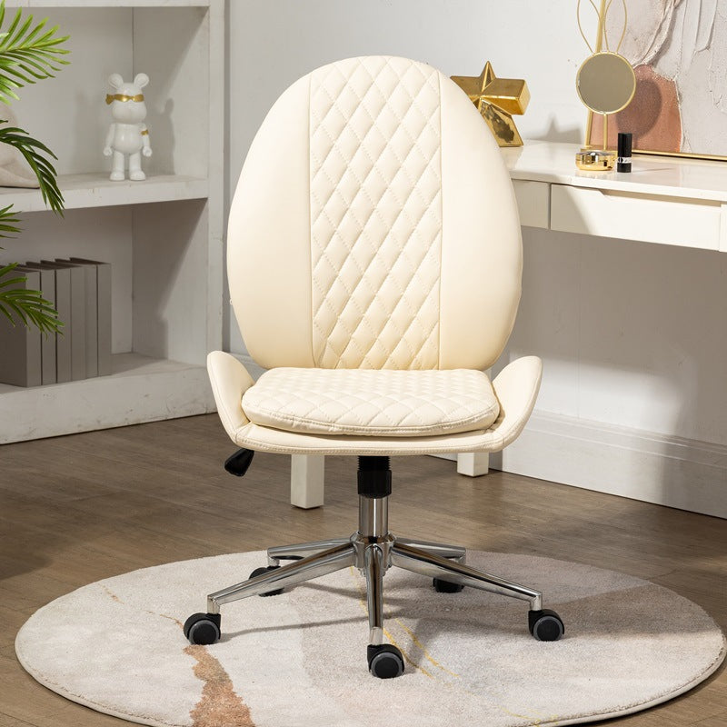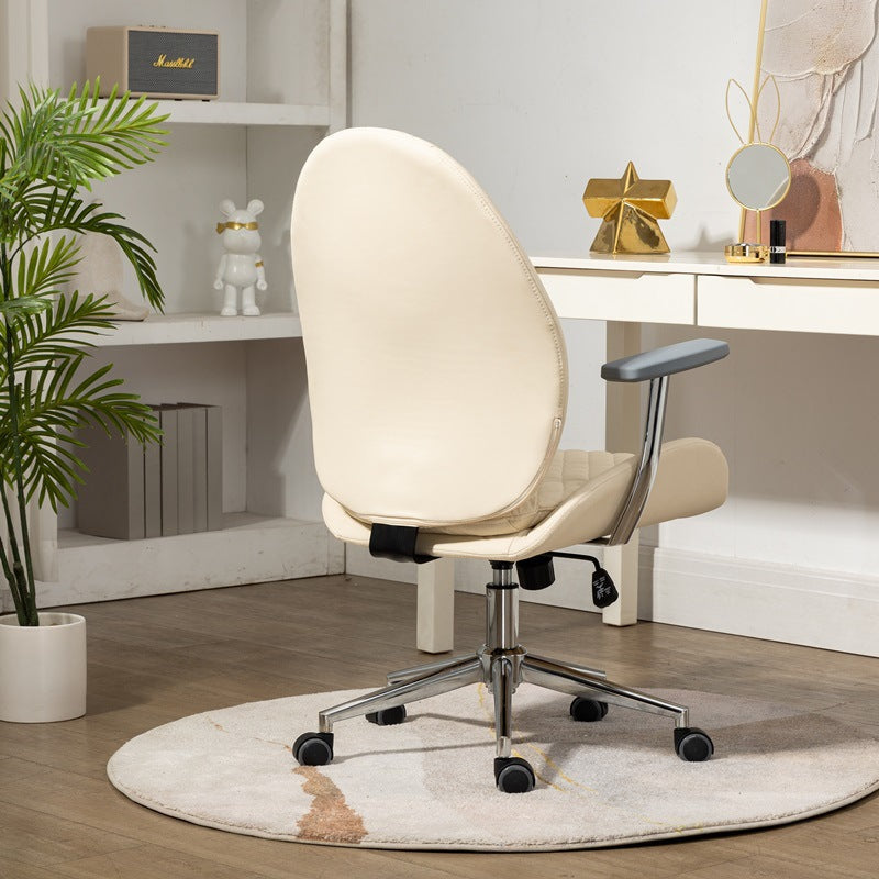 This Nordic-style vanity chair features a unique scallop and oval design with PU leather upholstery and soft foam padding for all-day comfort. Equipped with a backrest, armrests, 360° swivel, height adjustment, and smooth mobility, it’s perfect for bedrooms, offices, or studies. Available in brown, cream white, and light gray.
