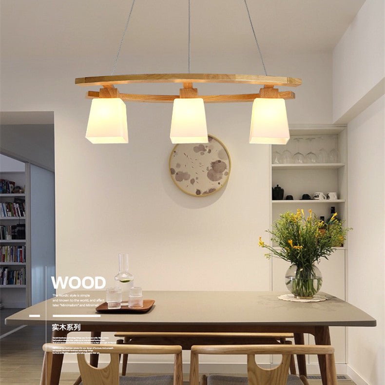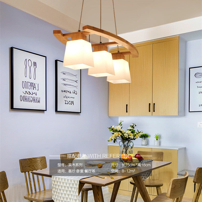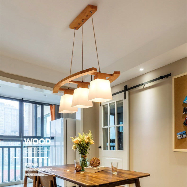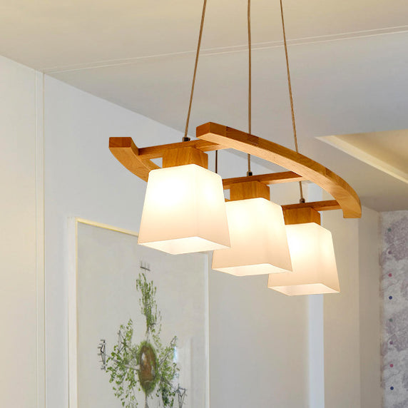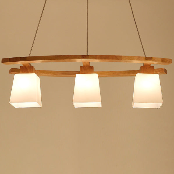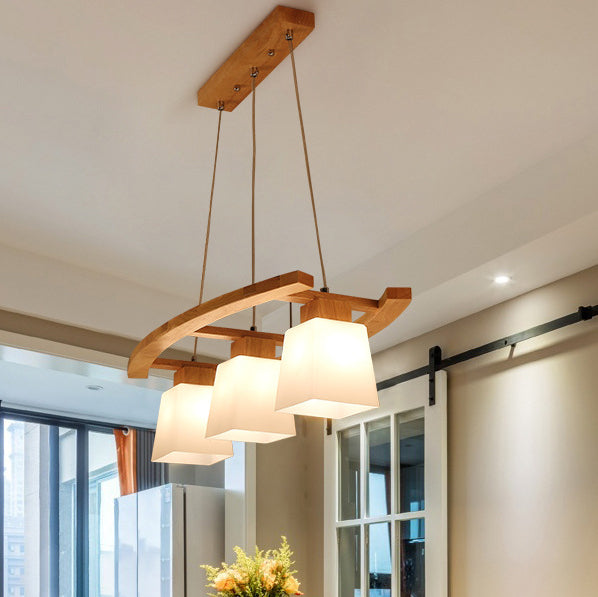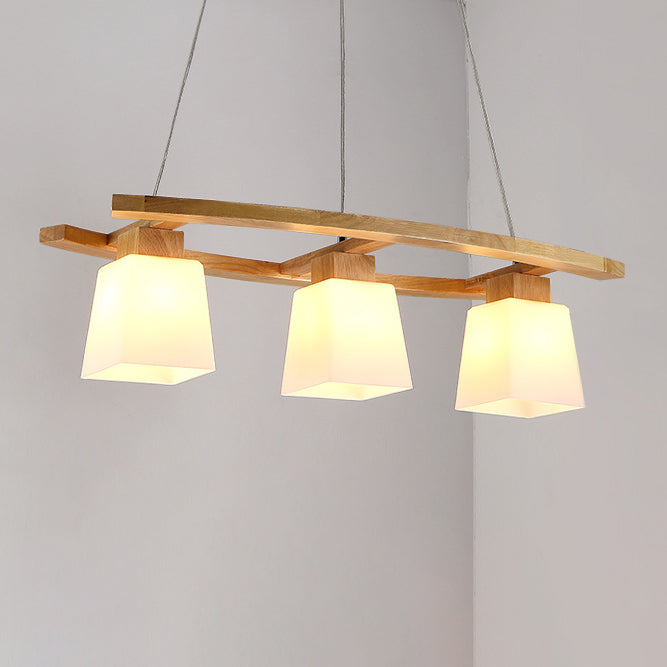 Contemporary Nordic Rectangular Trapezoidal Glass Shade Wooden Frame 3-Light Island Light Chandelier For Dining Room