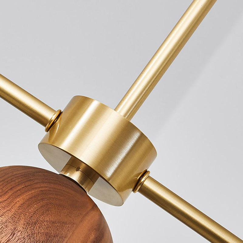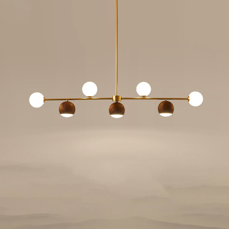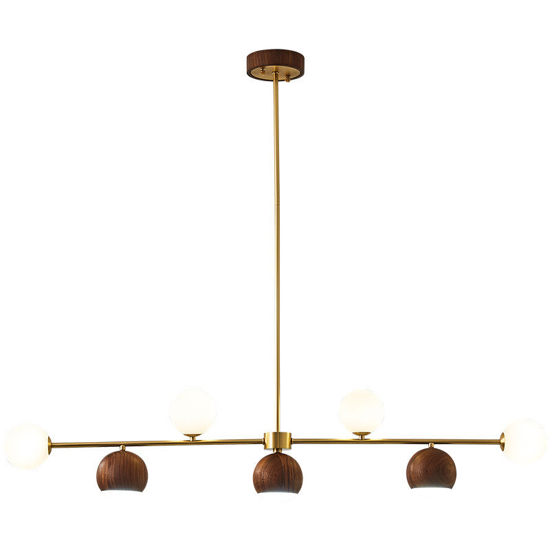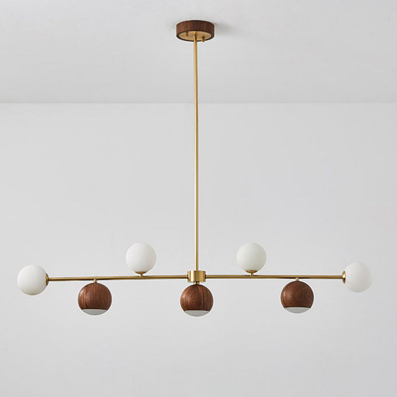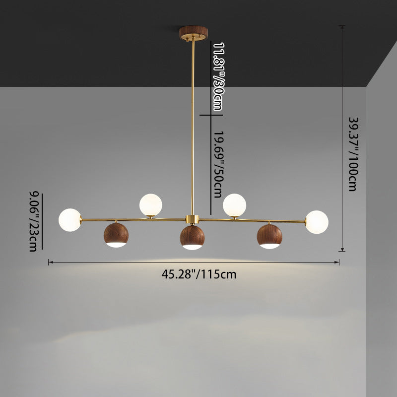 This modern Nordic chandelier features a sleek walnut wood frame, warm brass details, and seven ball shades—four upper globes house G9 bulbs for focused illumination, while three lower LED-lit spheres add ambient glow. A perfect island light for dining rooms seeking minimalist elegance with layered lighting design.