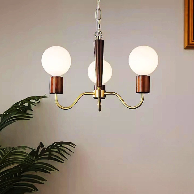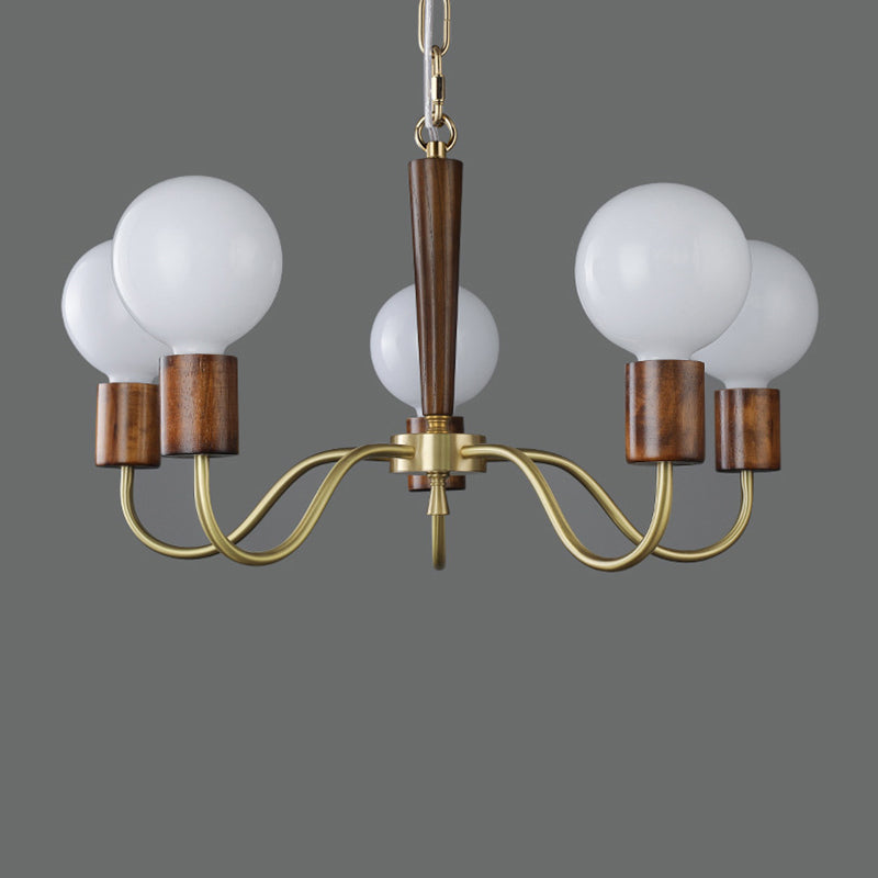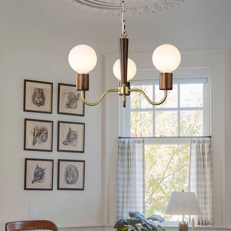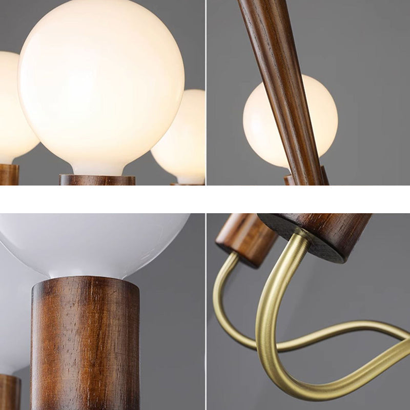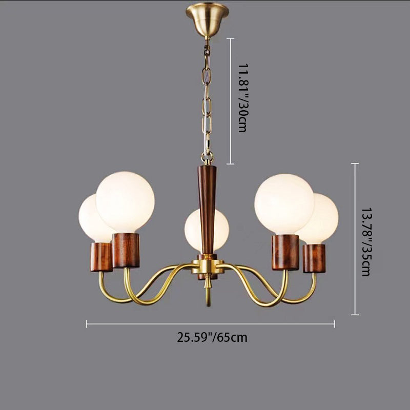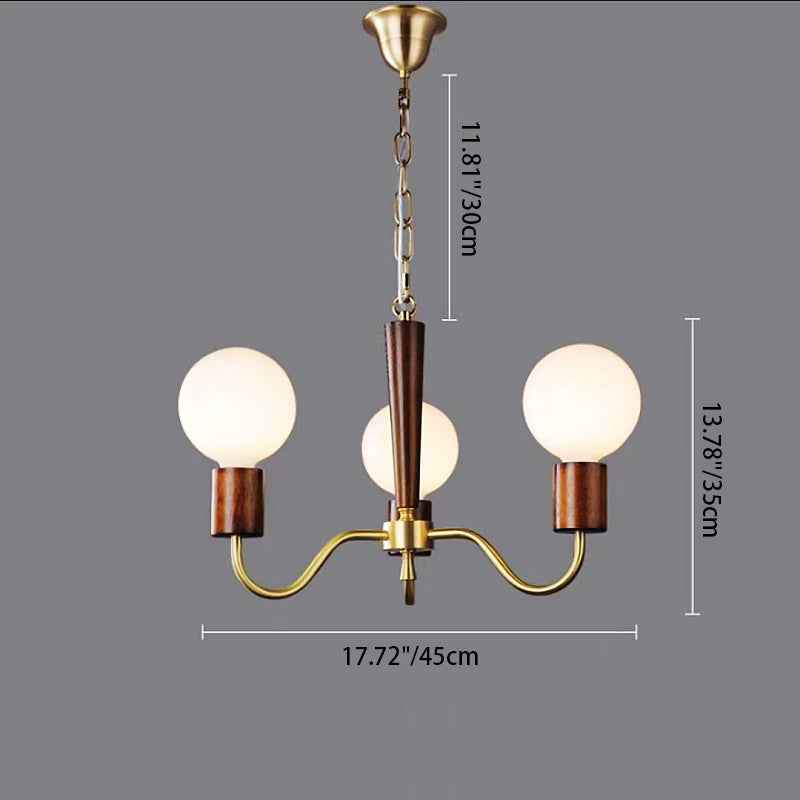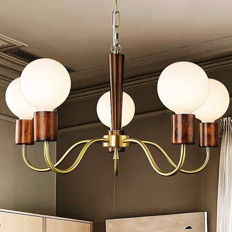 Contemporary Retro Curved Rod Branch Globe Wooden Copper Frame Glass Shade 3/5 Light Chandelier For Living Room