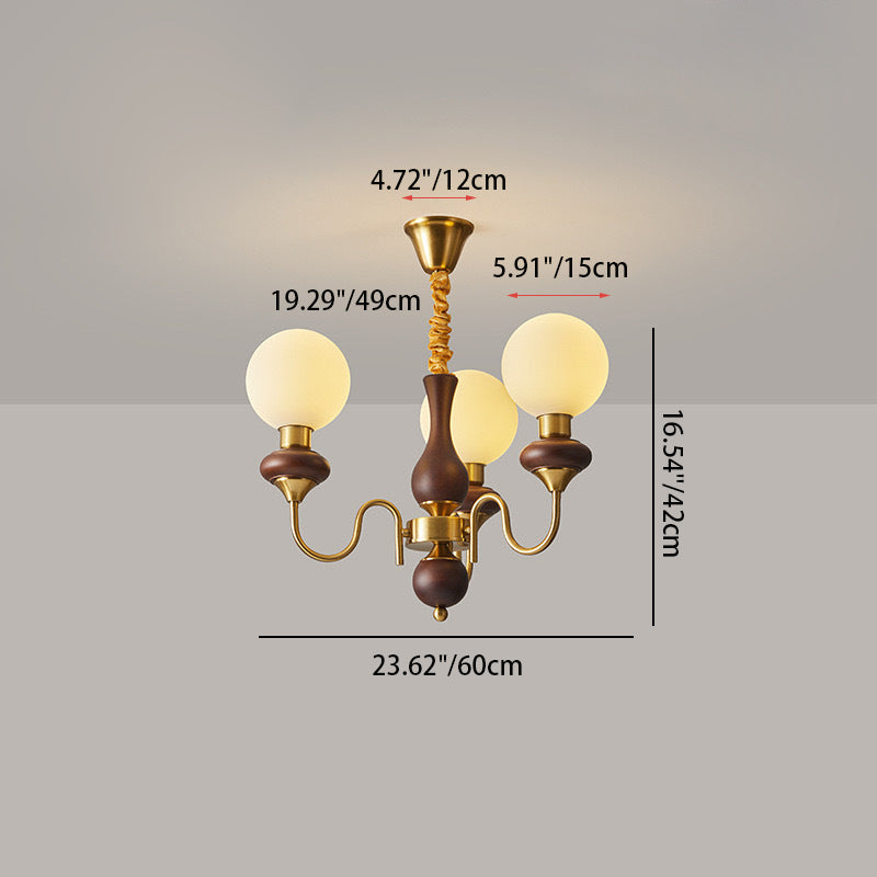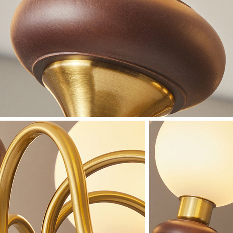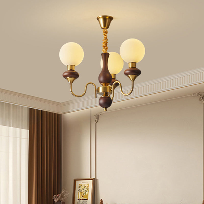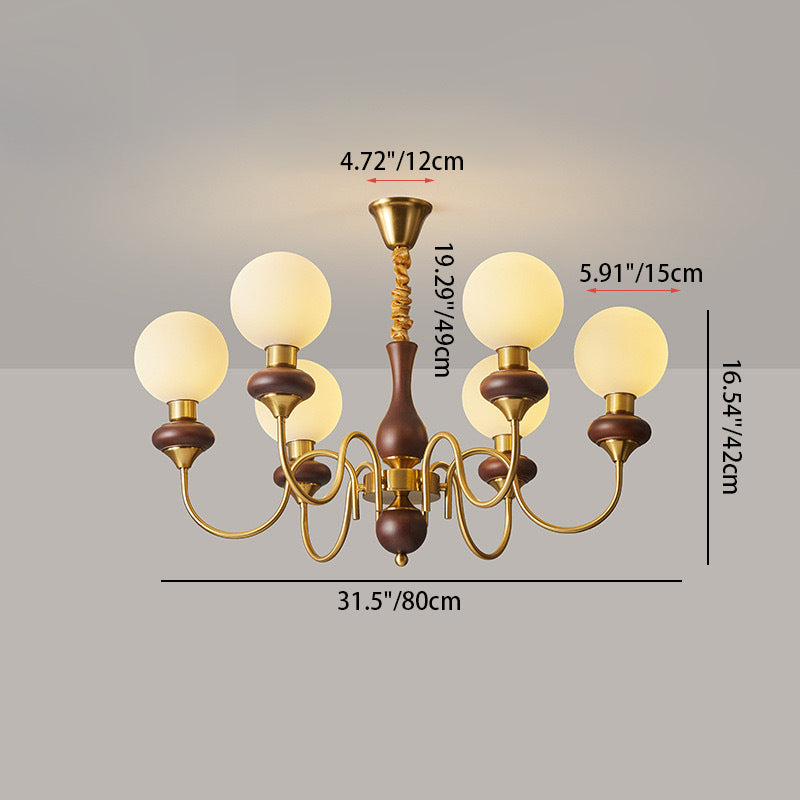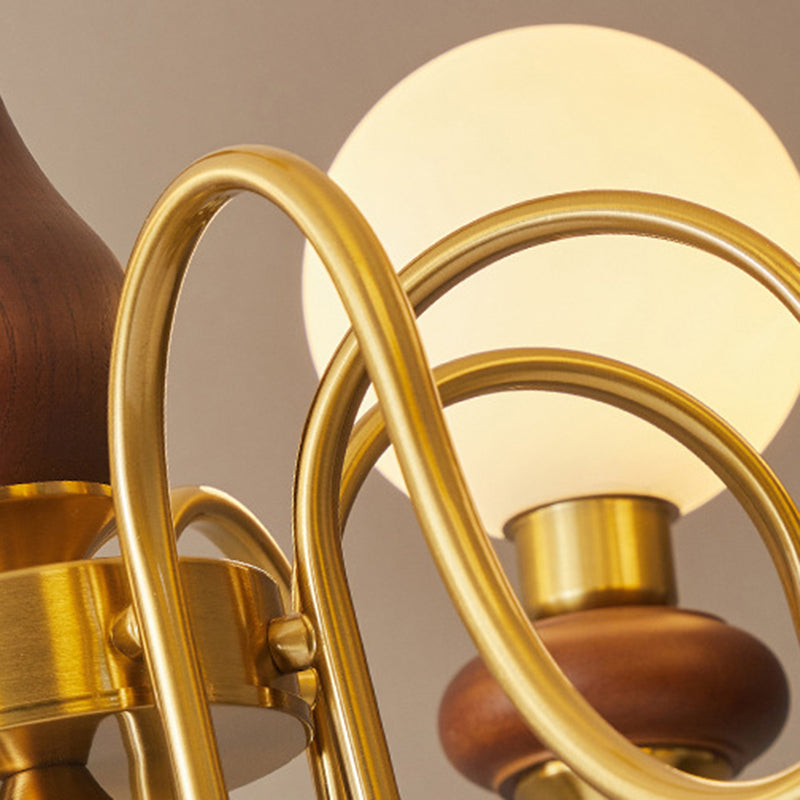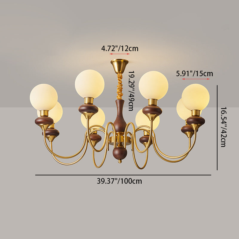 Contemporary Retro Curved Rod Candelabra Round Globe Iron Wood Frame Glass Shade 3/6/8 Light Chandelier For Living Room